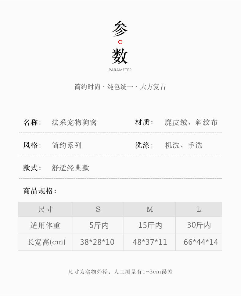 【S小号5斤内可用,L大号30斤内用】经典简约风格,鹿皮绒+高回弹PP棉,耐磨耐用,舒适柔软,冬天保暖。宠物用品。