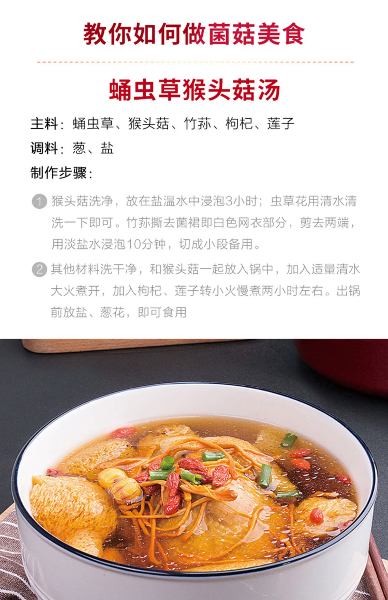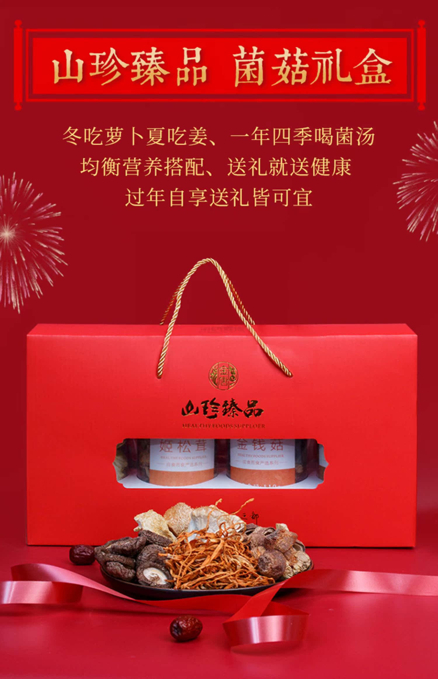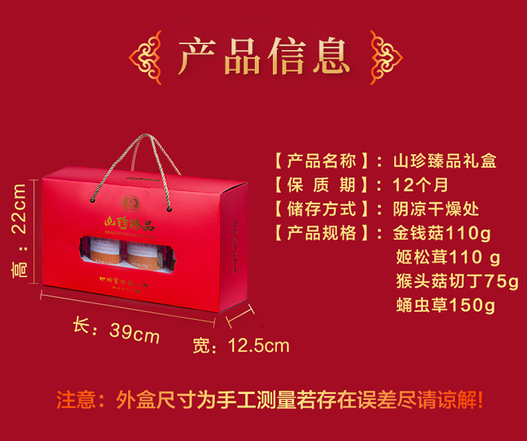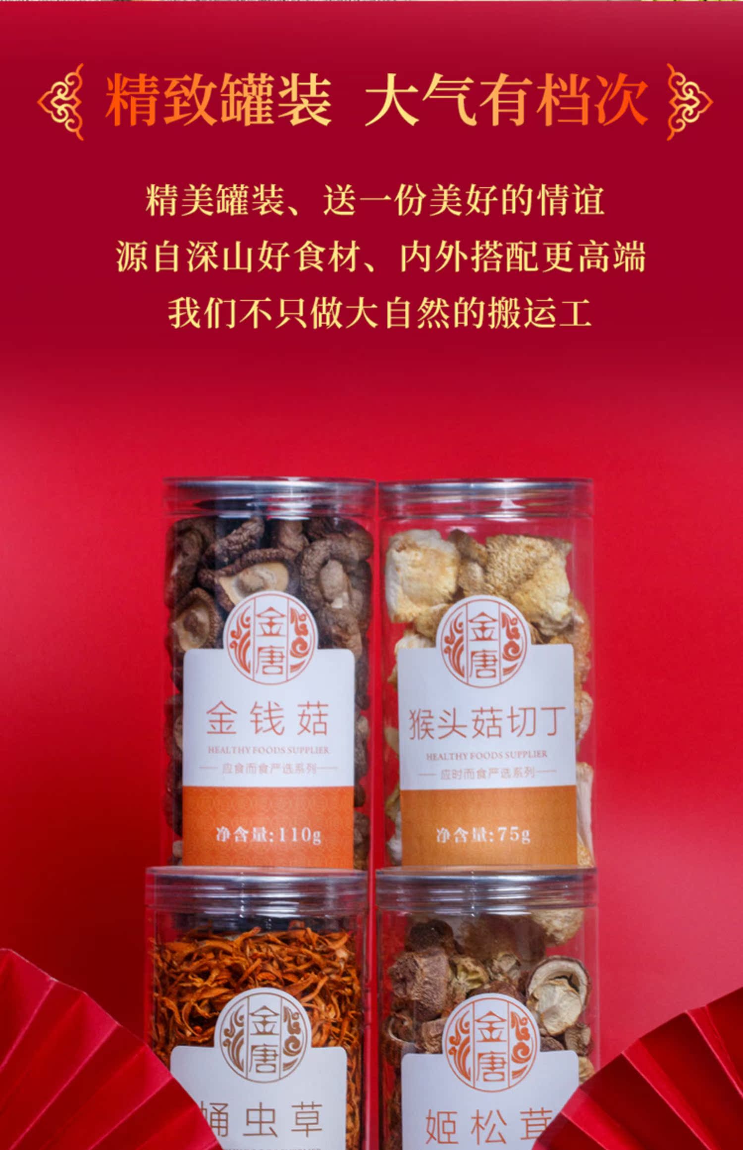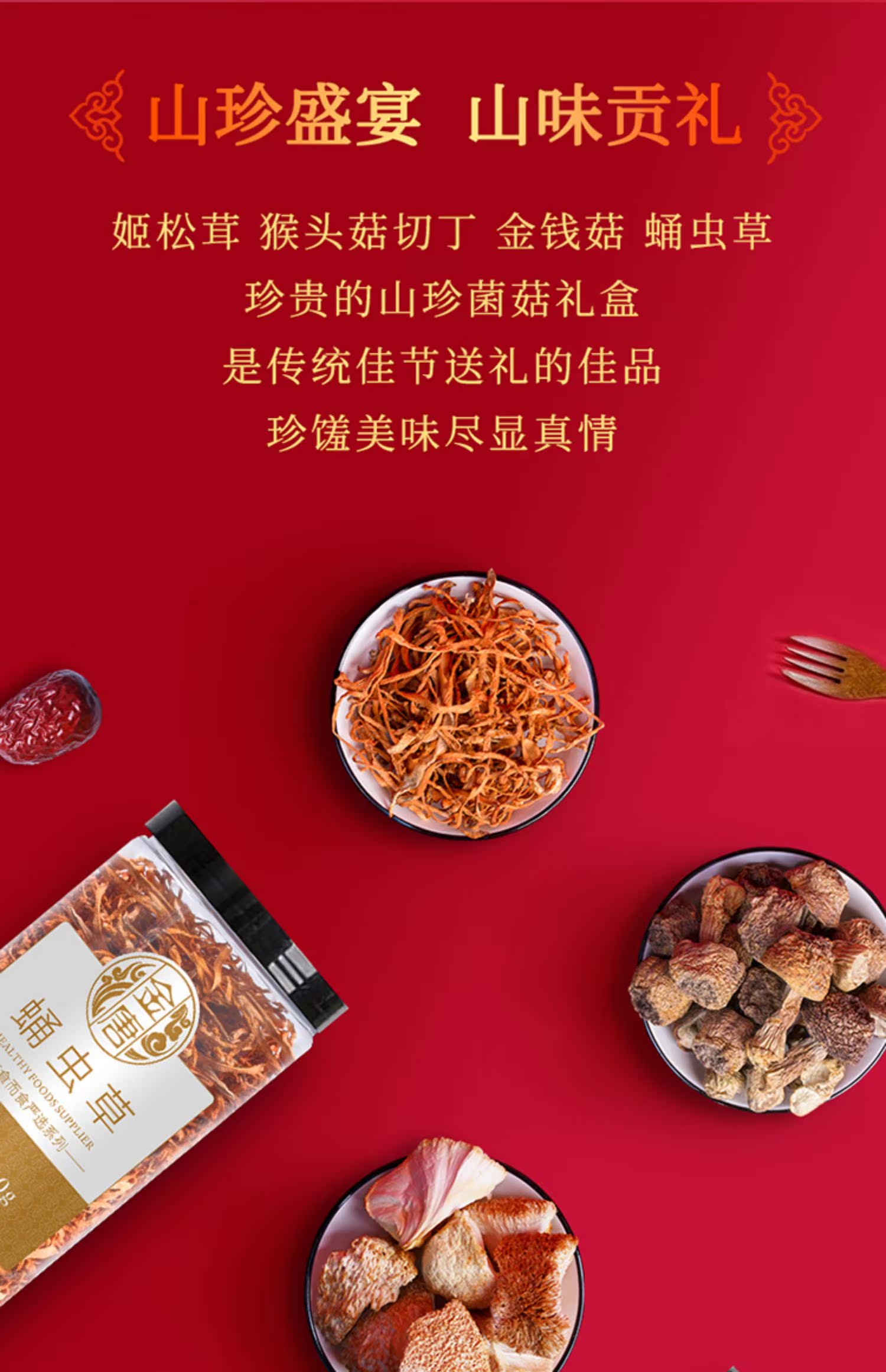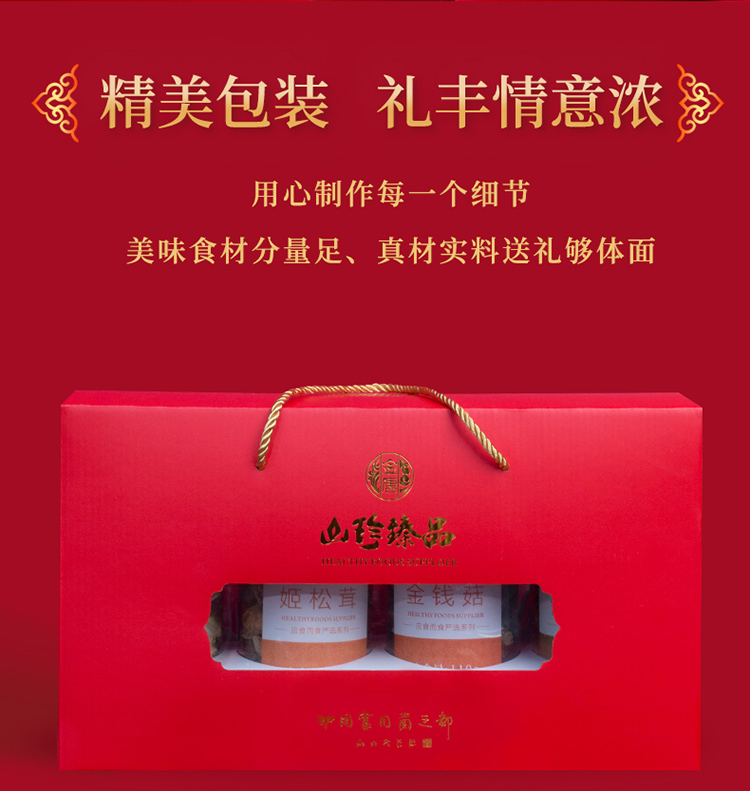 甄选大山里的美味,名贵山珍,蛹虫草150g,金钱菇110g,姬松茸110g,猴头菇75g,送礼就送这个只要119元,年货上档次真滋补,养生又健康!