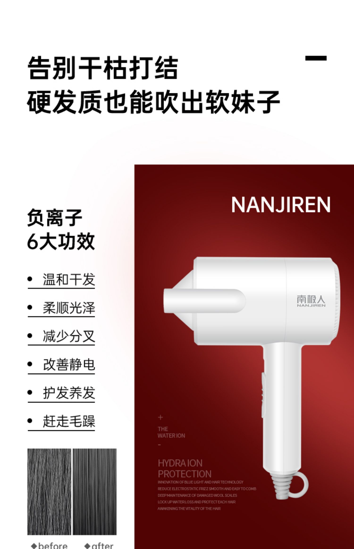 【赠运费险】大牌南极人风筒强力来袭!高科技恒温离子吹风不伤发!小巧精致,3c认证~劵后19.9元就能带走~