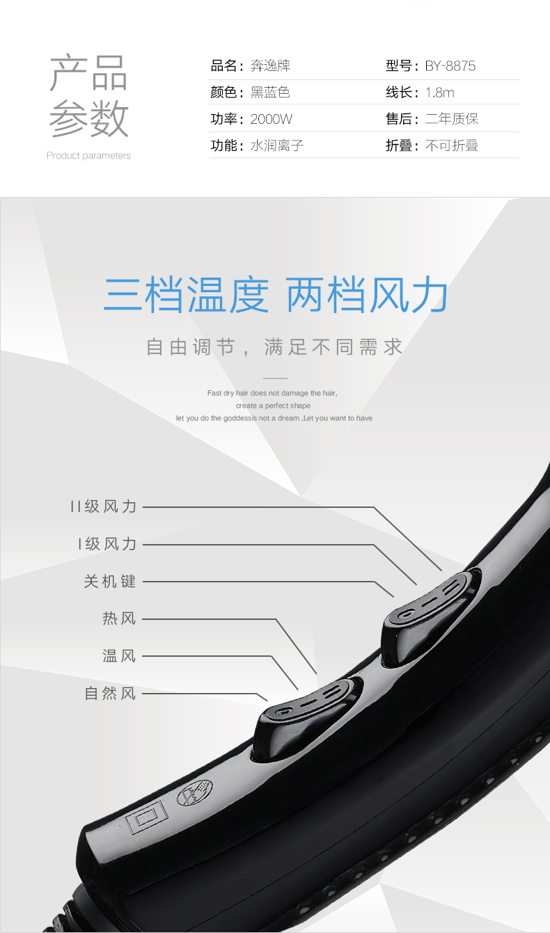 【4.8高分,两年质保】2000W大功率,三档温度,两档风力可调节~恒温护发,细微水离子,不伤发,可拆卸后盖方便清洗,从此拒绝干枯,让头发柔顺闪耀。