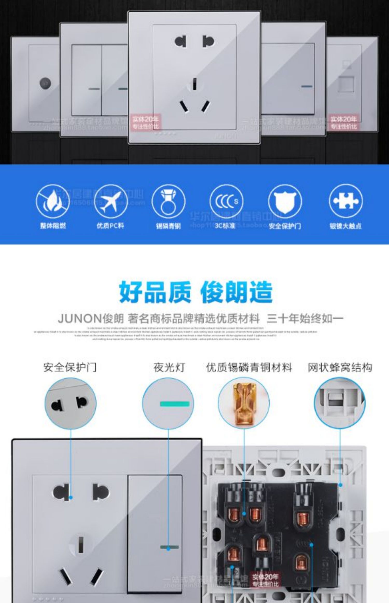 俊朗面板采用德国拜耳进口阻燃PC,手感顺滑耐磨耐刮,洁白光泽,具有良好的柔韧性,好品质俊朗造!