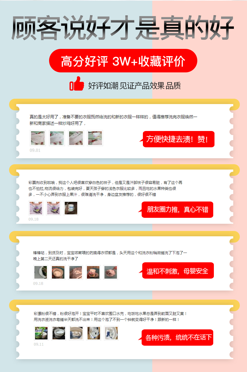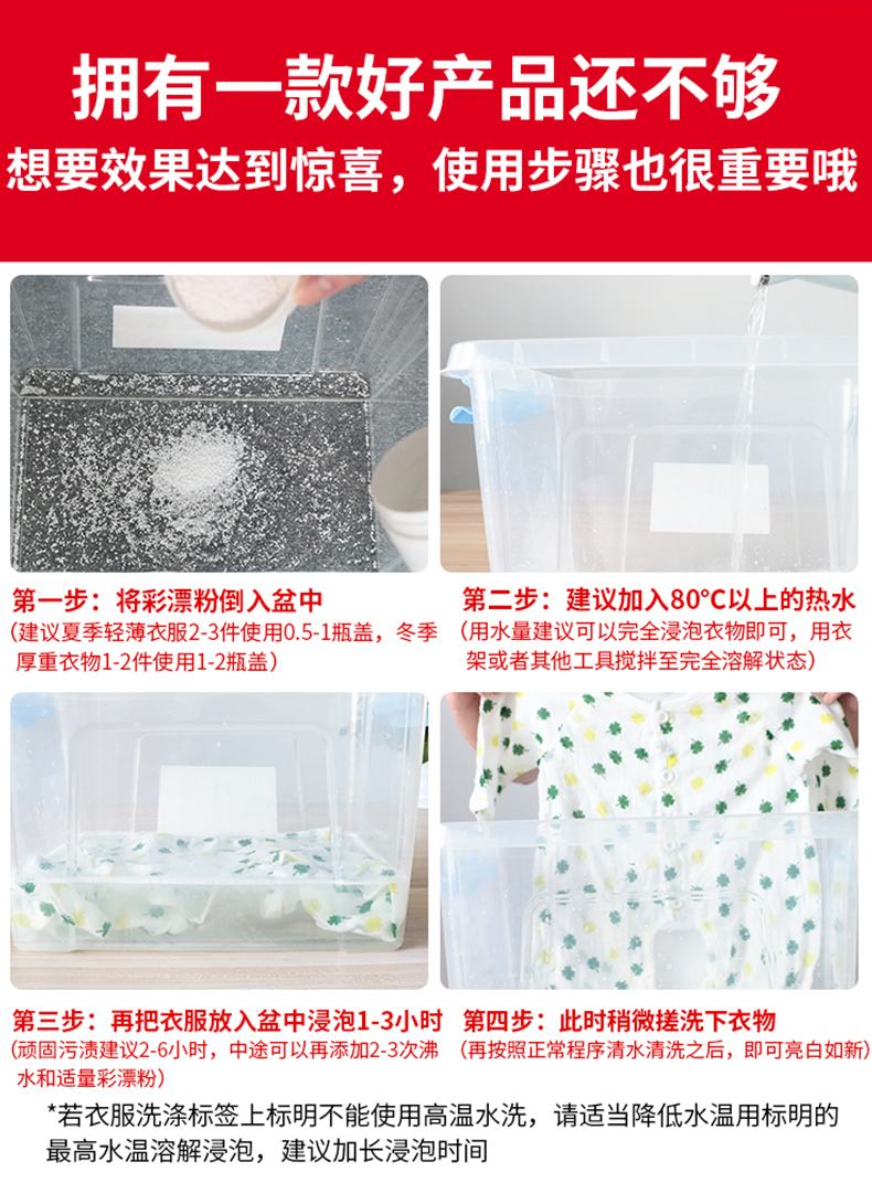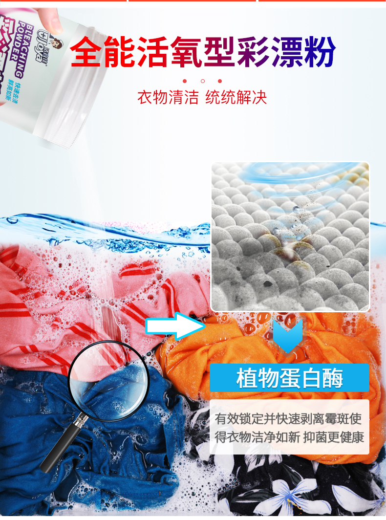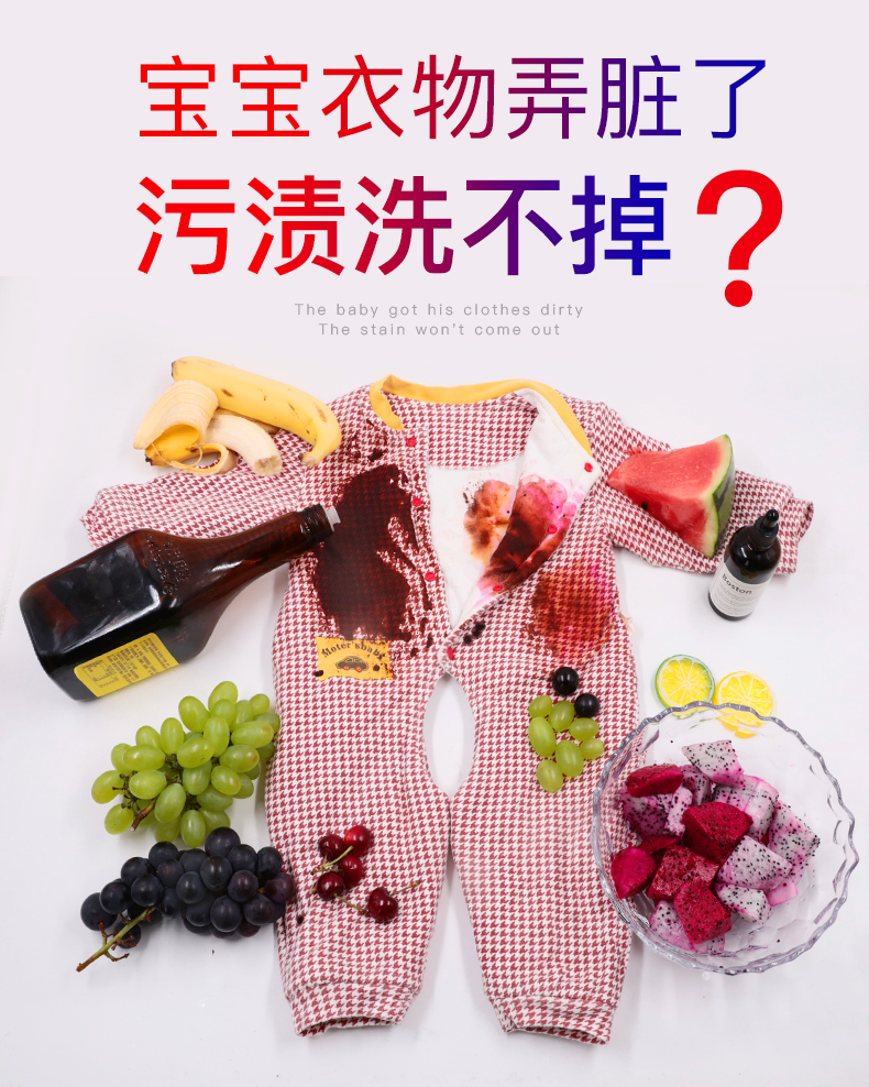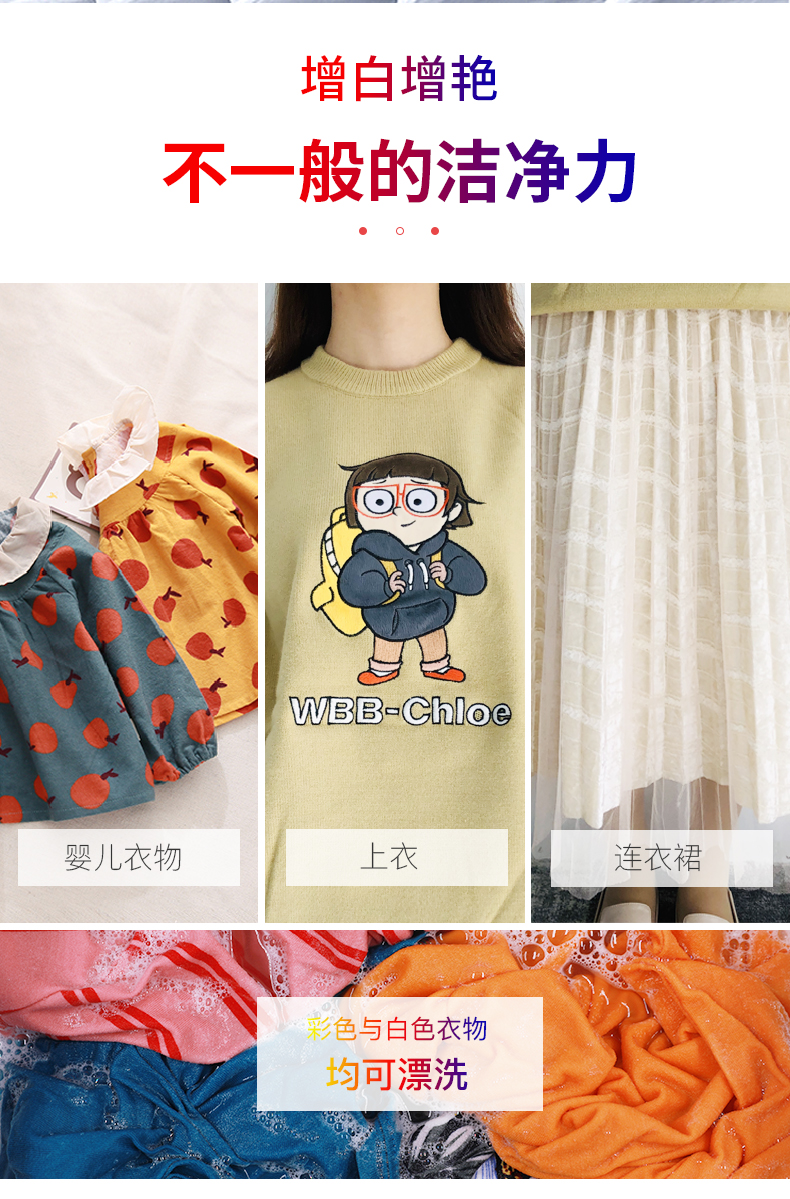 我的天呐!孩子一没看住,衣服上的油渍,果酱渍全沾上了!还好有去污神器彩漂剂!安全不伤手,不伤衣!轻松去黄去渍,让白色衣服更亮白,彩色衣服更护色!