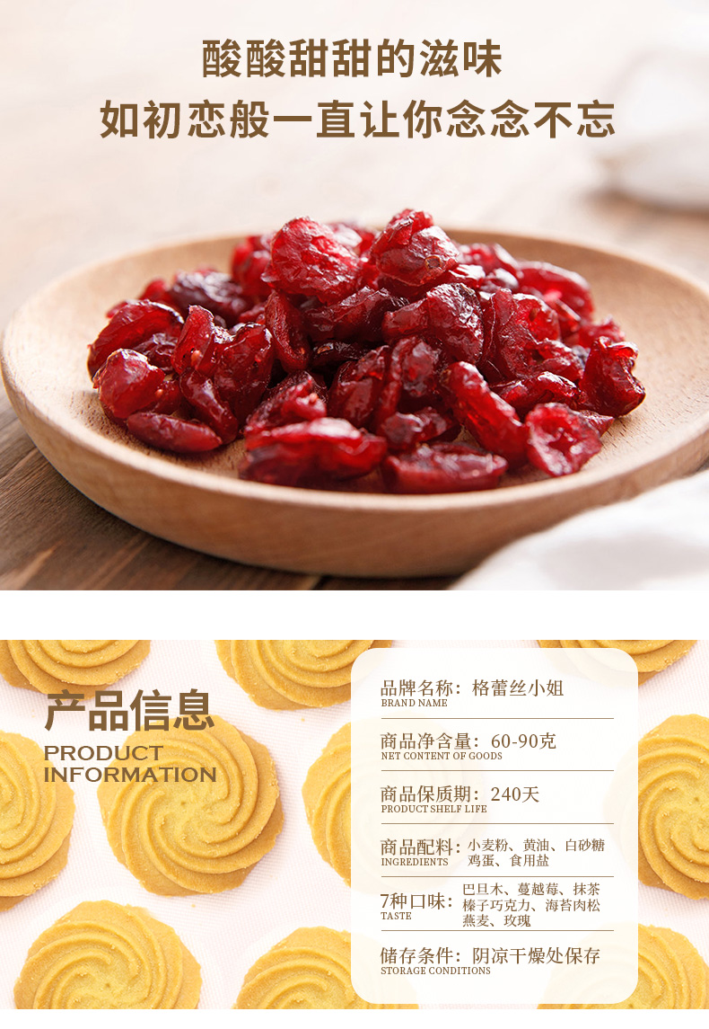 格蕾丝小姐曲奇饼干,精选大颗粒馅料融合奶香黄油,用心烘焙,纯手工制作,蔓越莓味,抹茶口味,巴旦木味三种口味随心品尝,香醇酥脆,奶香浓郁!老少皆宜!送礼必备!