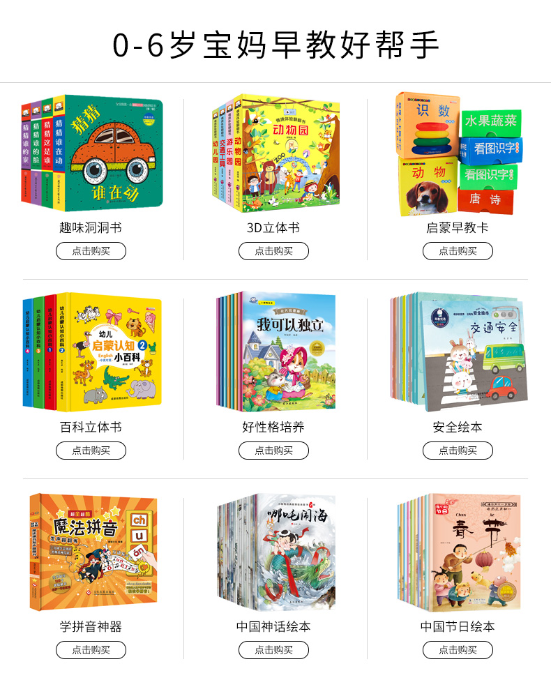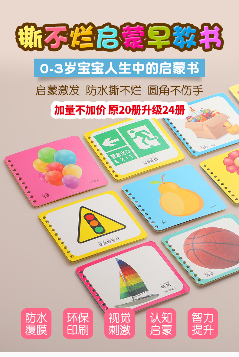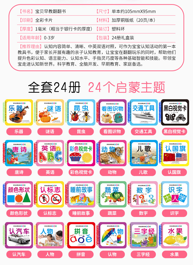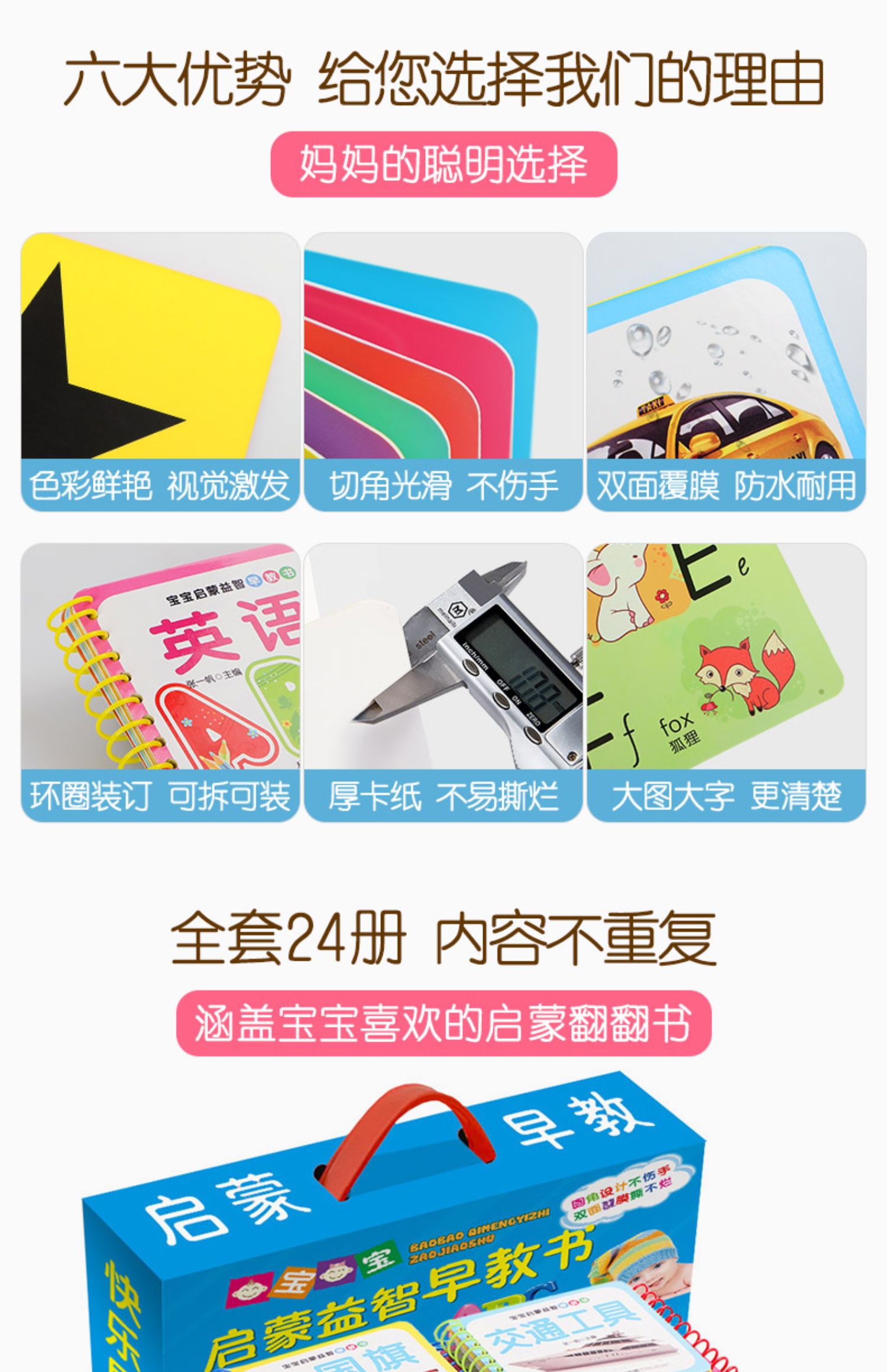 儿童撕不烂早教圈圈书,24本礼盒装。双面覆膜加厚卡片,大豆油墨印刷,圆角设计安全贴心。精选拼音,古诗,识字,儿歌等基础知识,宝妈必备幼儿早教启蒙读物,帮助宝宝更好的开发智力,送2本迪士尼绘本。