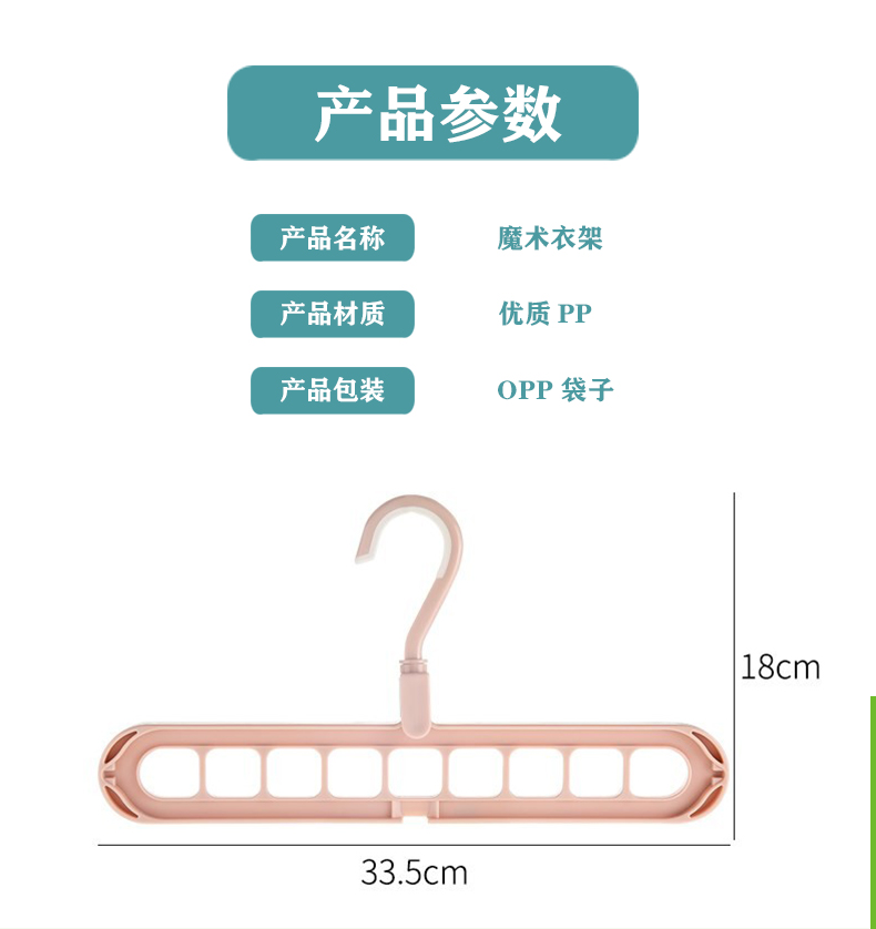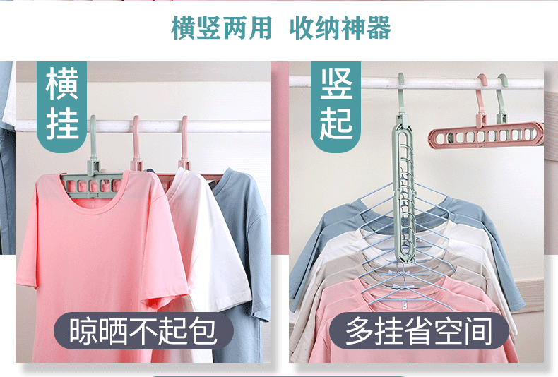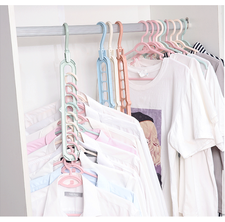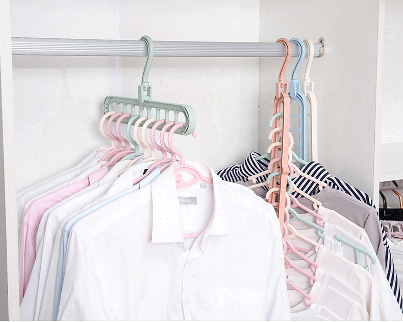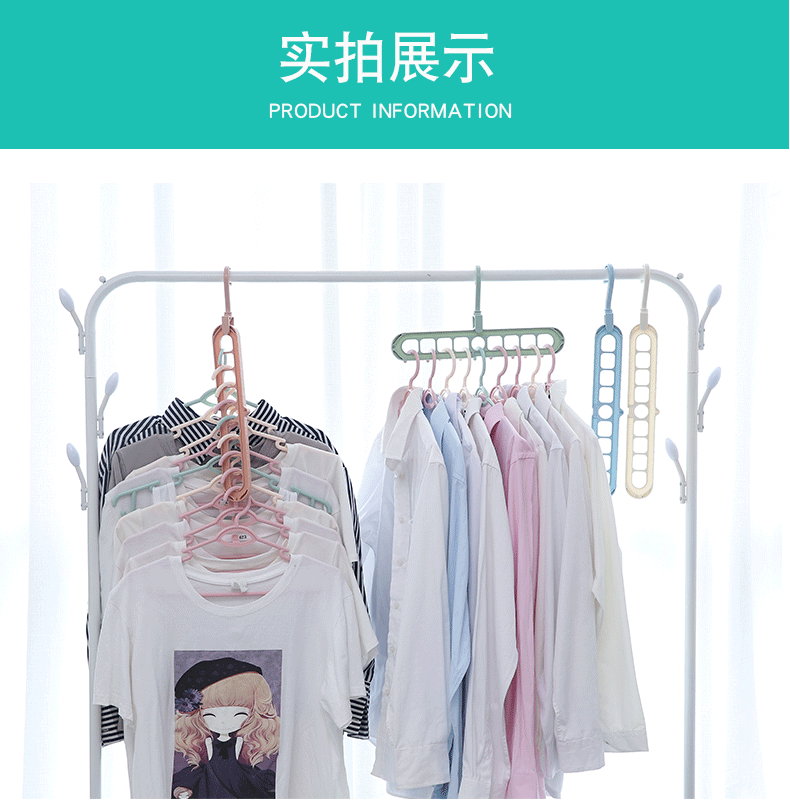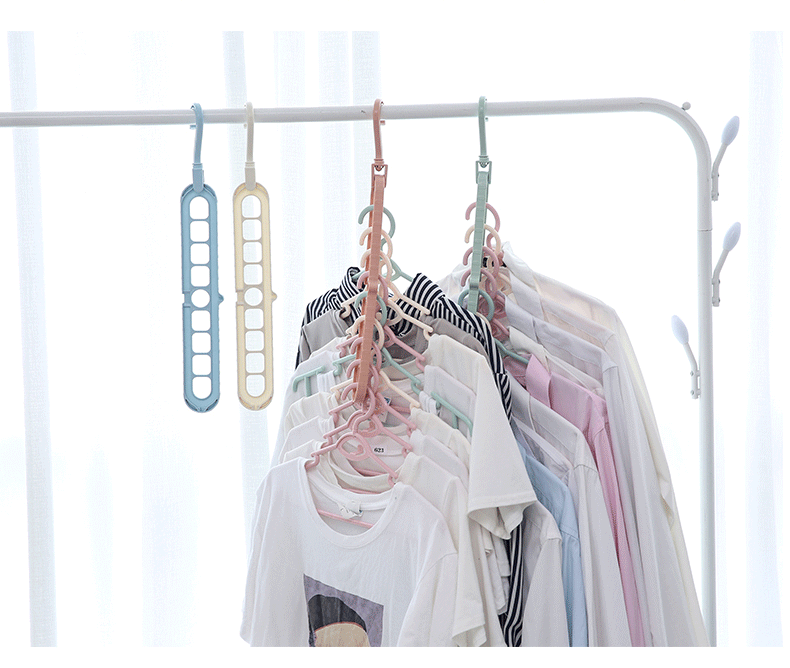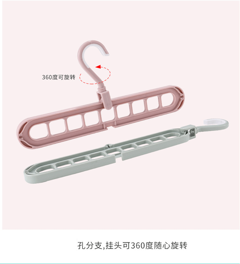 每个衣架可挂9件衣服!PP材质+360度旋转挂钩,9孔可挂,横竖都能用,以一敌九的收纳,超级节省空间,居家必备收纳神器.