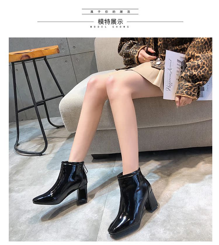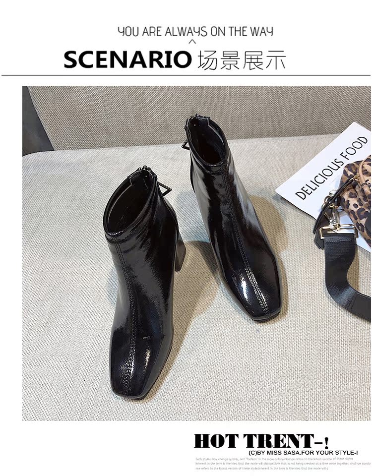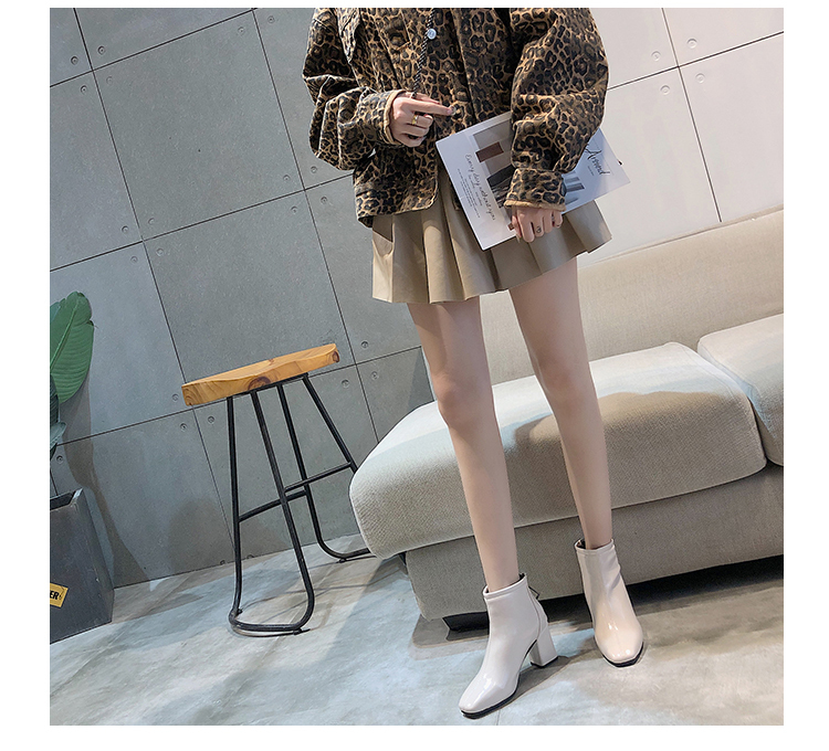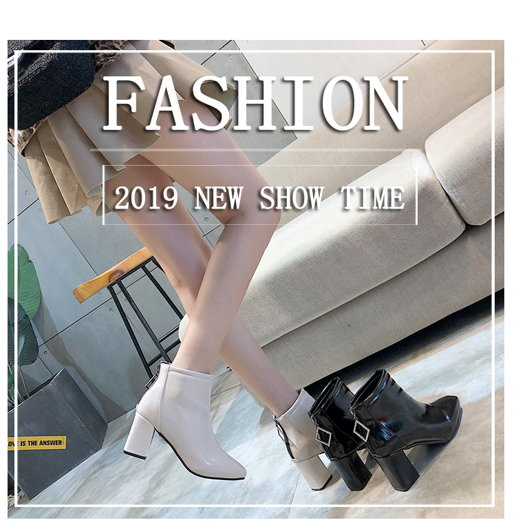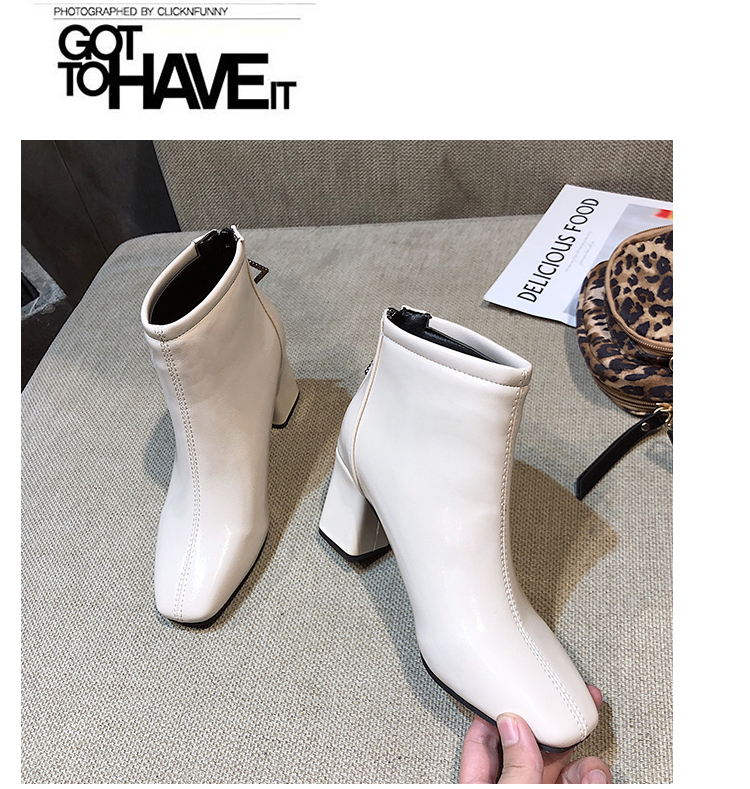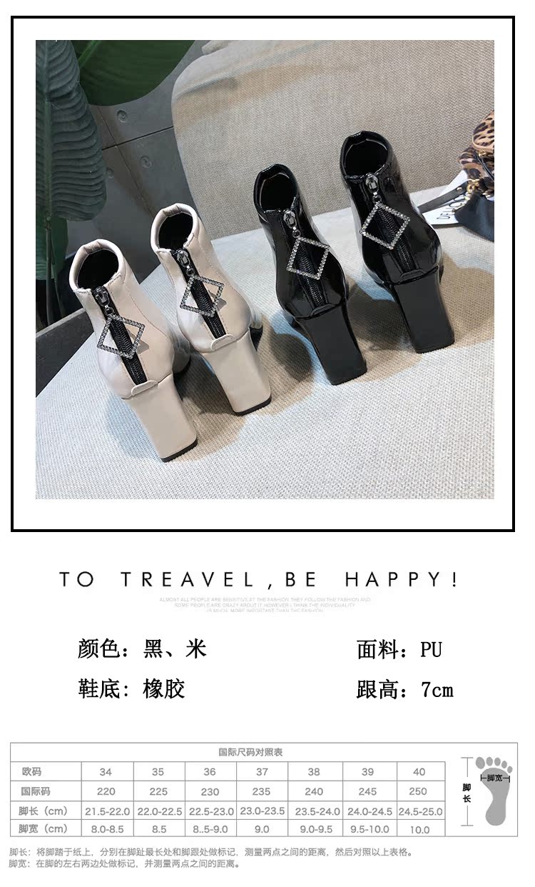 方头靴子女杏色短靴秋2019新款冬粗跟