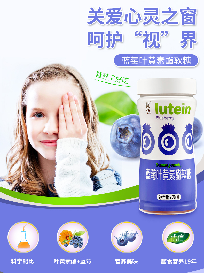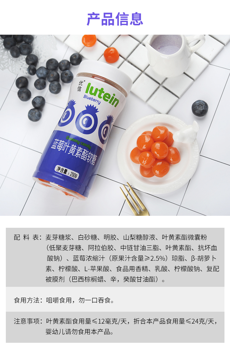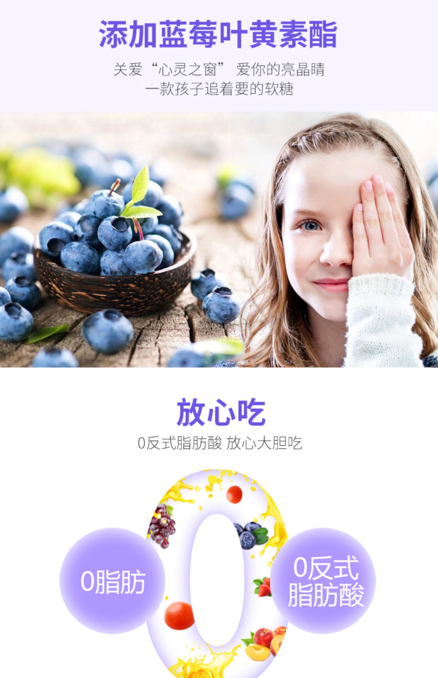 【满2件7.5折;满3件5折】富含麦芽糖,蓝莓叶黄素脂+蓝莓软糖果,双效护眼,酸甜好吃,咀嚼食用;缓解视疲劳,预防近视,保护视力,不添加香精。