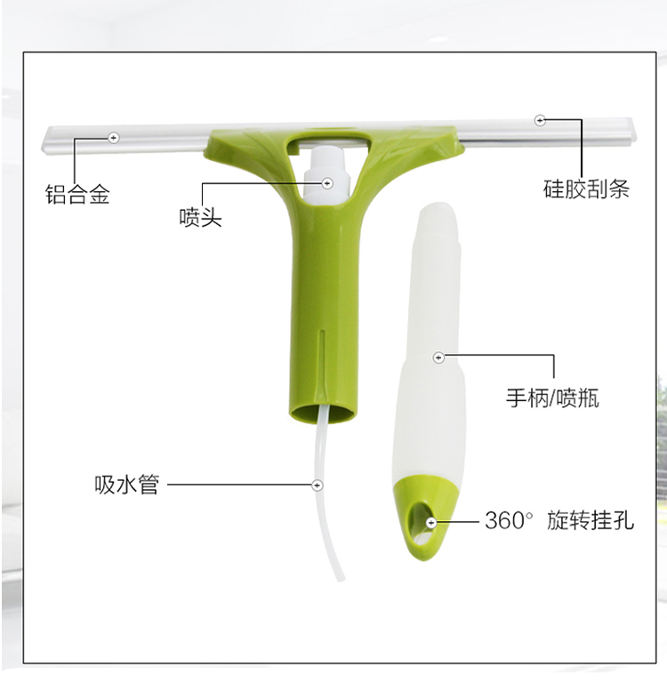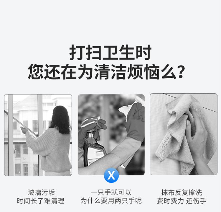 万向旋转,擦窗更省力,刮擦合一,无死角清洁,纤维拖布,一擦一刮,焕然一新。