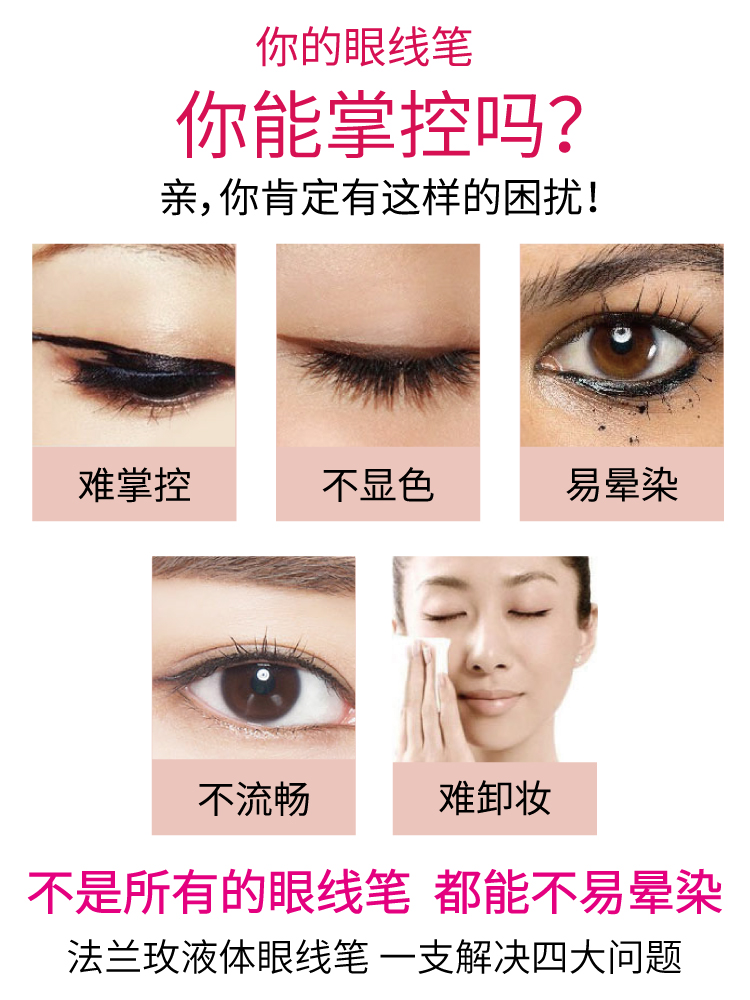 法兰玫正品眼线笔防水不晕染持久,防水速干,随画随干,隔离水油,不晕妆,一笔成型,巨显色,线条纤细,笔尖舒适,触感柔滑,画得畅快,你值得拥有,赠送运费险!