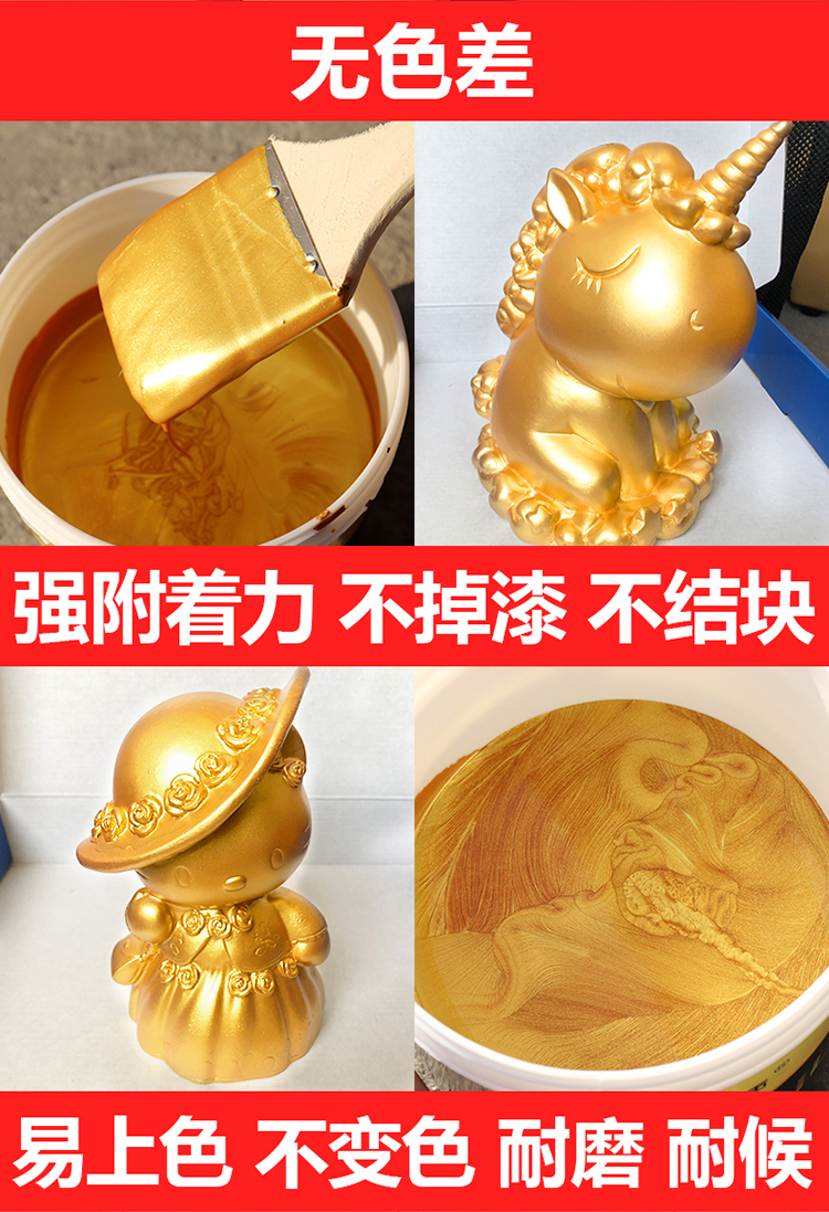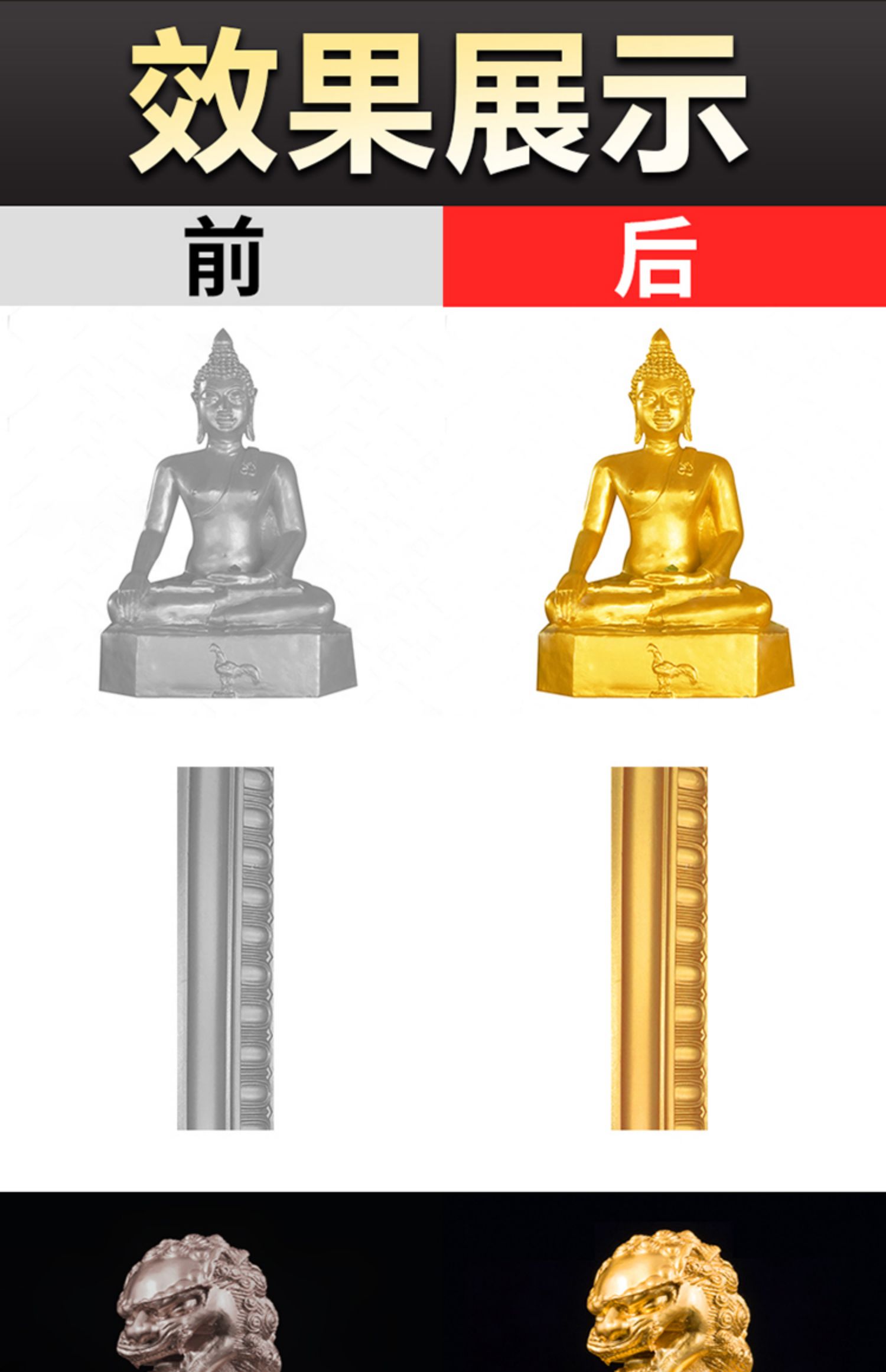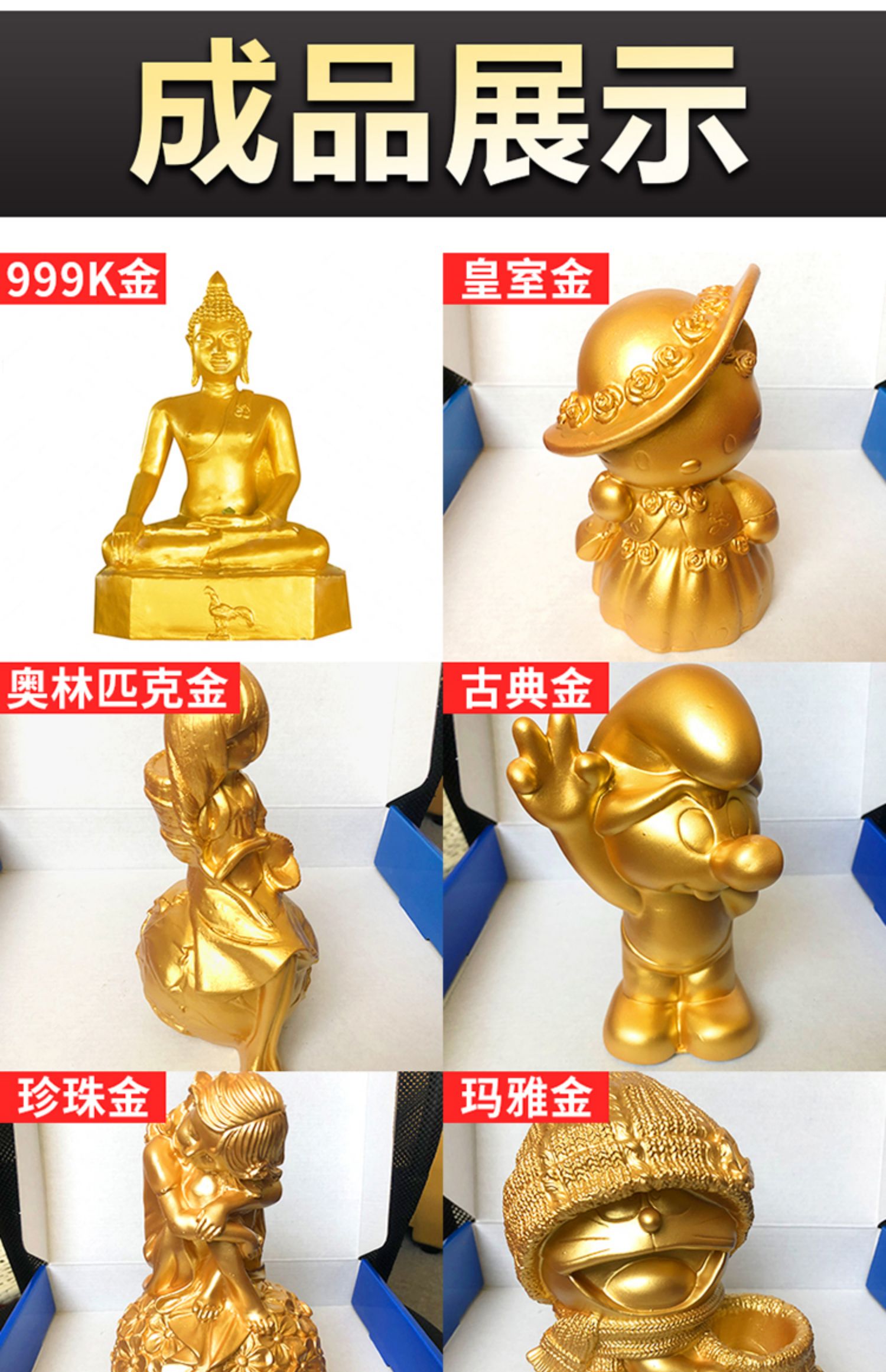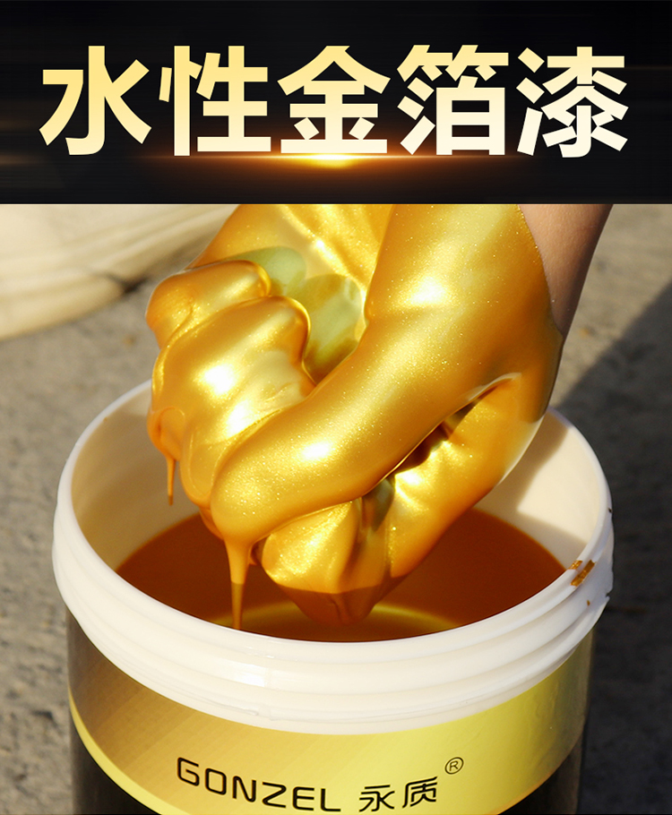 水性金箔漆999K,0甲醛,健康无味,无色差,强附着力,不掉漆,不结块,易上色,不变色,耐磨,防水防锈,主要适用于石膏用品、木器、牌匾描金、寺庙、KTV、酒店、工艺品等。