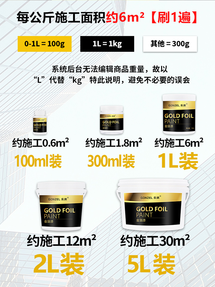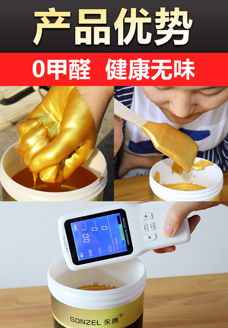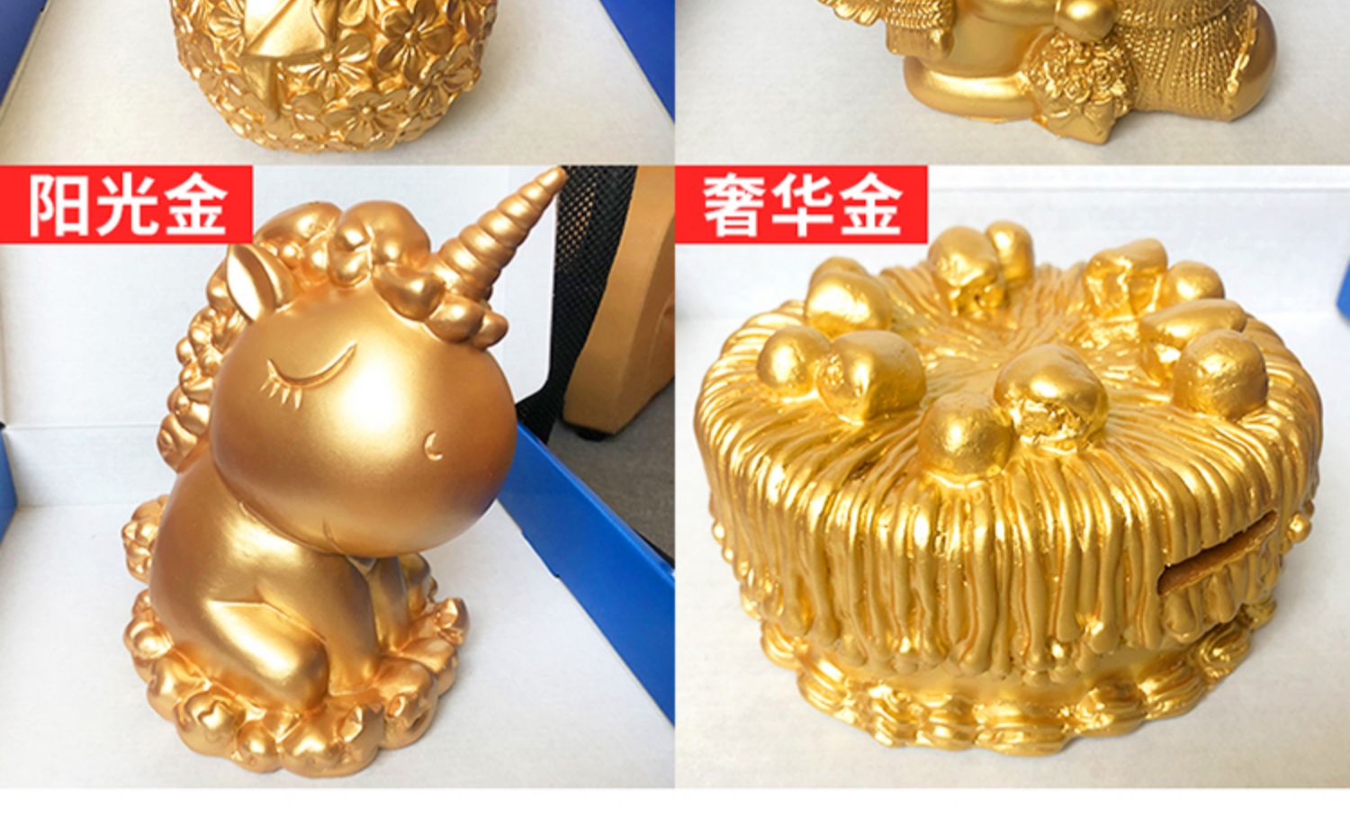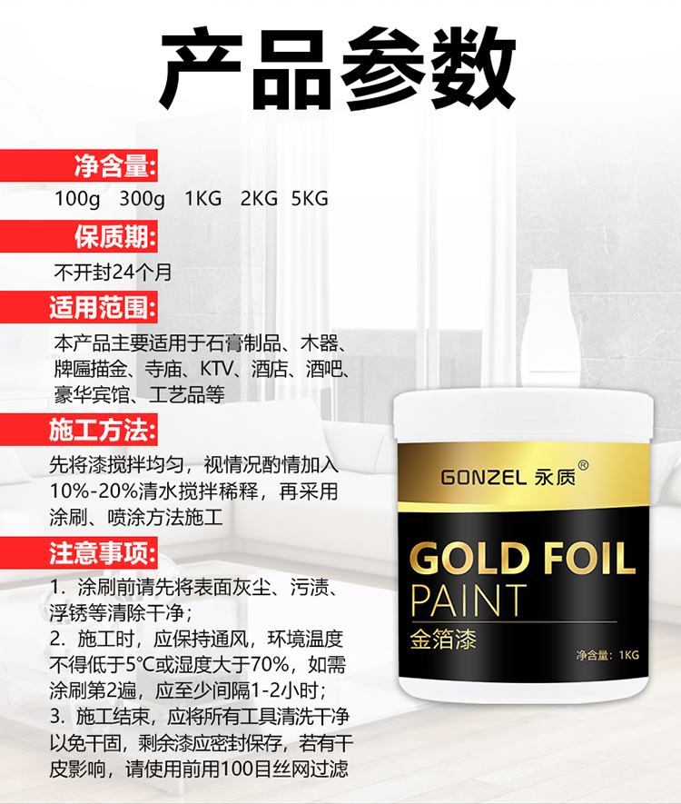 水性金箔漆999K,0甲醛,健康无味,无色差,强附着力,不掉漆,不结块,易上色,不变色,耐磨,防水防锈,主要适用于石膏用品、木器、牌匾描金、寺庙、KTV、酒店、工艺品等。