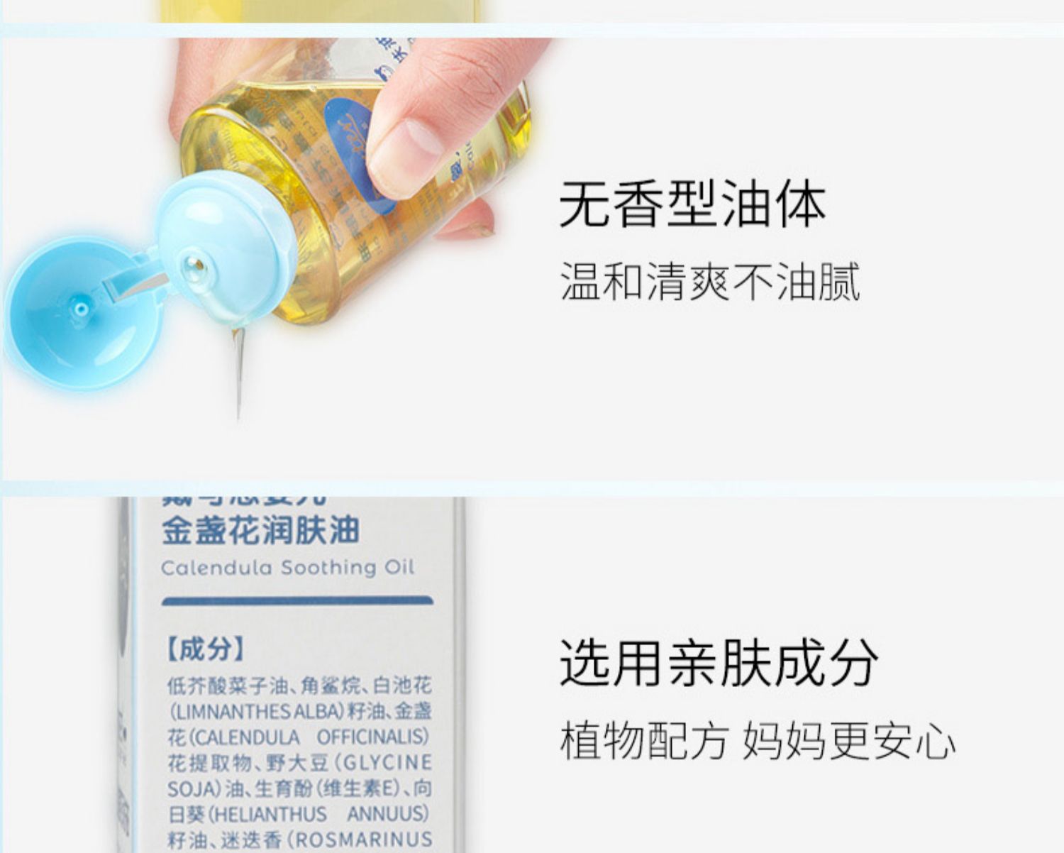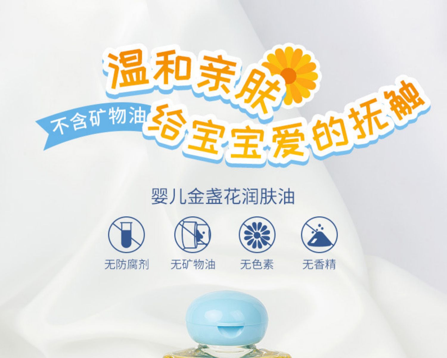 戴可思婴儿润肤油金盏花宝宝抚触油新生儿按摩润肤油春夏新品,植物配方,不含矿物油,帮助保护皮肤脂质;纯净的温和呵护,润滑娇嫩肌肤,易吸收,倍感滋润健康成长~让宝宝的肌肤水润到爆。