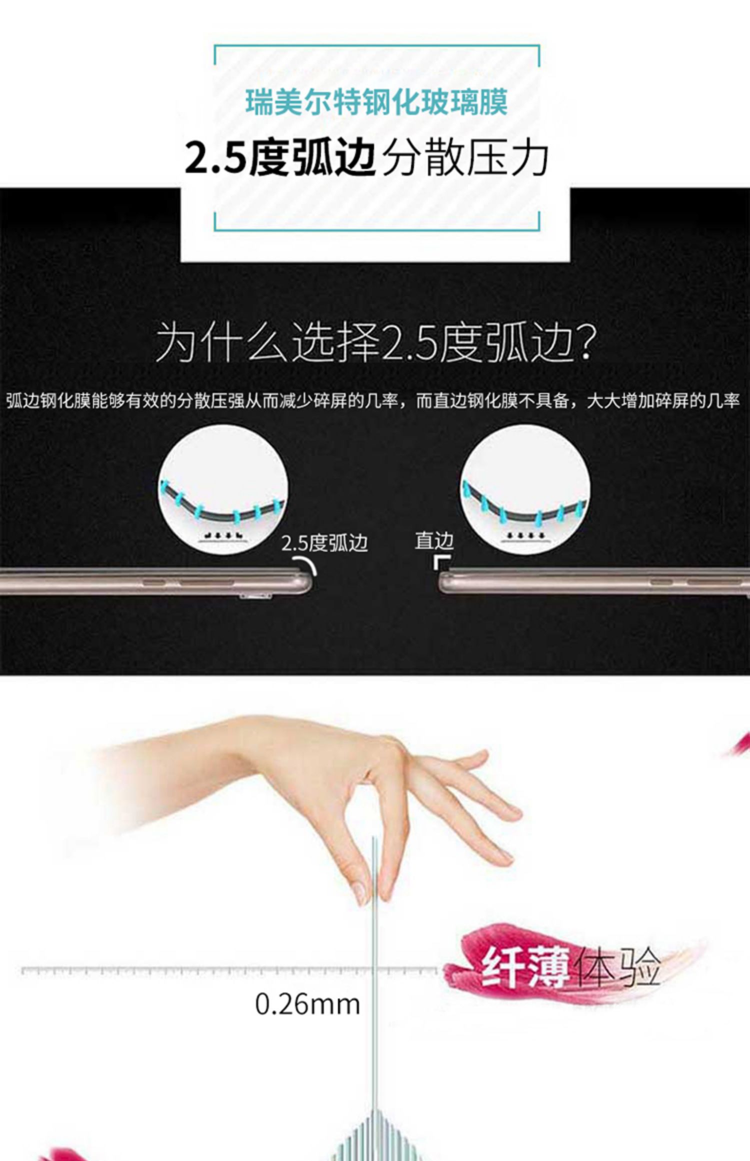 ,高铝硅强化防爆钢化膜。2.5D圆润弧边,透至裸机屏幕的守卫者,强抗指纹,高品质高颜值,足以匹配您高贵的爱机!