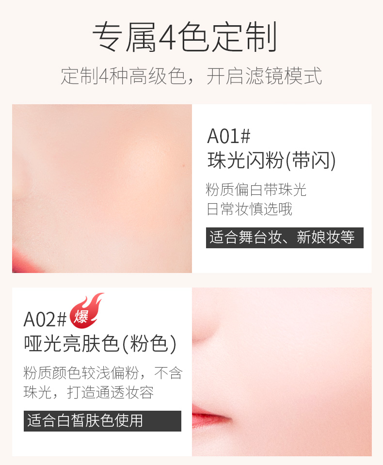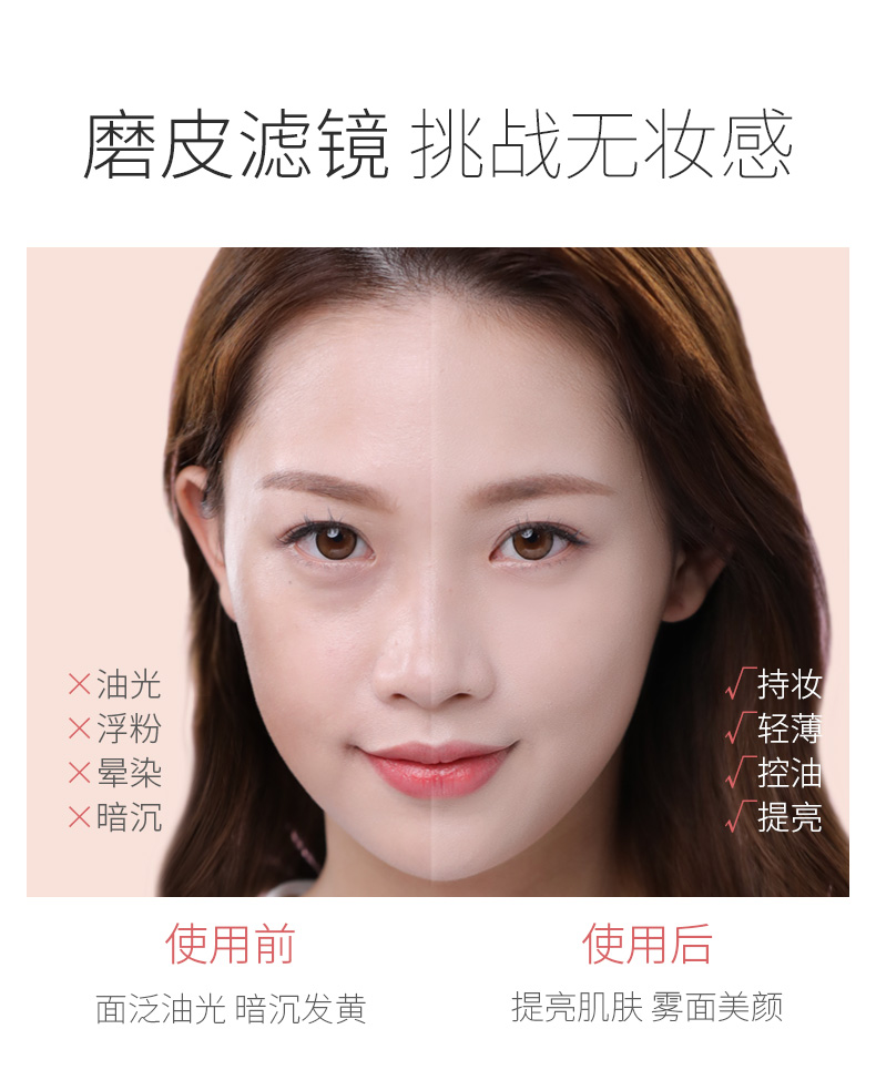 适合大多数肤色或追求清爽哑光妆感的MM,持久定妆,提亮肤色,隐秘毛孔,一粉多用,告别油腻腻,做迷人的小妖精~!