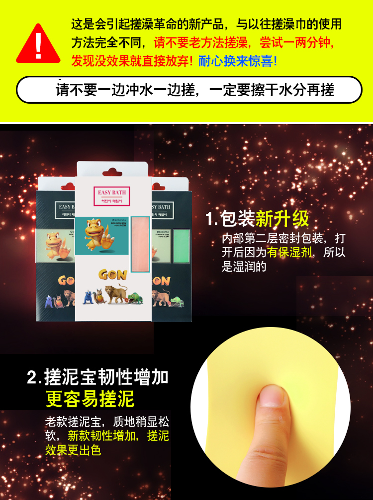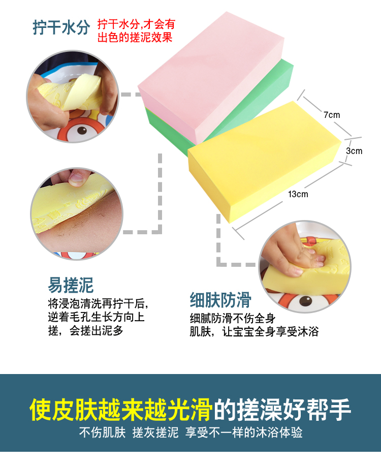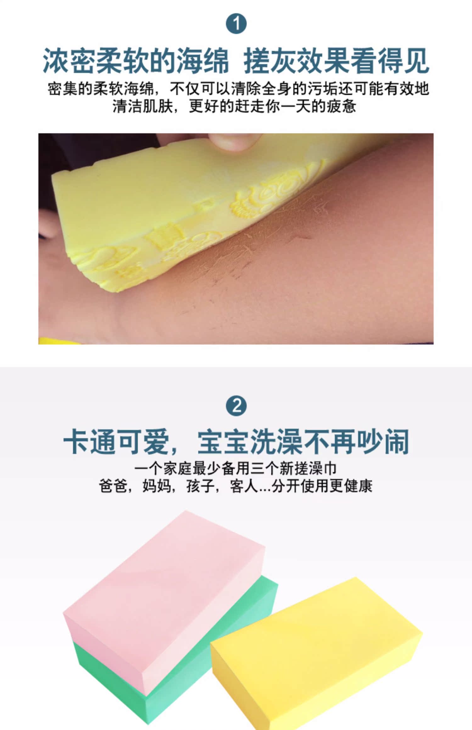 升级款搓澡巾,呆萌卡通图案,浓密柔软海绵,去除污垢,按摩肌肤,舒适防滑,卫生美观,去泥不伤皮肤。