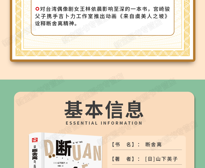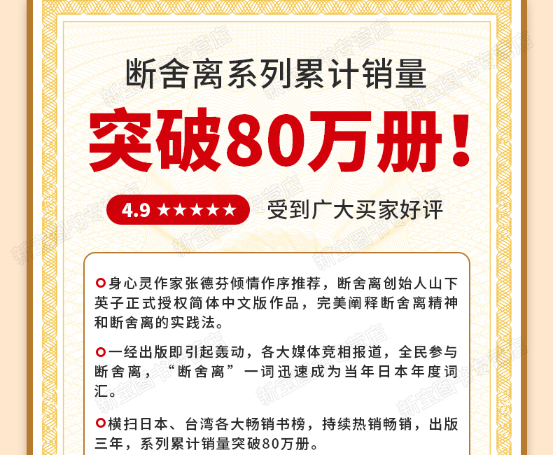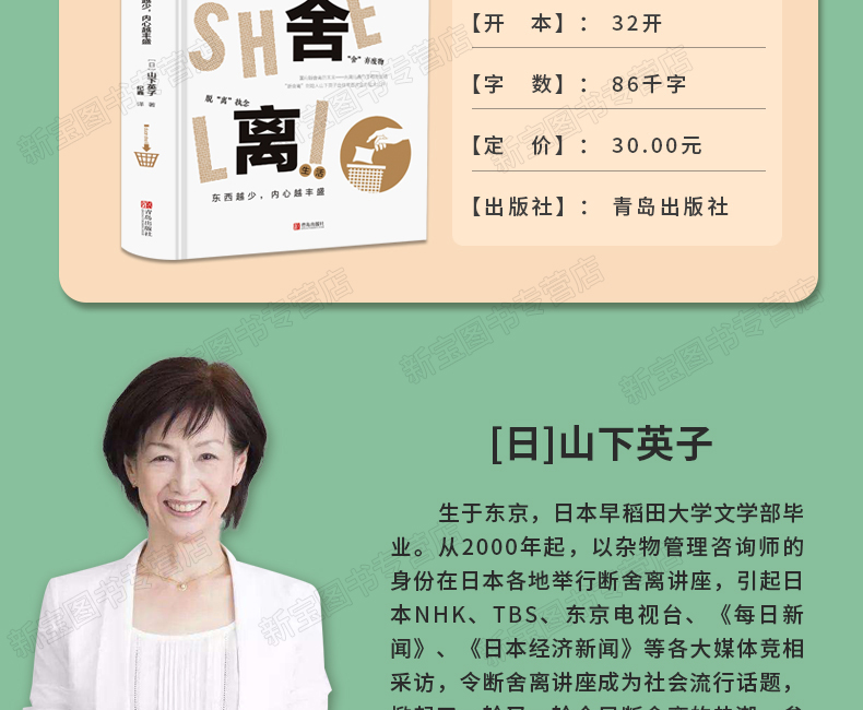 日本杂物管理咨询师山下英子力作,断=不买、不收取不需要的东西。舍=处理掉堆放在家里没用的东西。离=舍弃对物质的迷恋。管理自己,管理生活,管理情绪!让自己处于宽敞舒适,自由自在的空间。