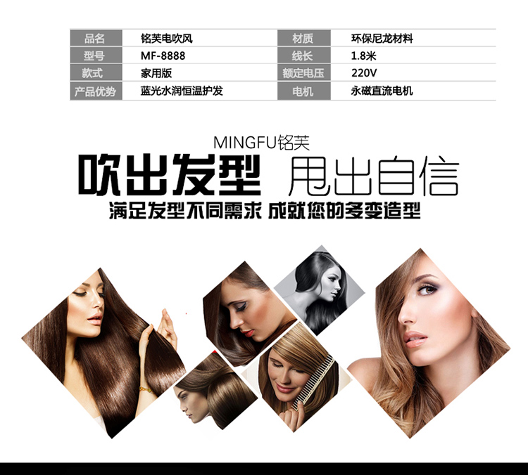 【铭芙正品】发廊专业吹风机时尚造型大功率,分分钟速干,蓝光水润恒温护发,德国技术电机风力大,独立冷热风,6档实现调温调速同等功率,低噪音静音运转,发廊家用造型必备!