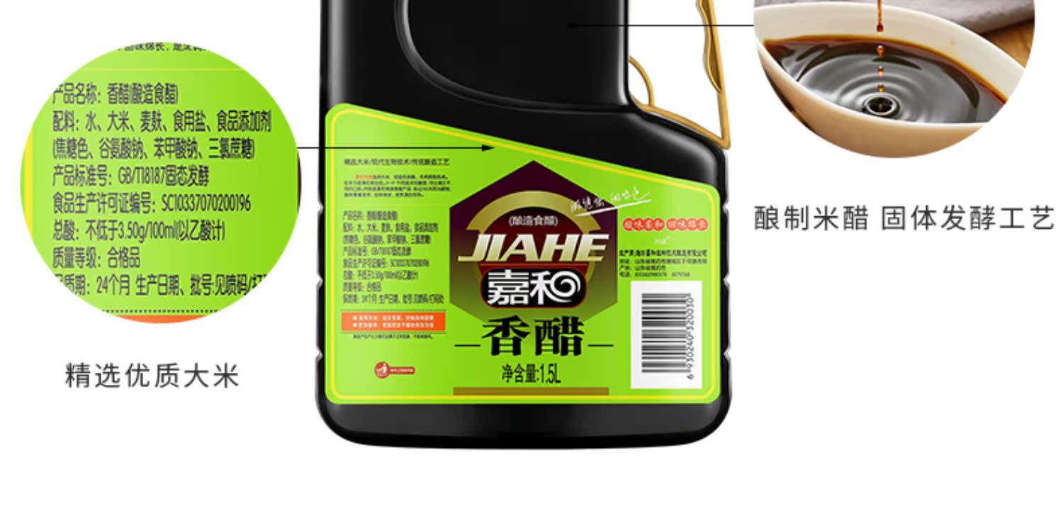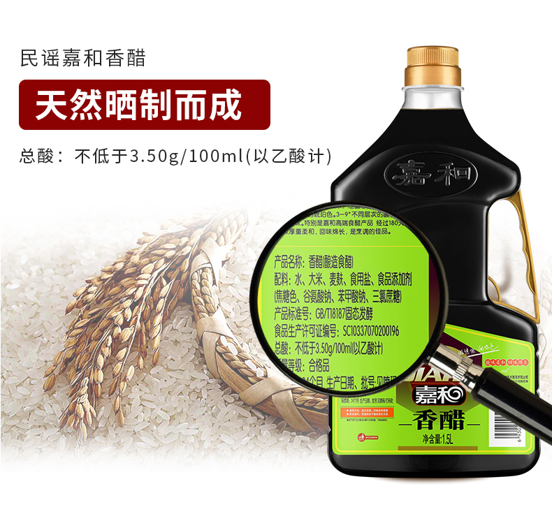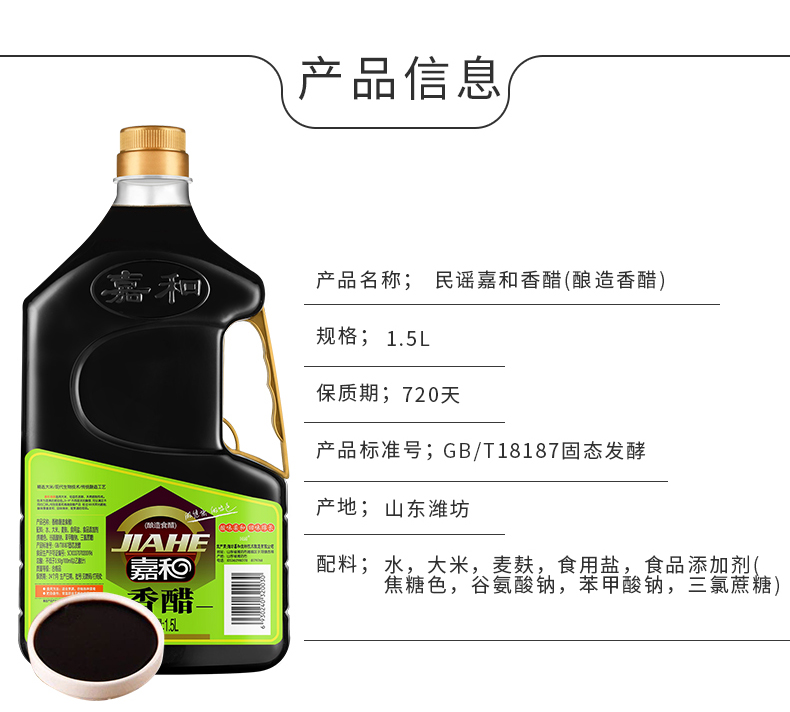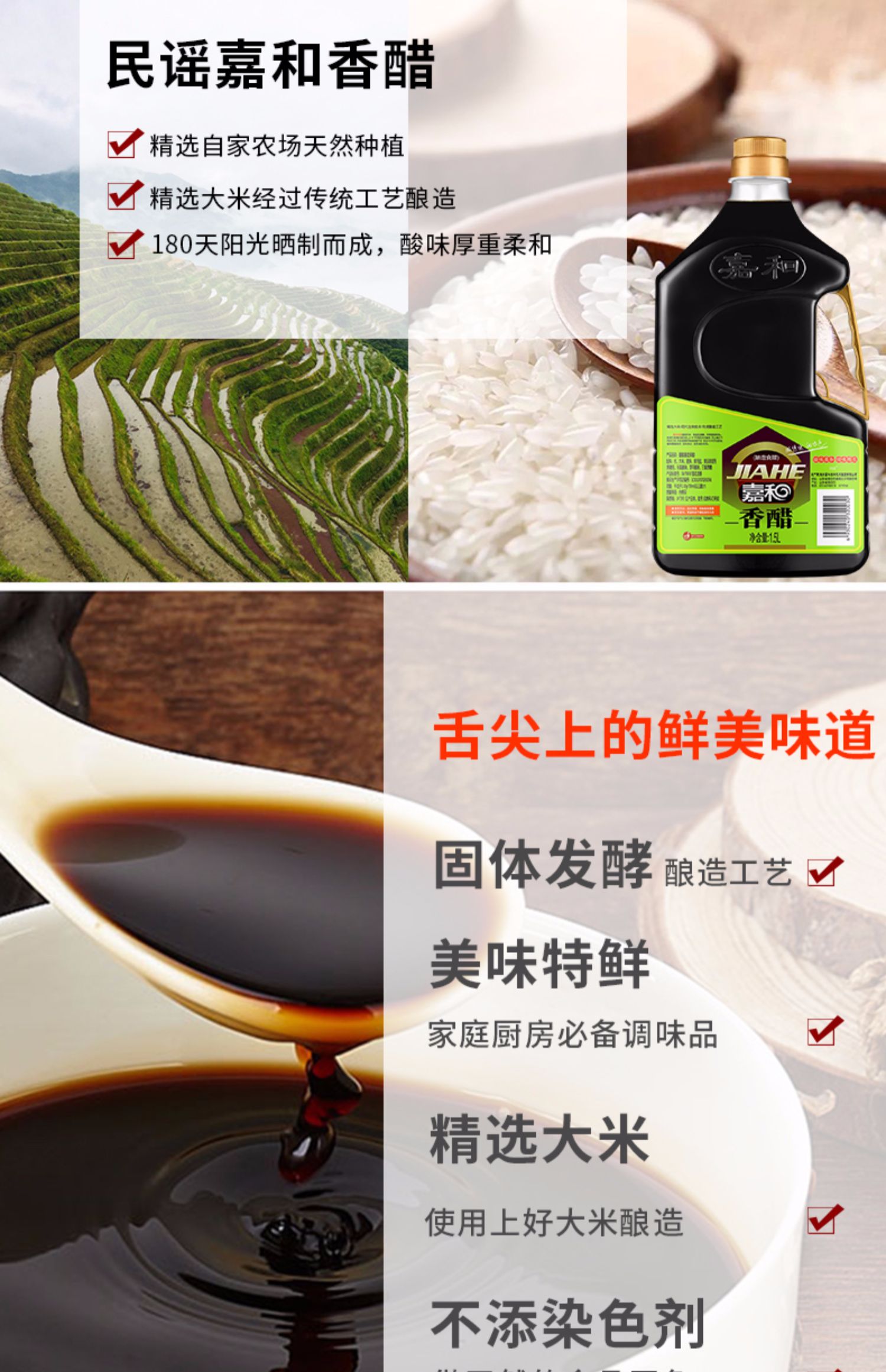 民谣嘉禾零添加米醋。原酿米醋。零添加。精选原料,酸甜爽口。家有嘉禾,天天好口福!分量超足,速来抢购。