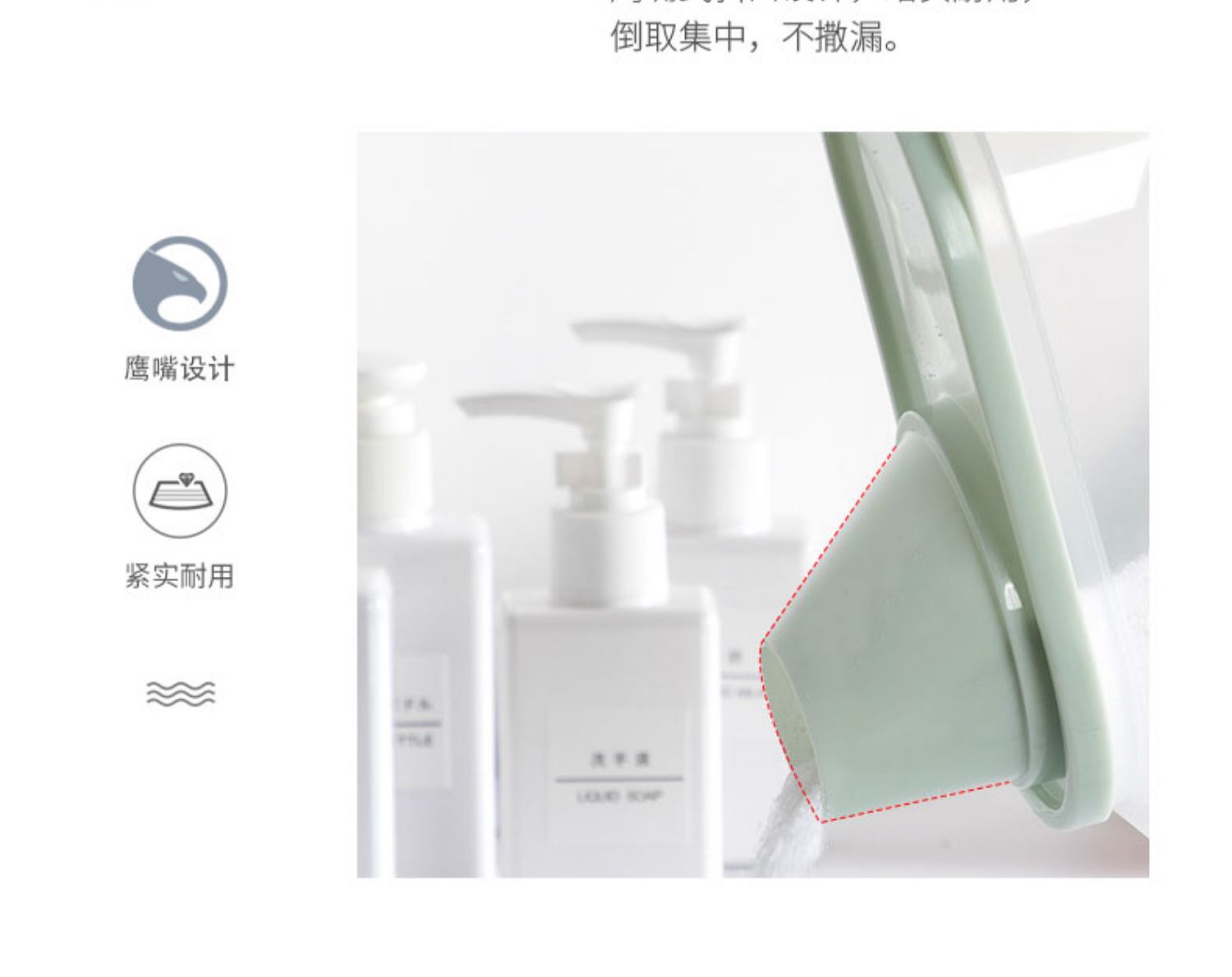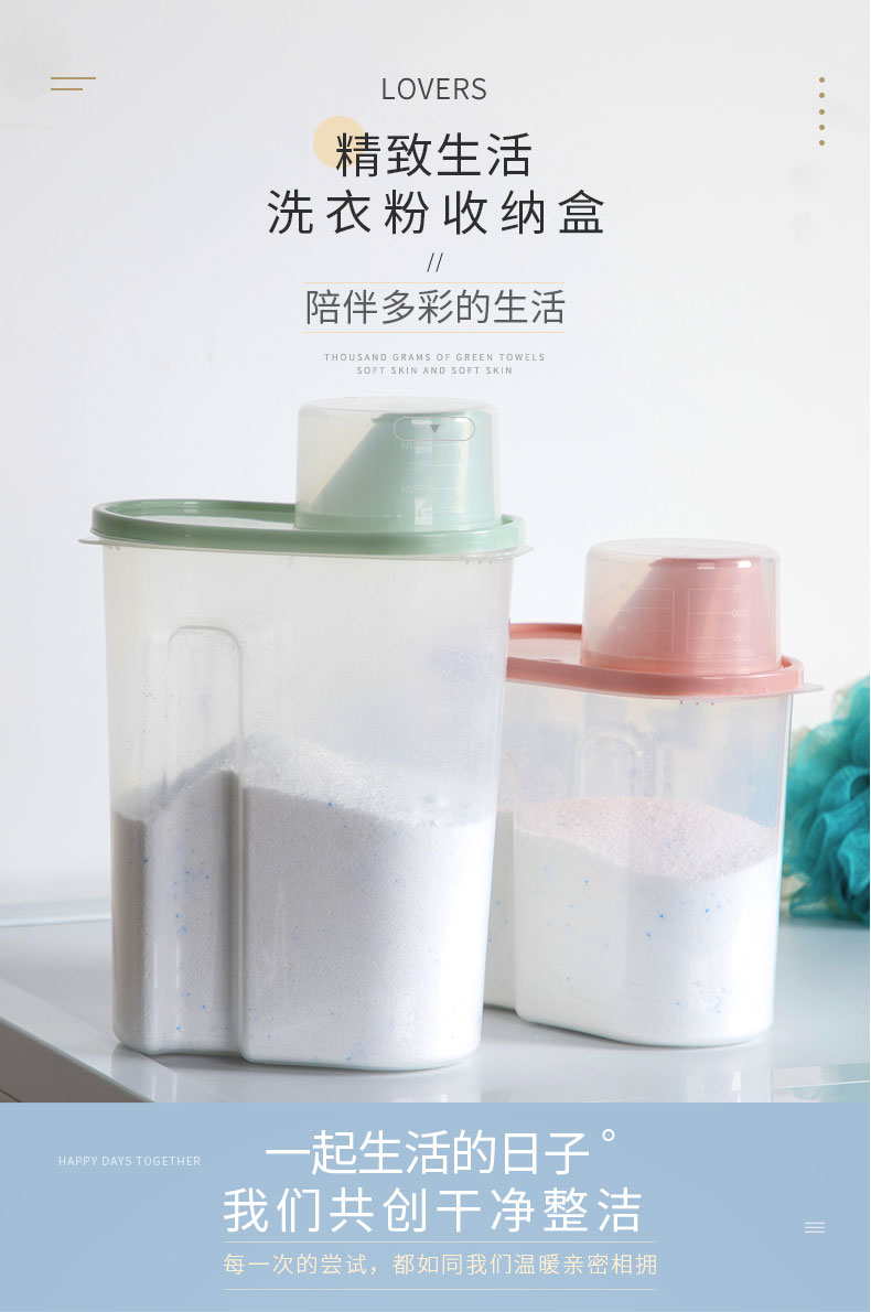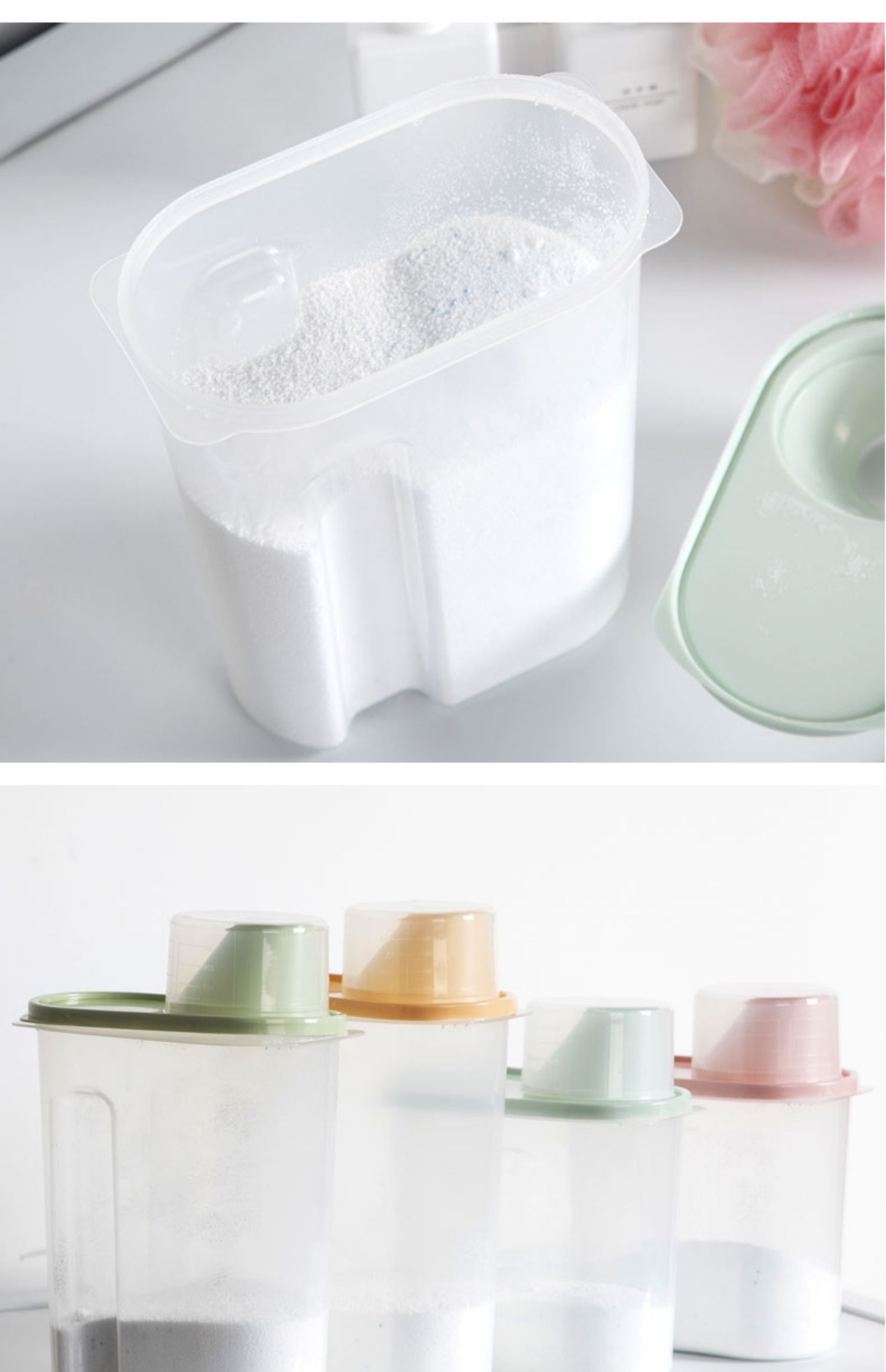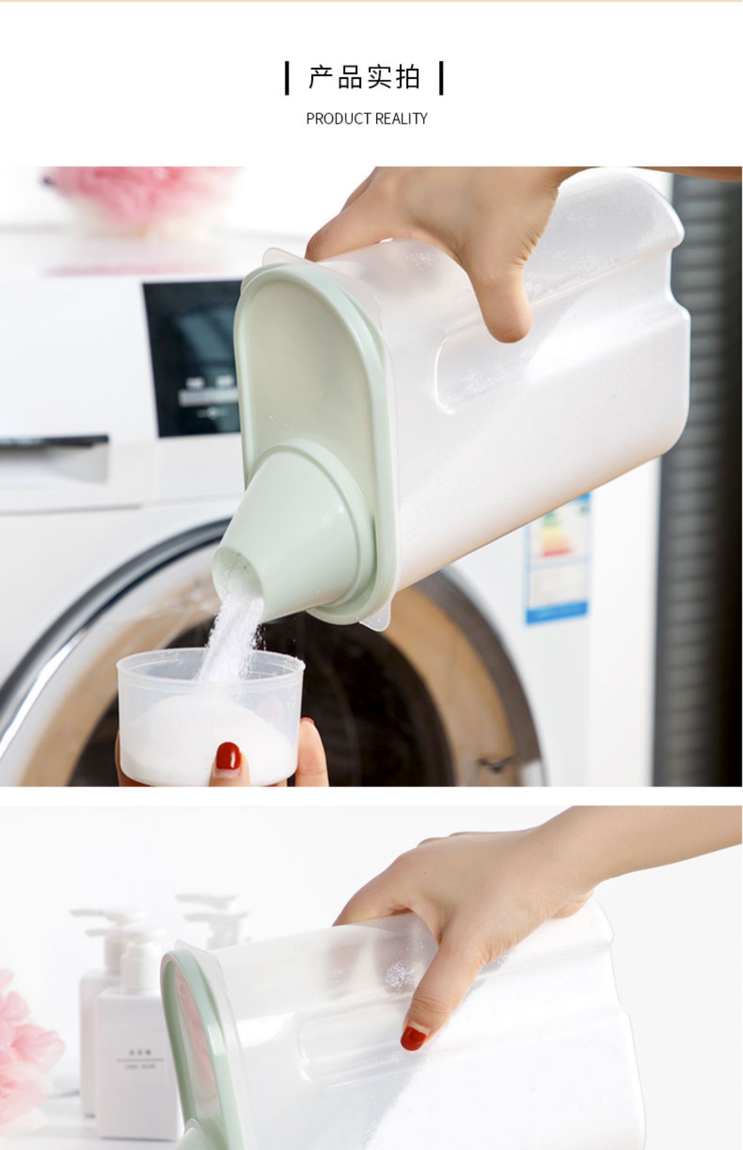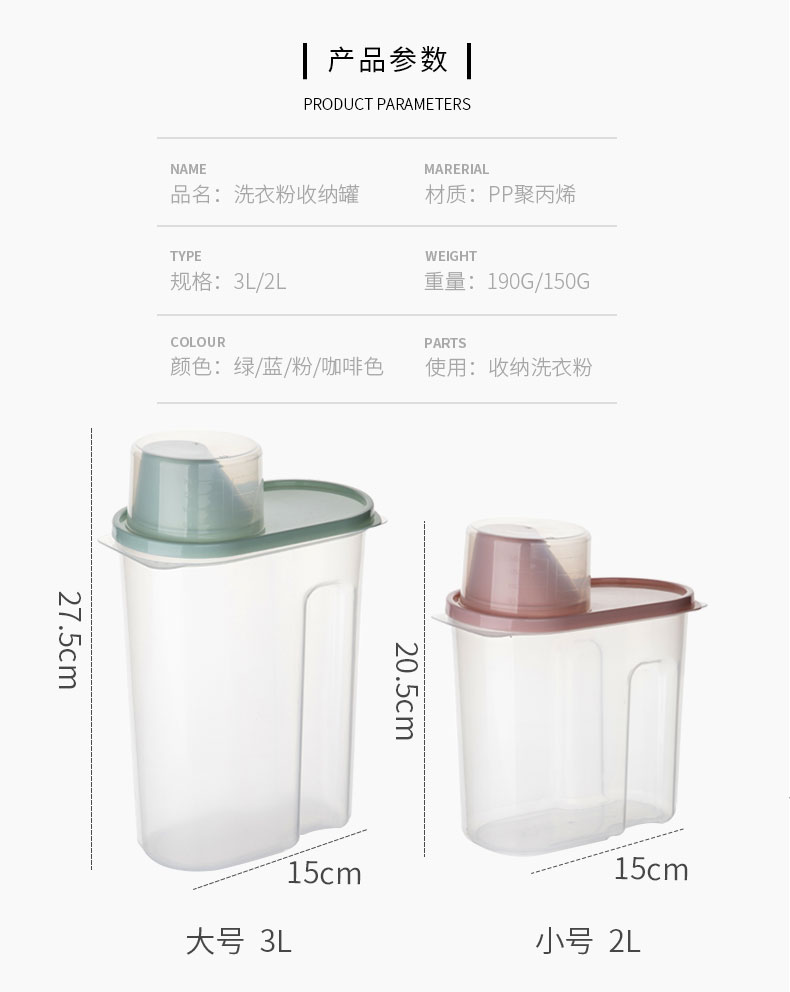 优质PP材质,洗衣粉收纳盒,微凹瓶身设计,单手拿握,轻松省力方便实用,结实耐用,封闭盖子自带量杯,方便测量,透明色,余量一目了然!