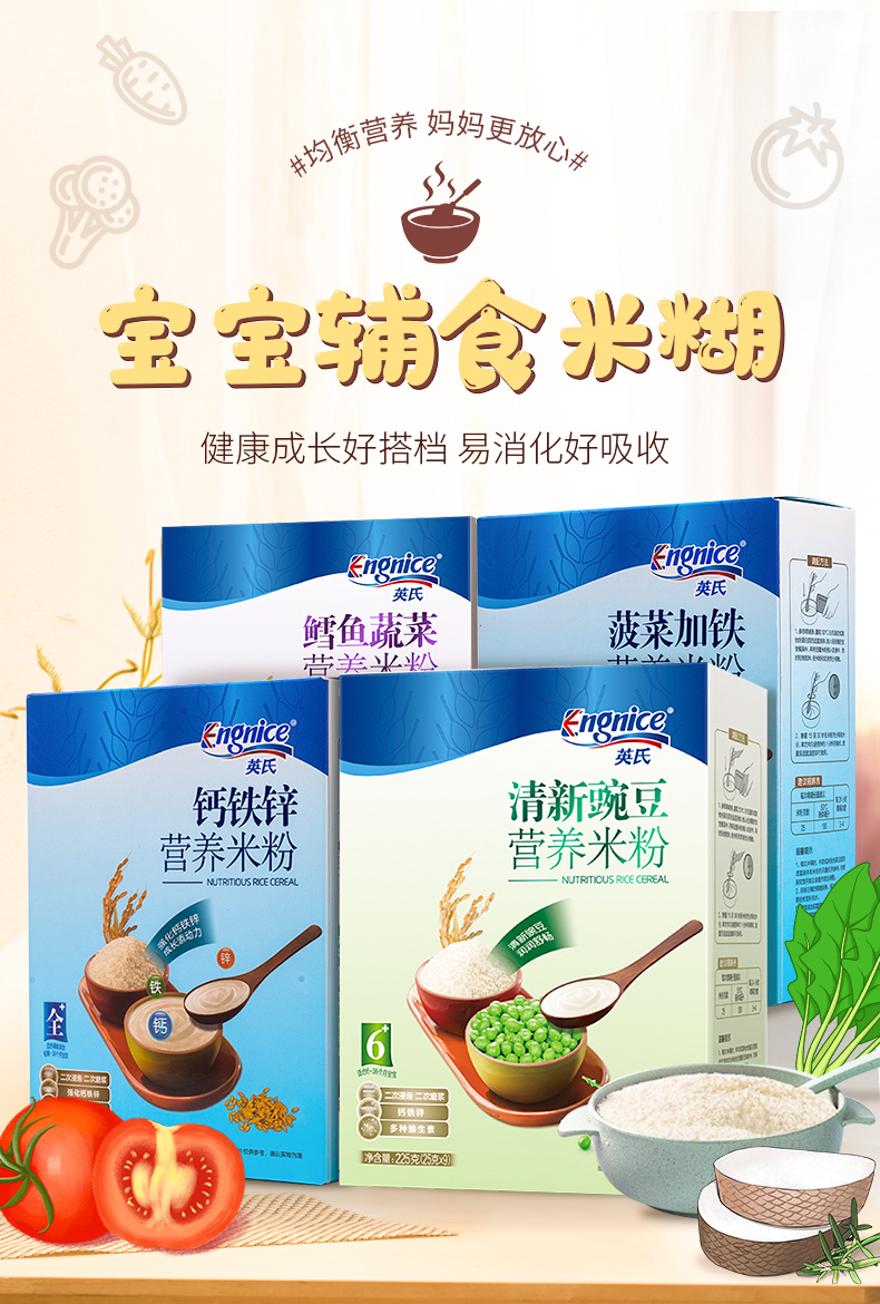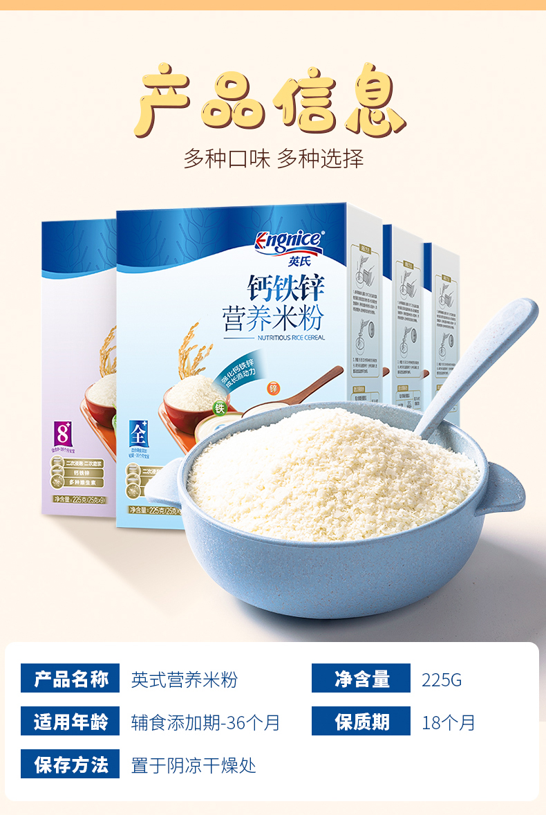 营养钙铁锌米粉225g。6到18个月的宝宝都可以吃。营养丰富都是宝宝身体所需。多种口味易入口易消化,英氏品牌官方授权放心食用。