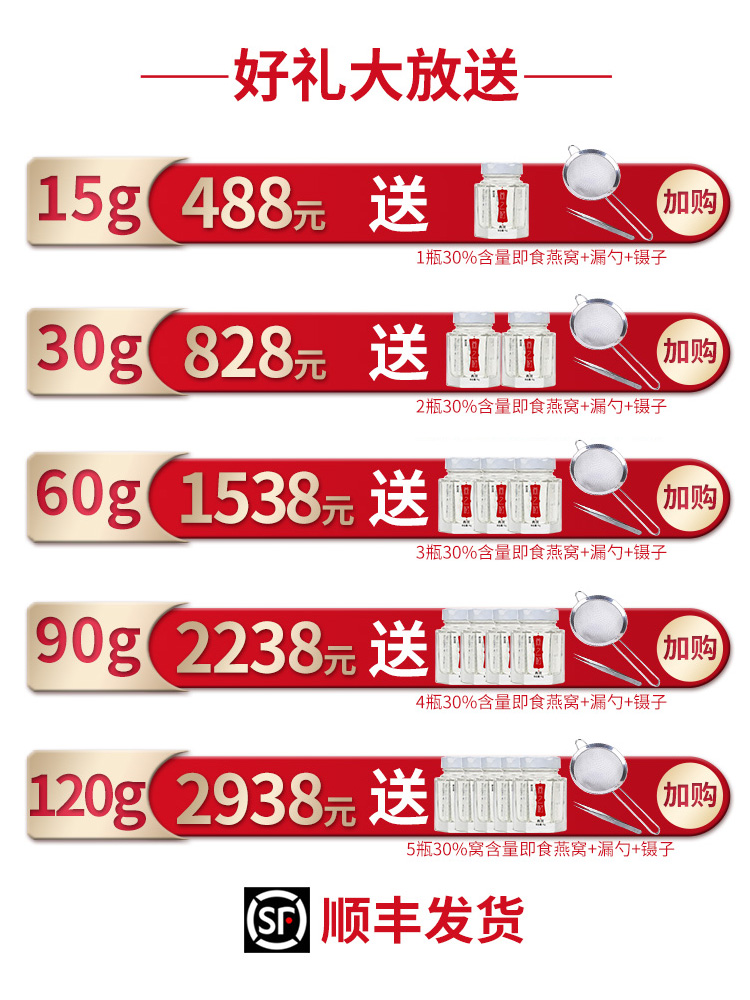 漏冻!330元大面额优惠!轻毛燕盏,燕丝完整舒展,清晰可见,入口爽滑软糯,精选品质,营养价值高,滋养身心,开盖即饮,每日滋养,感受美丽蜕变。