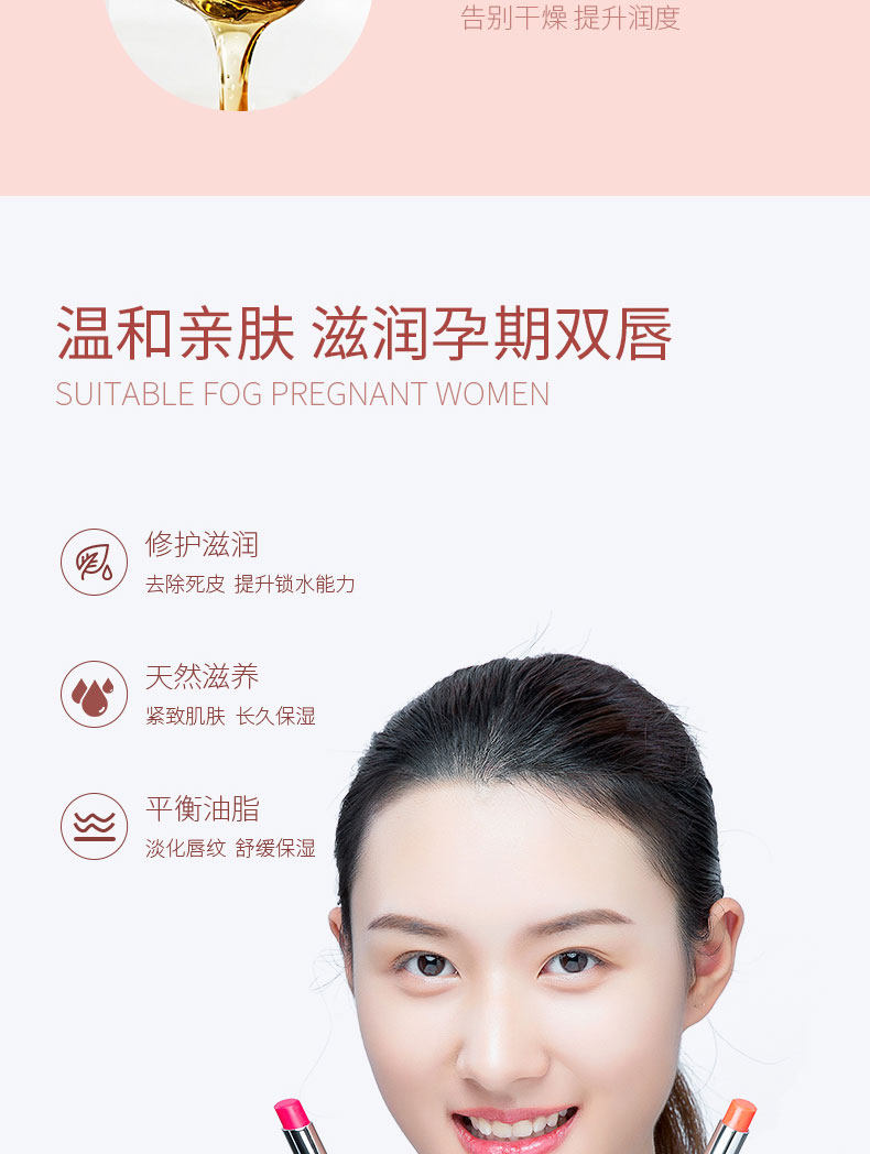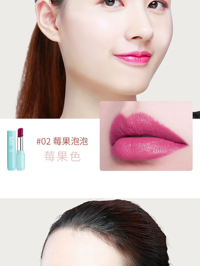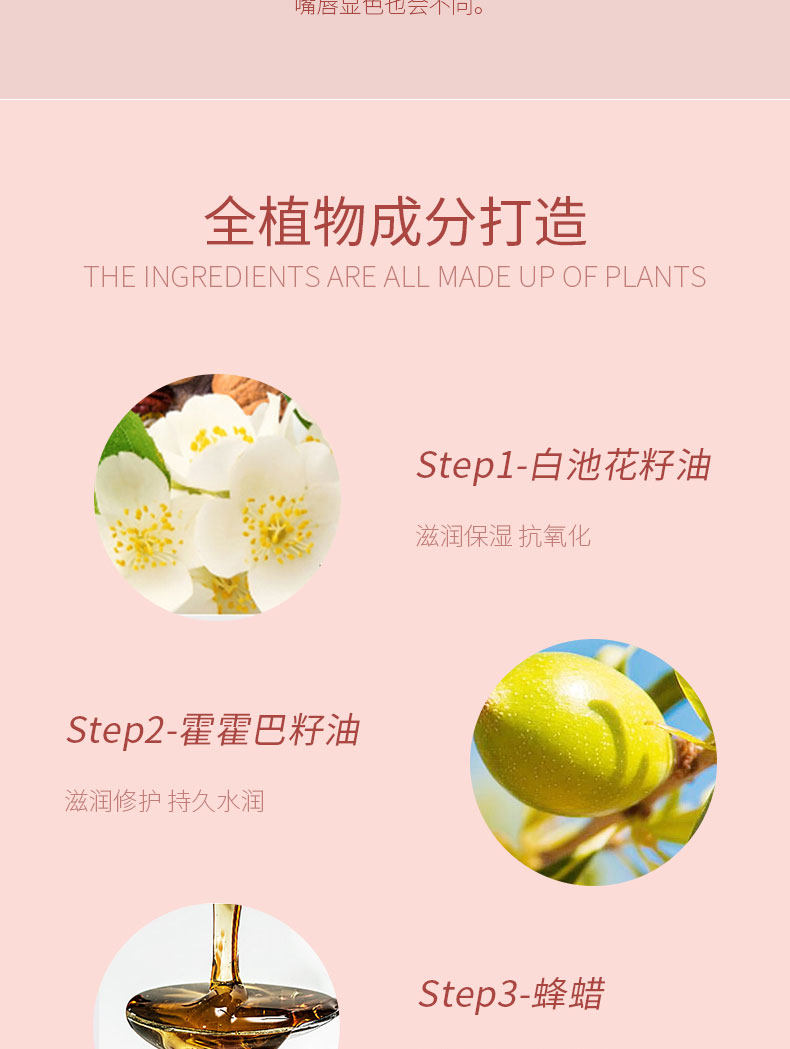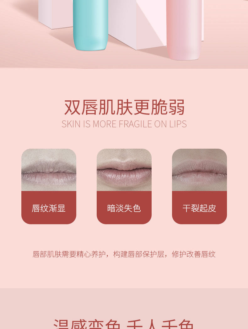 精选健康原材料,萃取天然蜂蜡和白池花籽油,持久保湿,增加唇部肌肤弹性,淡化唇纹,随温度变色,千人千色,打造你的专属唇妆!