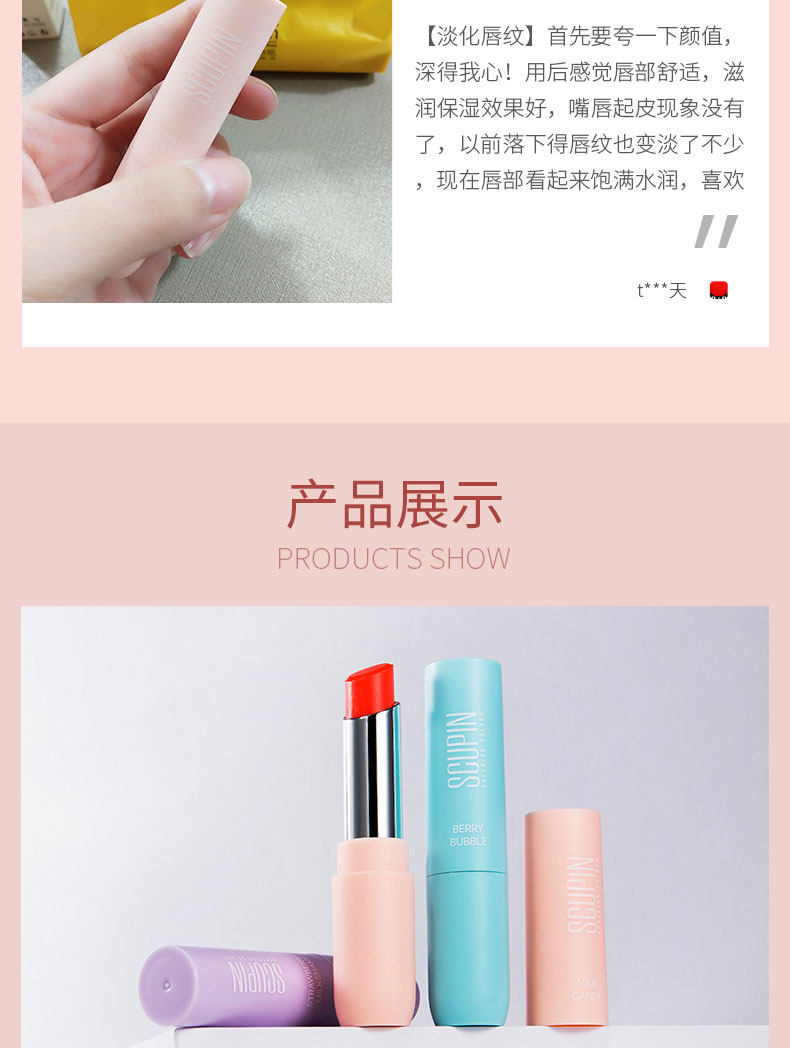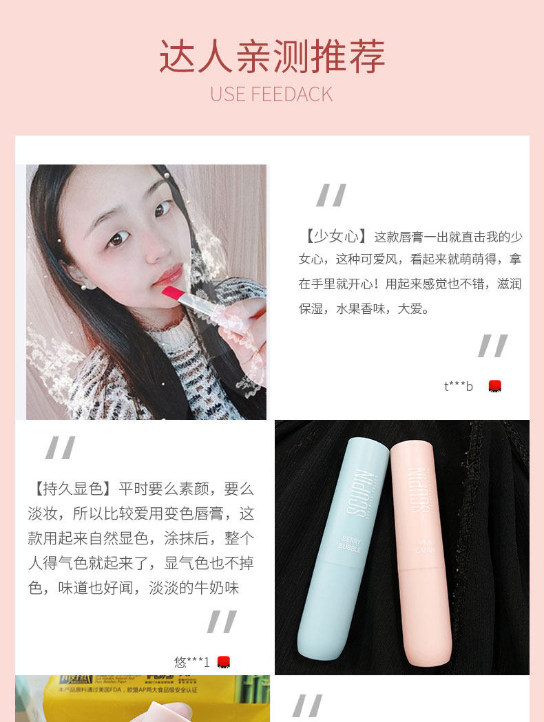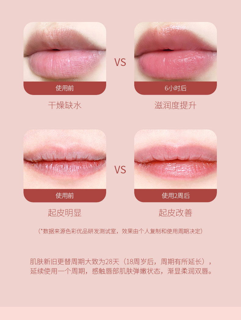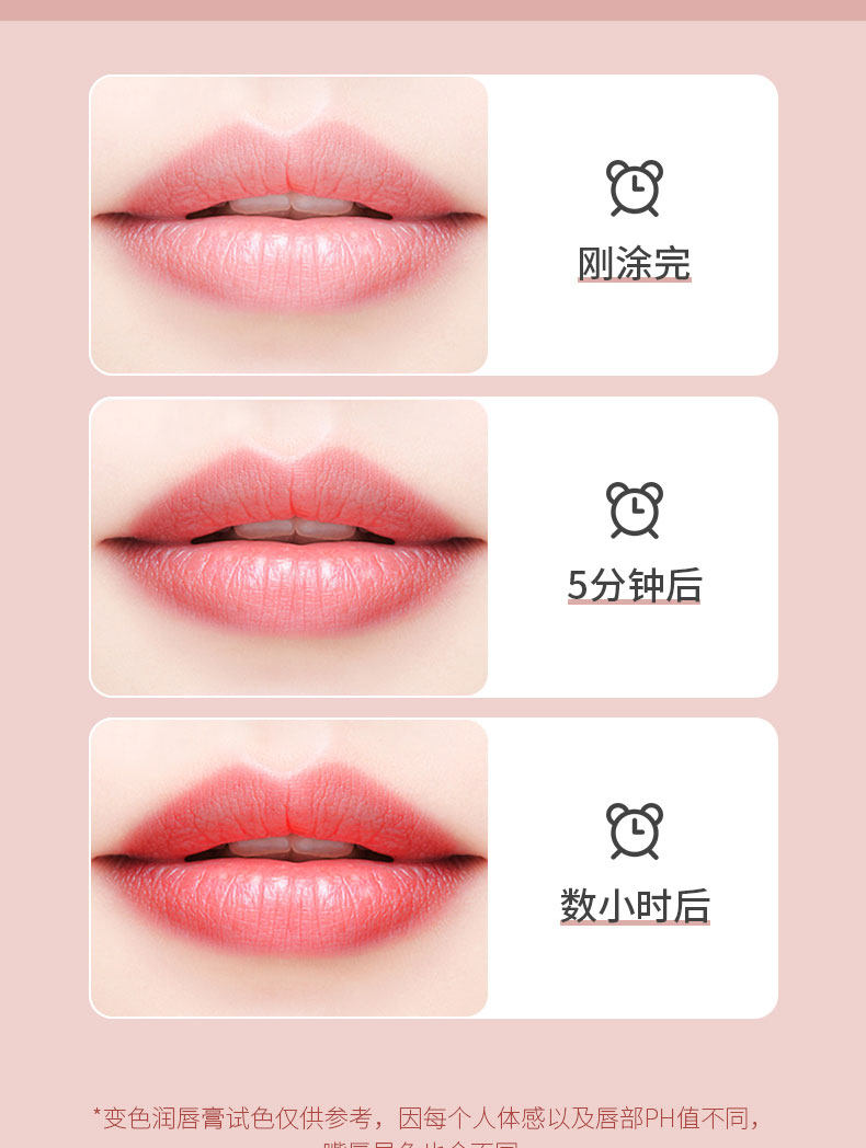 精选健康原材料,萃取天然蜂蜡和白池花籽油,持久保湿,增加唇部肌肤弹性,淡化唇纹,随温度变色,千人千色,打造你的专属唇妆!