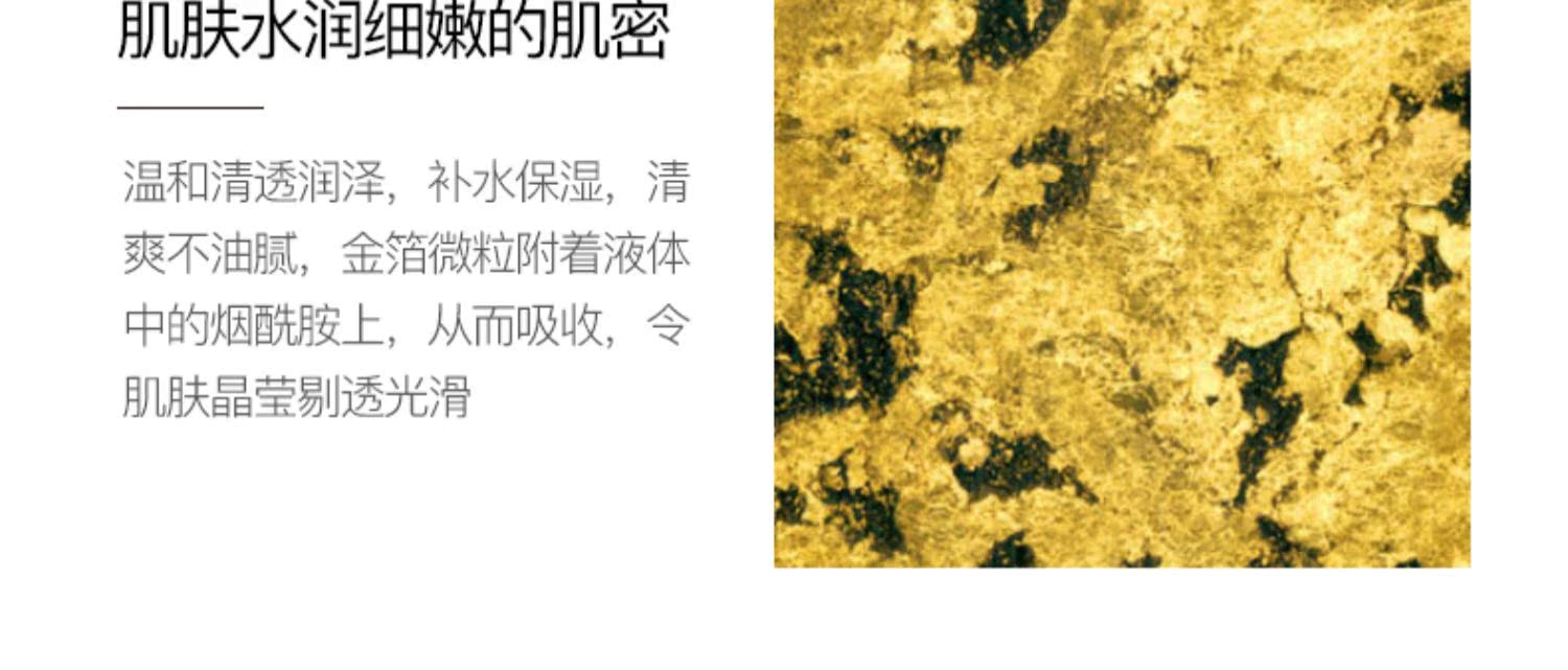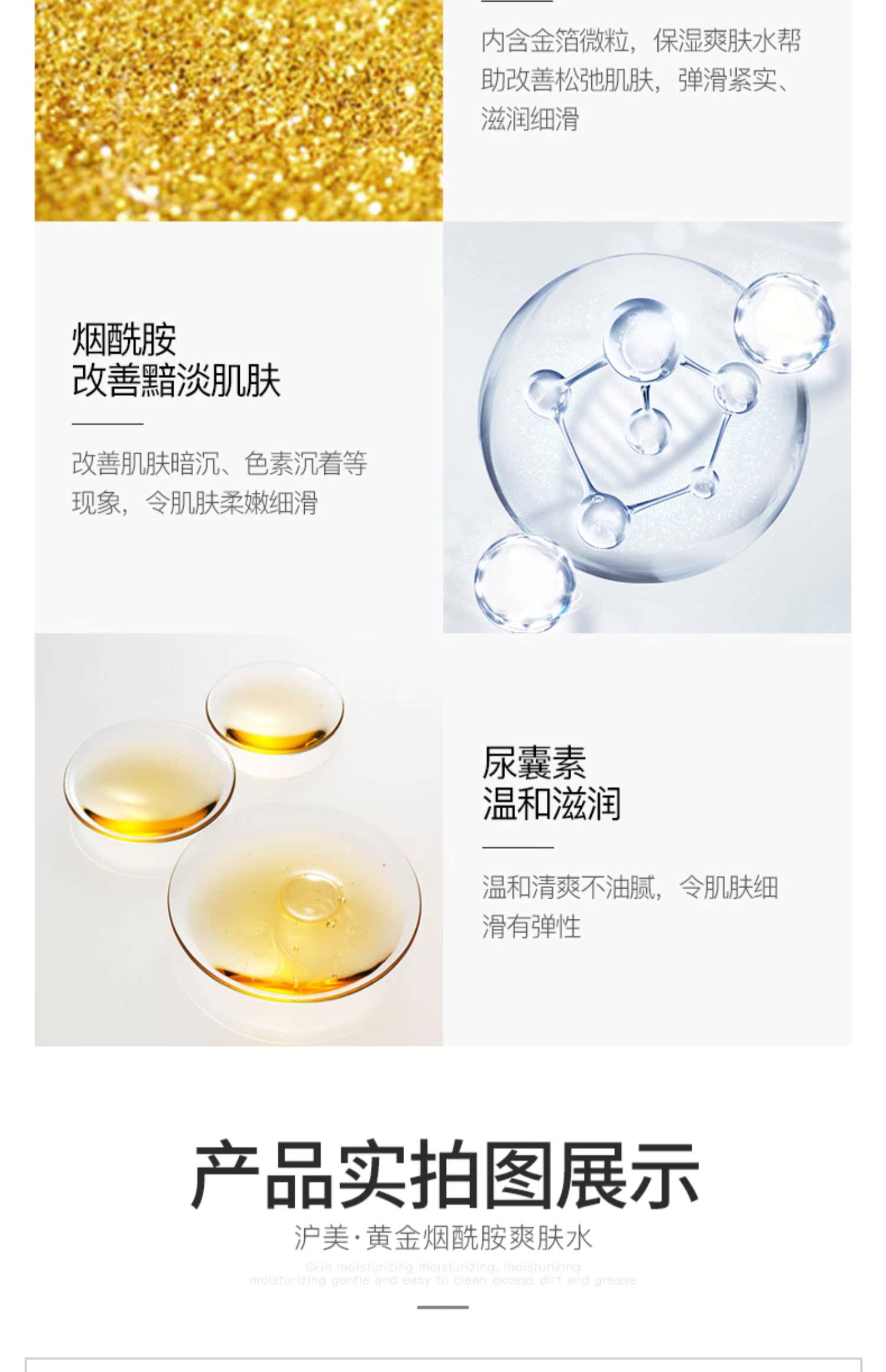 小红书爆款,黄金与烟酰胺搭配,在爽肤水的基础上加了含金箔成分,满满精华,淡淡的香味,促进肌肤吸收,带给肌肤面膜般的丰润,敏感肌孕妇宝宝都能用,第二天都嫩嫩的