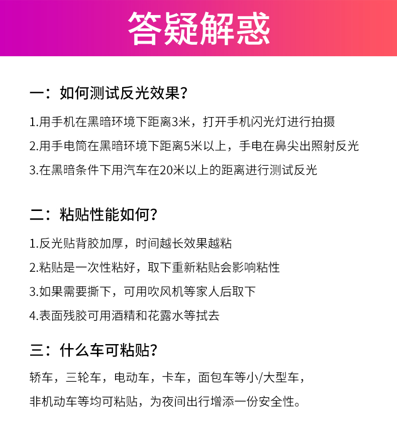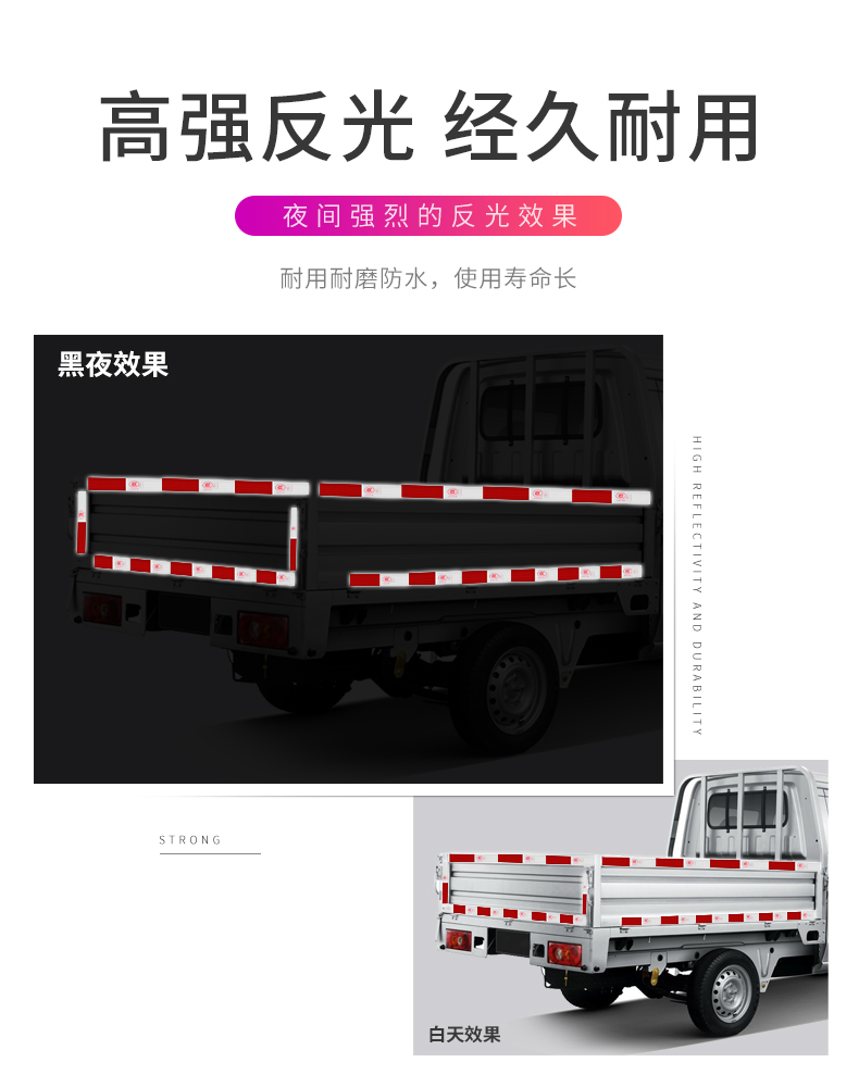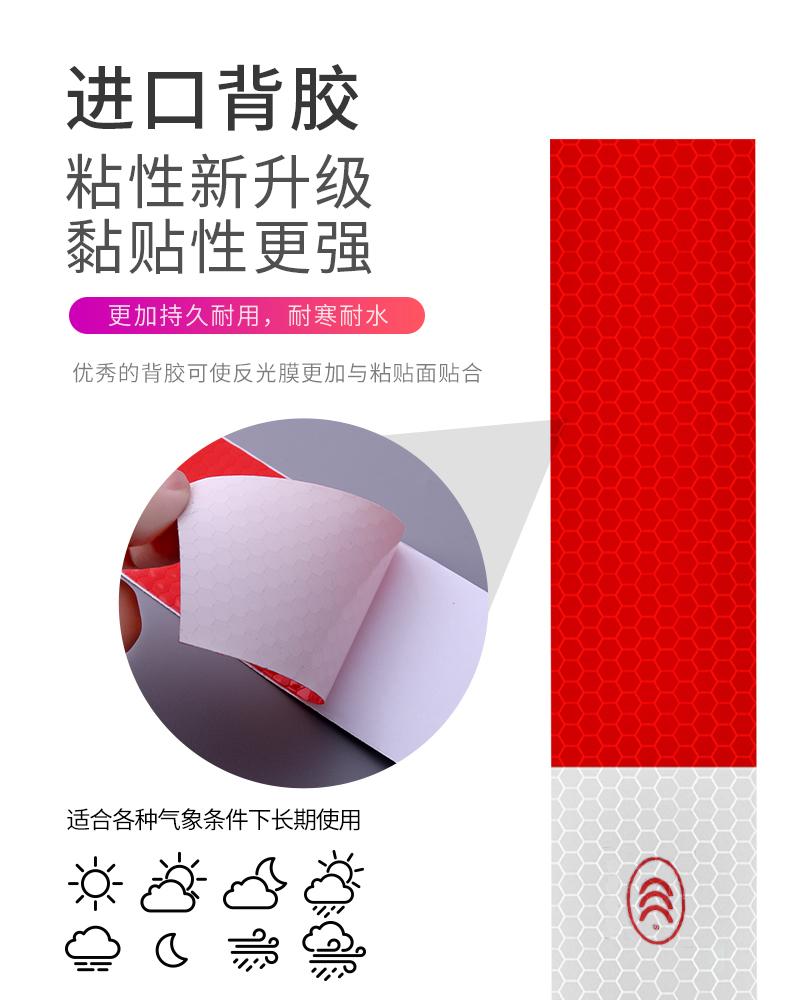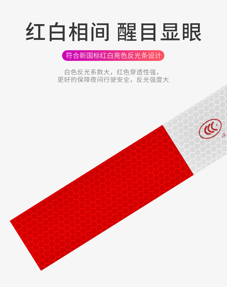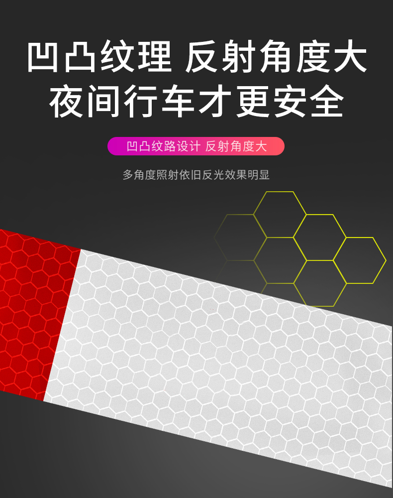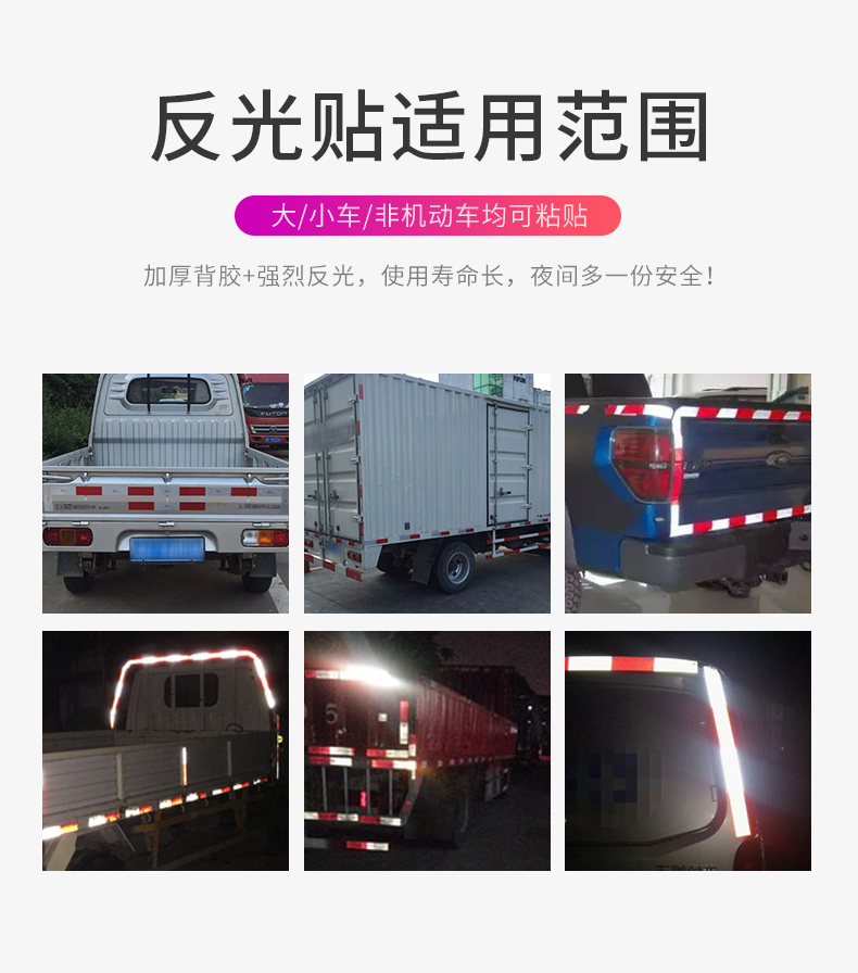 采用3M反光膜制作,自带背胶,即贴即用,操作简单。远距离光源照射下具有超强反光效果,保障夜晚行车安全!