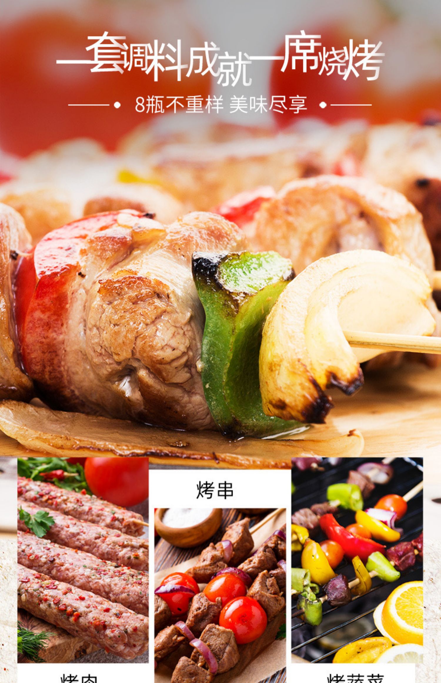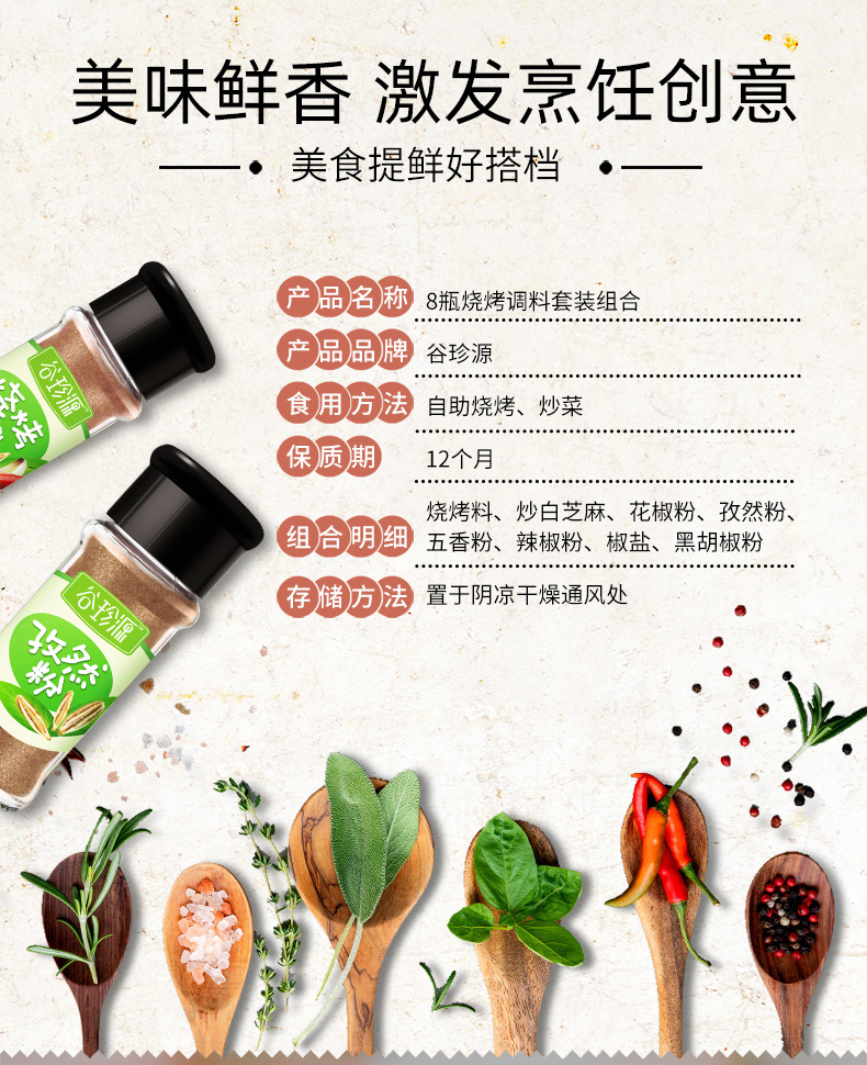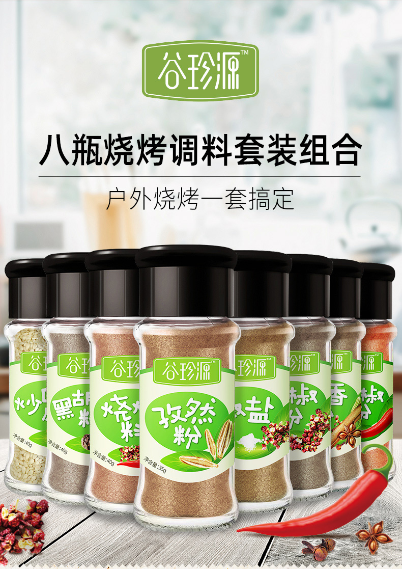 八味组合,口味不重样,随心搭配,地道正宗,烧烤组合,秘制调料,煎炒烤煮,厨房得力助手~样样都行,多种用法,户外烧烤家常必备。一套搞定,烧烤,做菜,都能用的上!