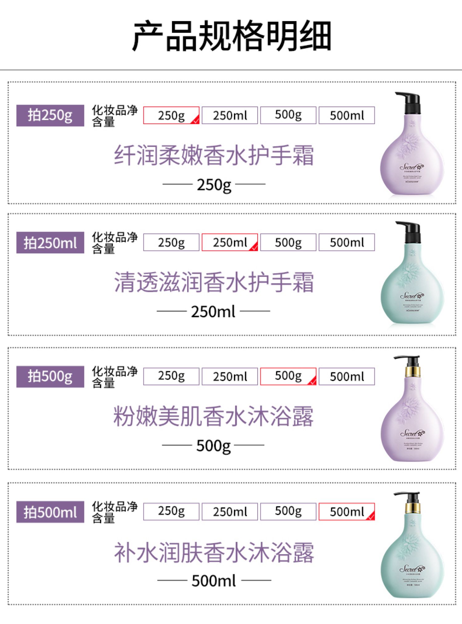 【拍4件才29.9元】采用丁香花,茉莉花天然植物花香,温和不刺激,淡雅幽香,滋润保湿,淡化纹理,修复肌肤,清爽不油腻,用完肌肤滑溜溜的,沐浴露,护手霜任选,超划算的哦!
