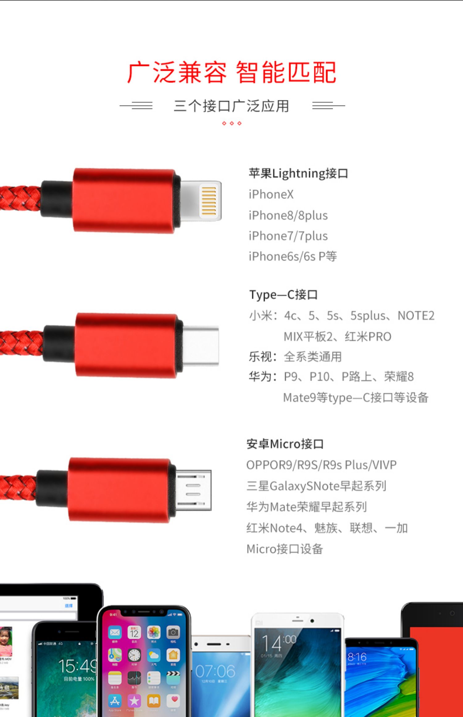 超实用的数据线,尼龙编织线,不易折断,充电效率大幅提升,让等待不再漫长,充电更省时!还有三个接口同时充电的,充电再也不用排队,出差旅行,一根线搞定!!
