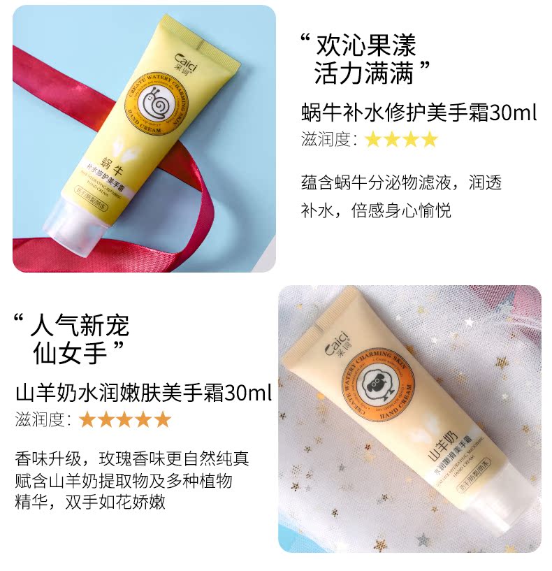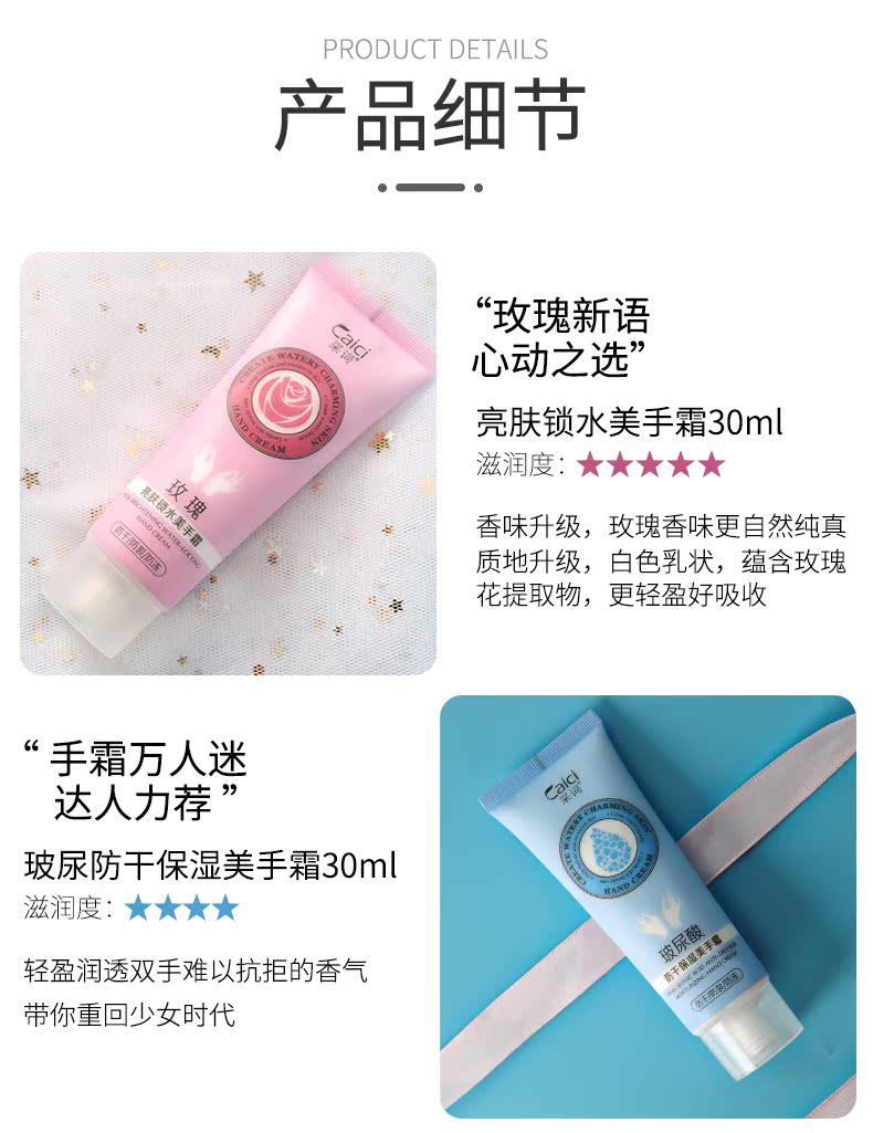 【采词80g*5支玻尿酸玫瑰山羊蜗牛护手霜】滋润嫩肤,改善粗糙肤质,延缓肌肤衰老,加快细胞代谢,草本成分,精雕细琢,润泽梳情,让你手润如花,散装,礼盒装,两种规格可选。