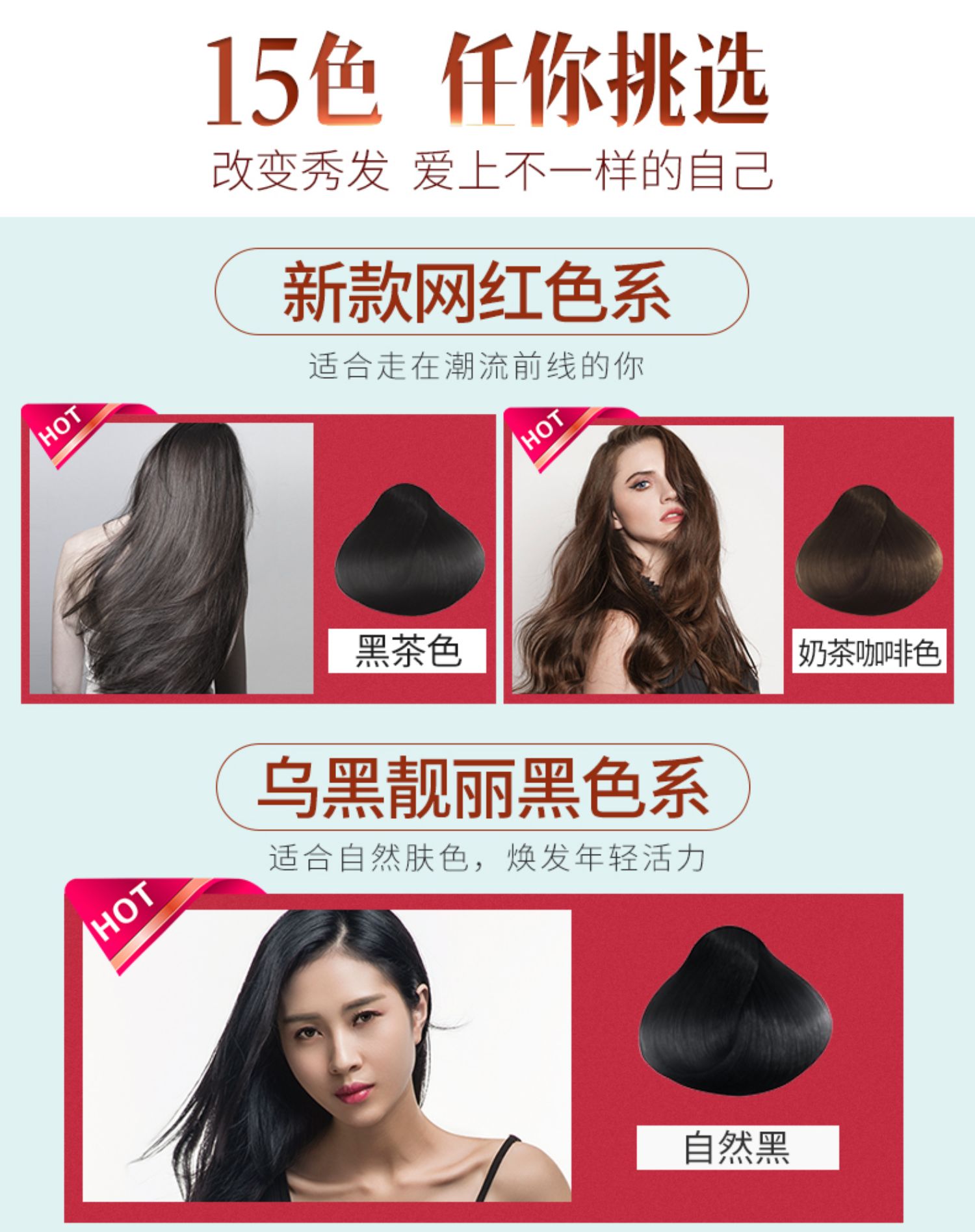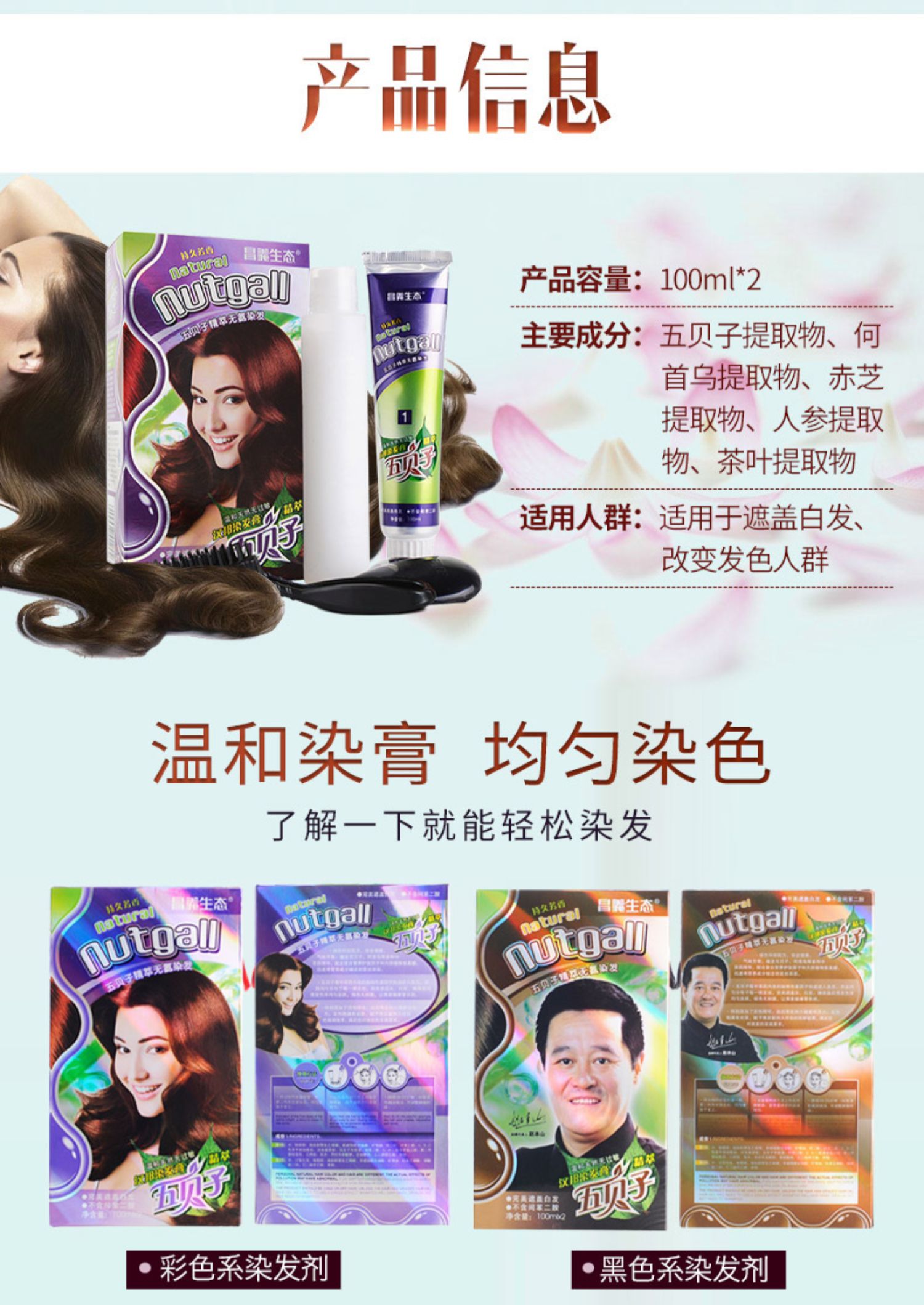 【昌义生态】纯五贝子精粹染发剂,无异味,无刺激,不粘头皮,染完不伤发,天然温和,染发操作便捷,13种颜色可选。