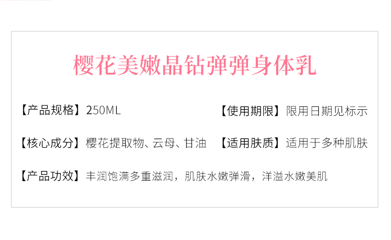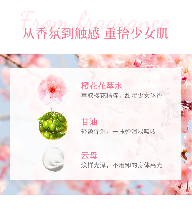 【9.9秒杀】天然云母微粒,自带细微金闪,涂抹后就像给身体打了高光一样,含有维生素E、胶原蛋白成分滋润每一寸肌肤,拉丝弹力质地,法式樱花香氛,让你拥有初恋般的少女神味道~