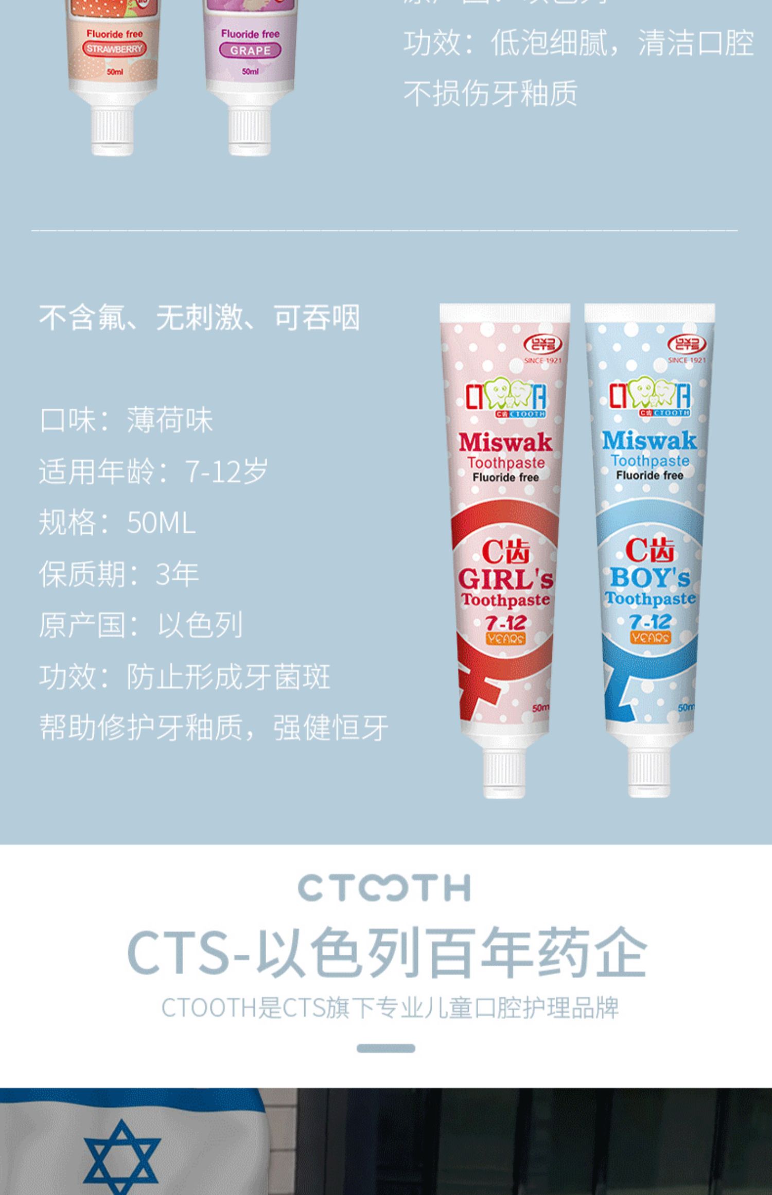 可吞食【第二件0元】线下屈臣氏有售,屈臣氏都是29一支,以色列原装进口品牌牌CTOOTH,C齿2-6,7-12岁儿童牙膏水果味无糖可吞食不含氟,全球top20的药企,在以色列连续5年销售第二值得信赖