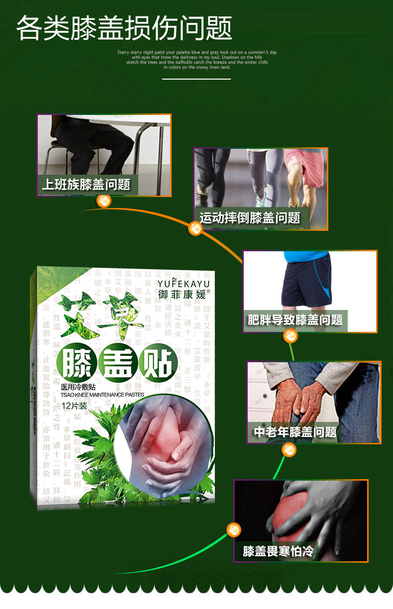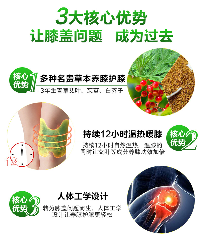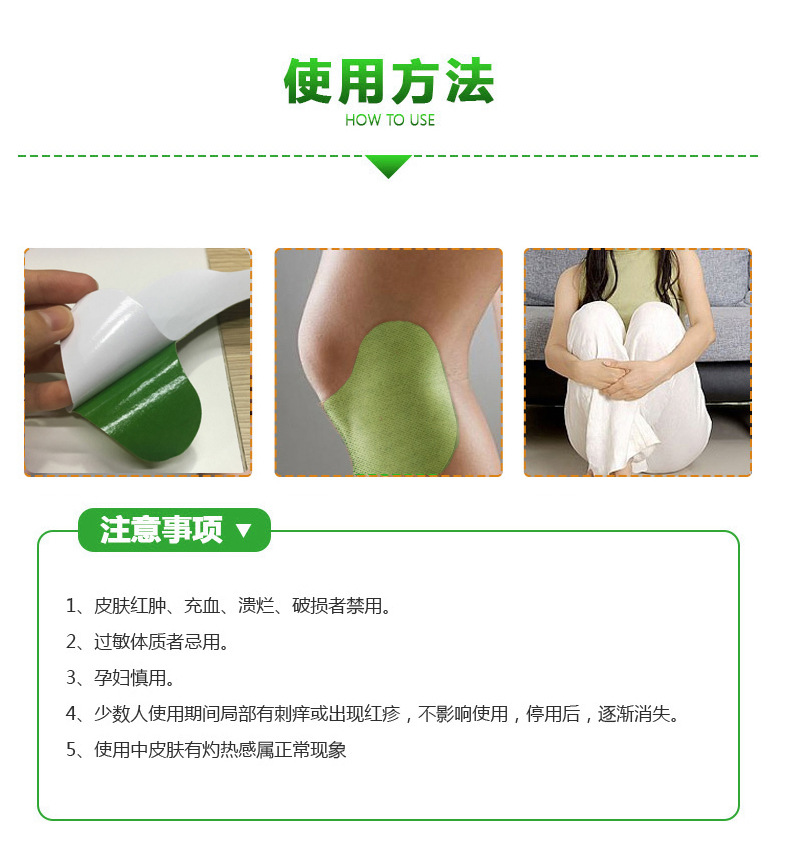 供各类膝盖损伤者使用:运动损伤、上班族、身体肥胖、中老年人,专为膝盖部位贴敷、完美包裹膝盖、不影响膝关节各种运动。买两盒发三盒,超级划算。