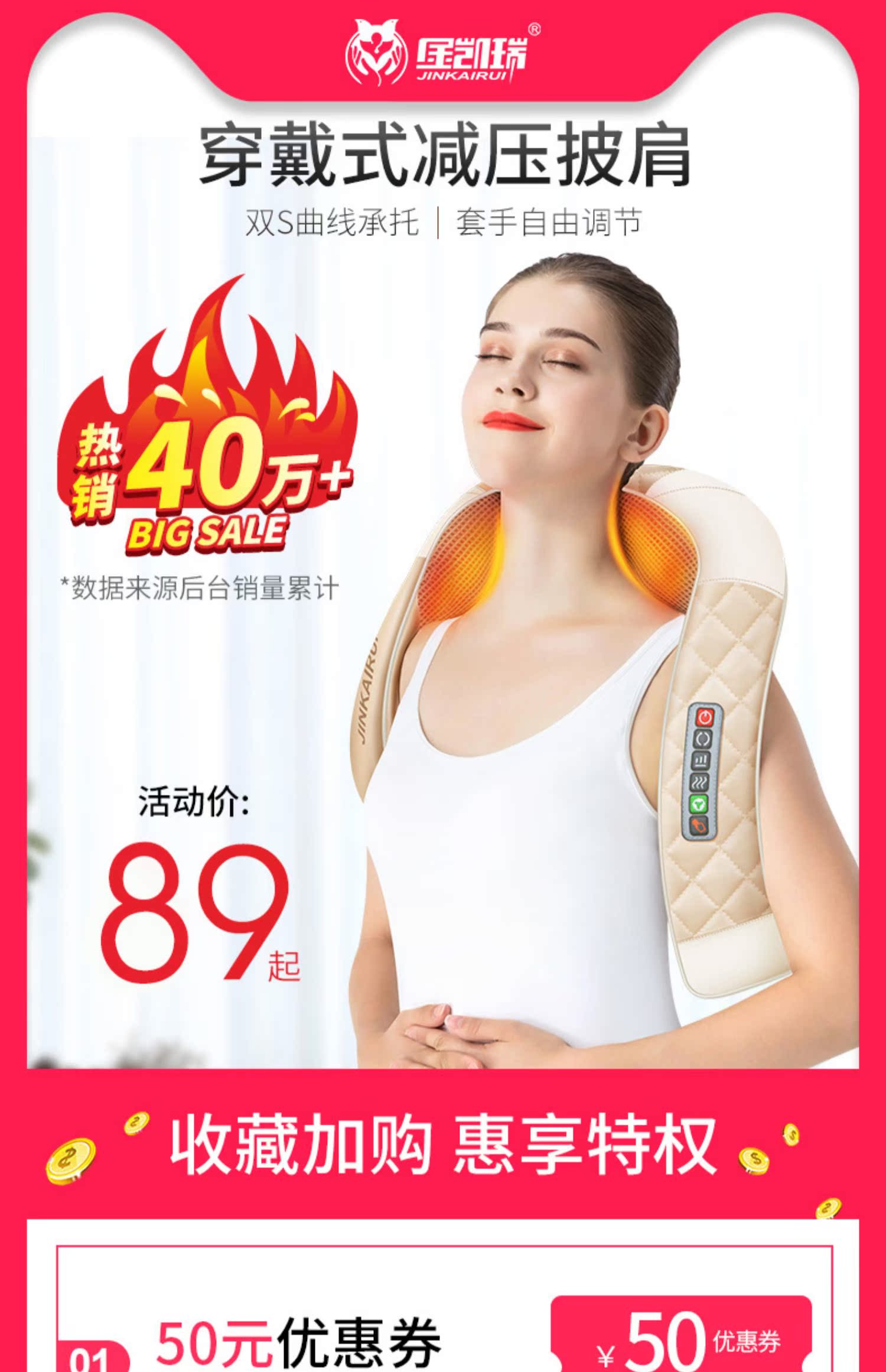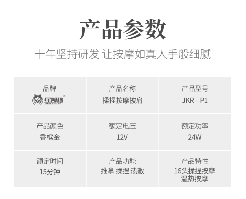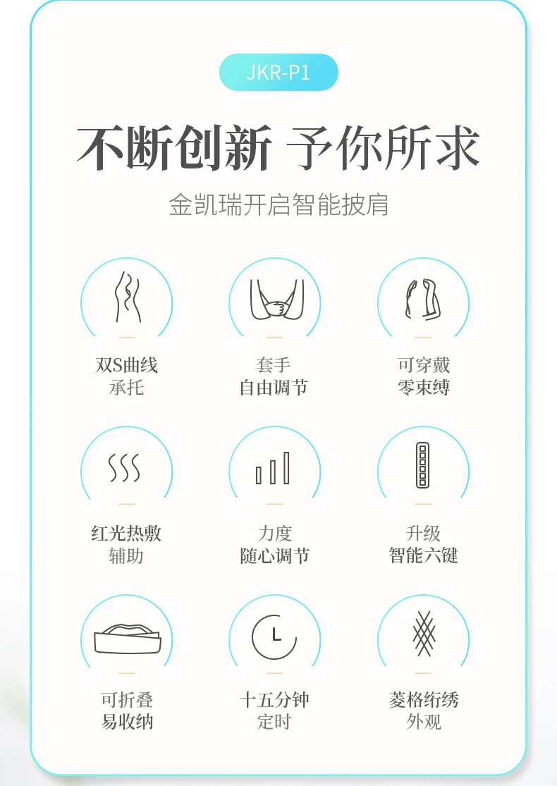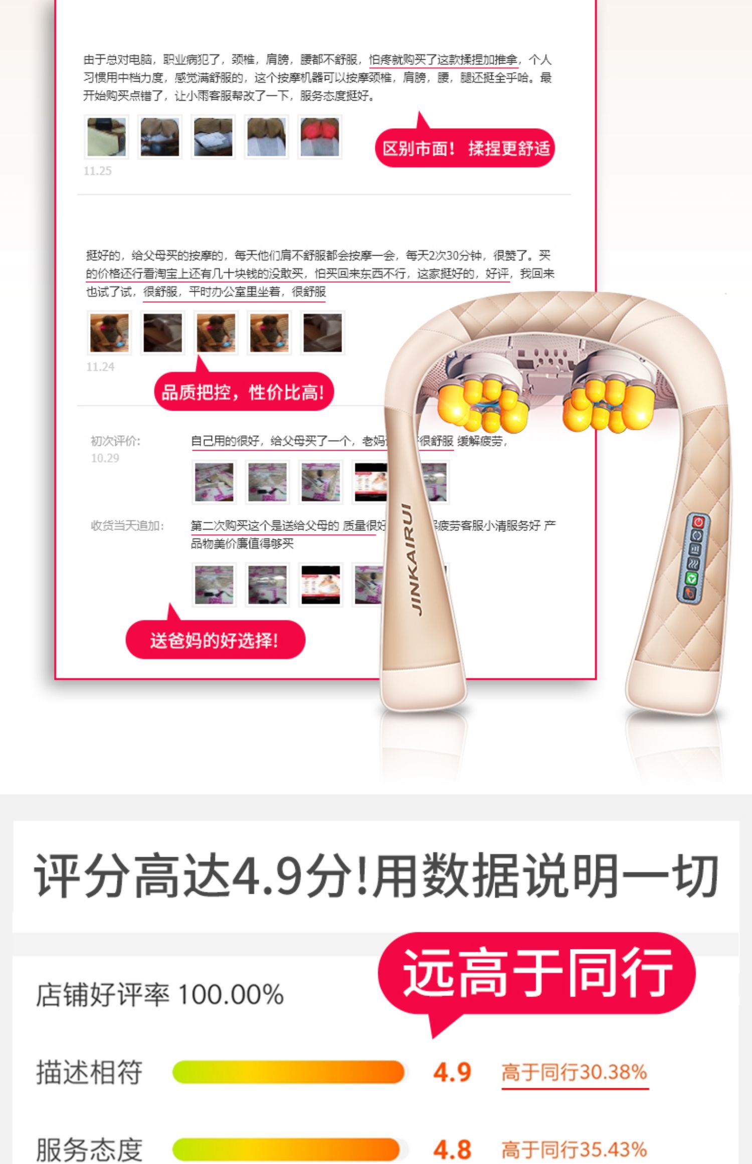 按摩披肩的外观特别的有档次!耐用的皮革面料,柔软透气,有了它真的是解放了双手,真人手法,舒适自然,腰、颈、腿、肩全身可用!累了一天放松放松真的是舒服了,可以满足一个家庭对按摩仪的期待呐~