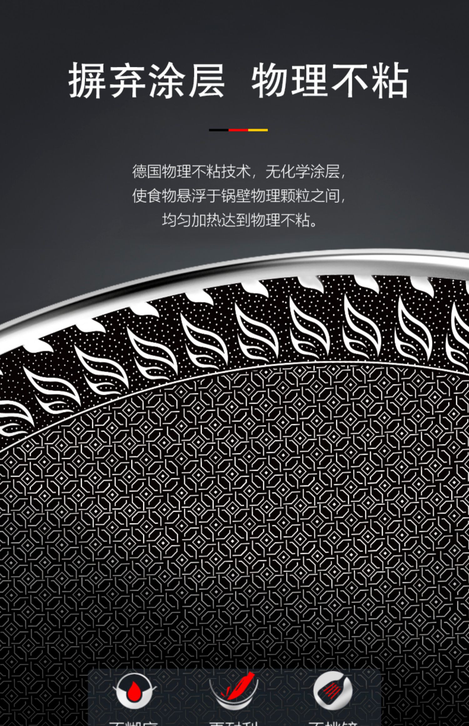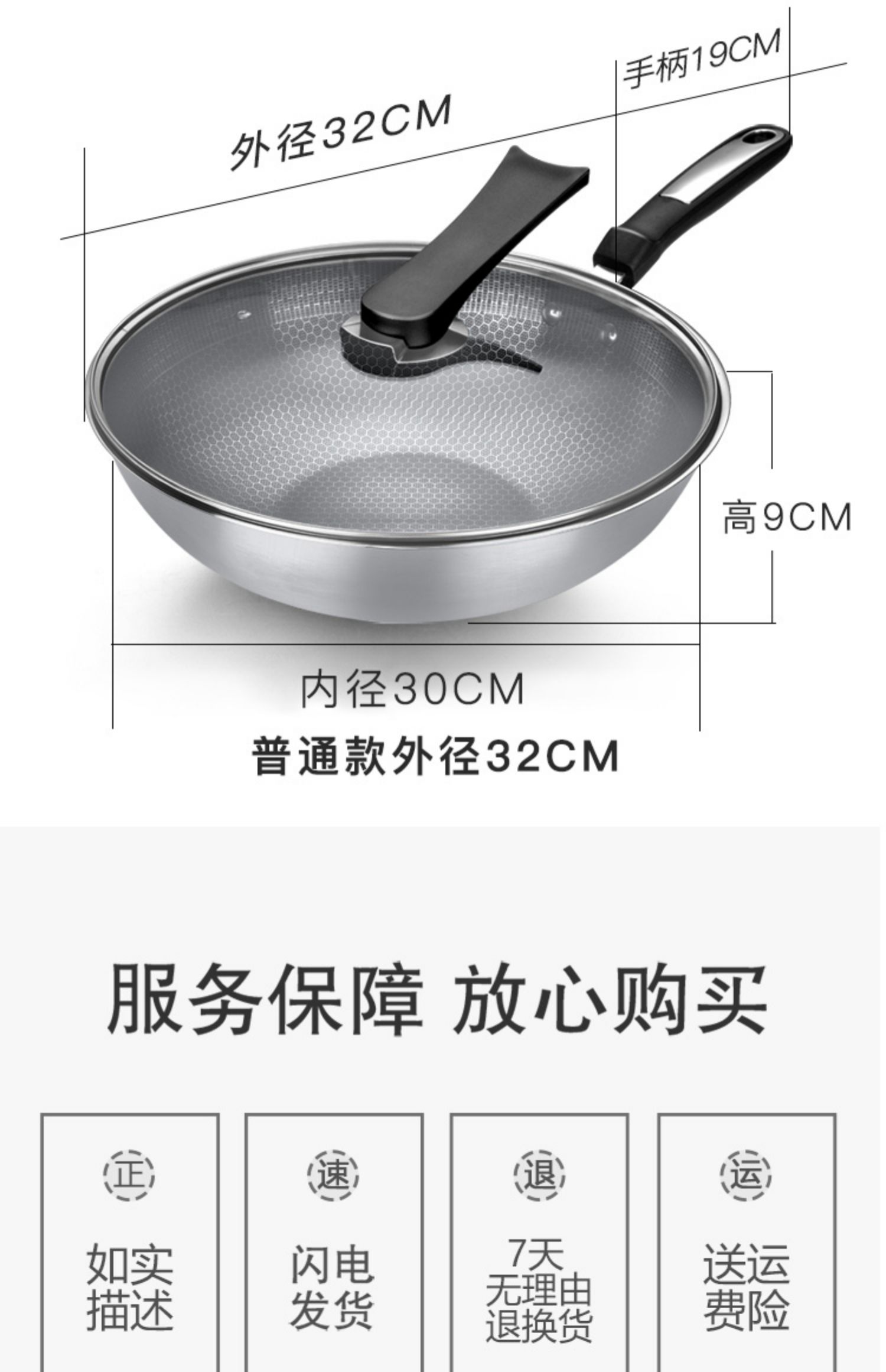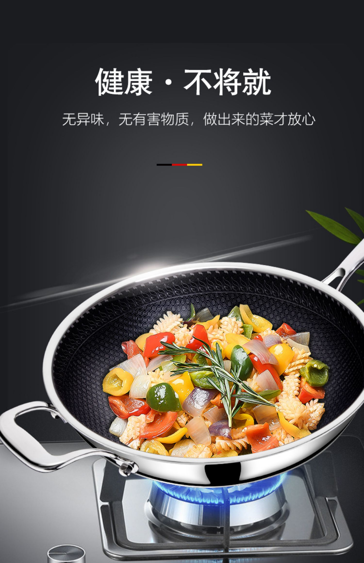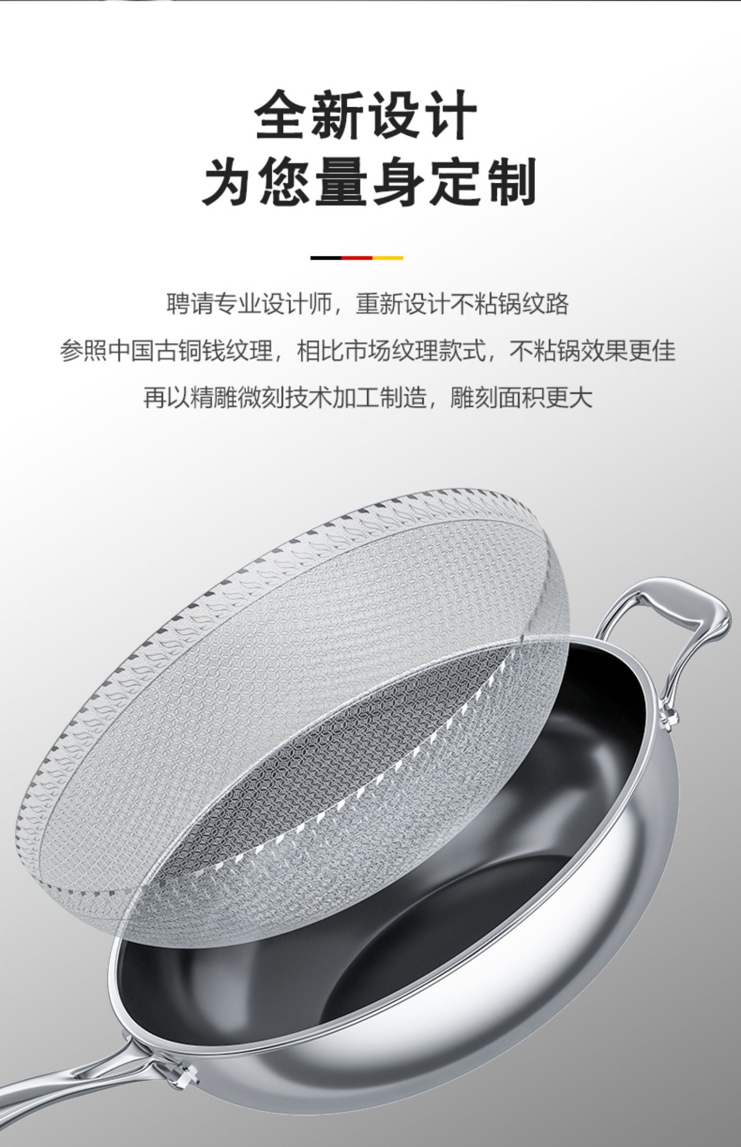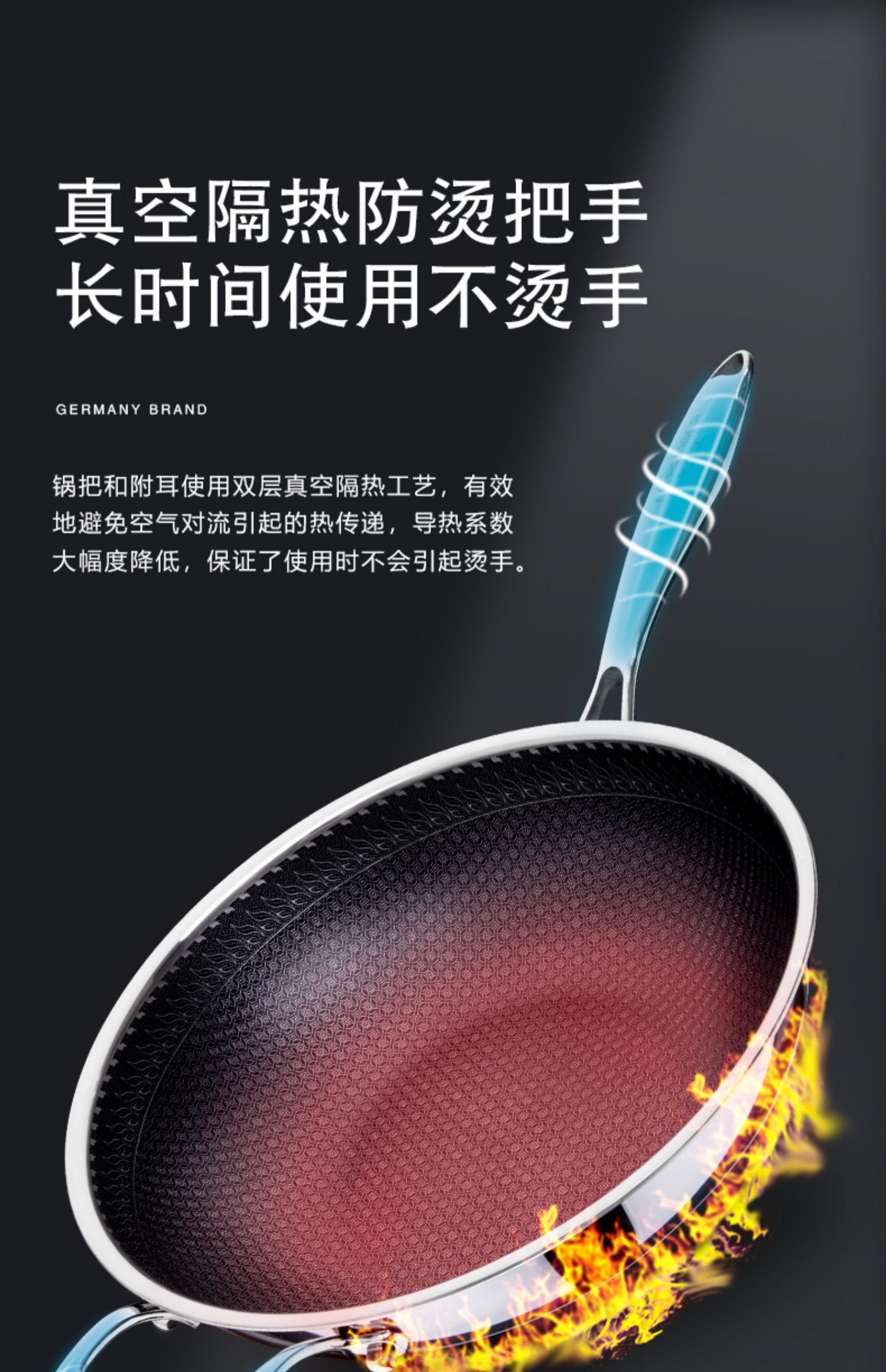 源自德国技术,厨具全蜂窝保护网不粘锅,无涂层,快速匀热,无烟不粘。迅速温热,高效节能,煎炒两用。食品级304不锈钢。电磁炉燃气通用~~【赠运费险】