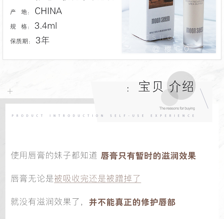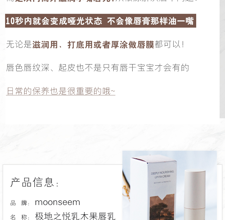 Moonseem极地之悦润唇膏,乳木果唇乳口红,保湿滋润补水,天然植物萃取成分,比唇膏更滋养,软化角质,妆前打底,日常滋养,一棒搞定,清爽不油腻~!