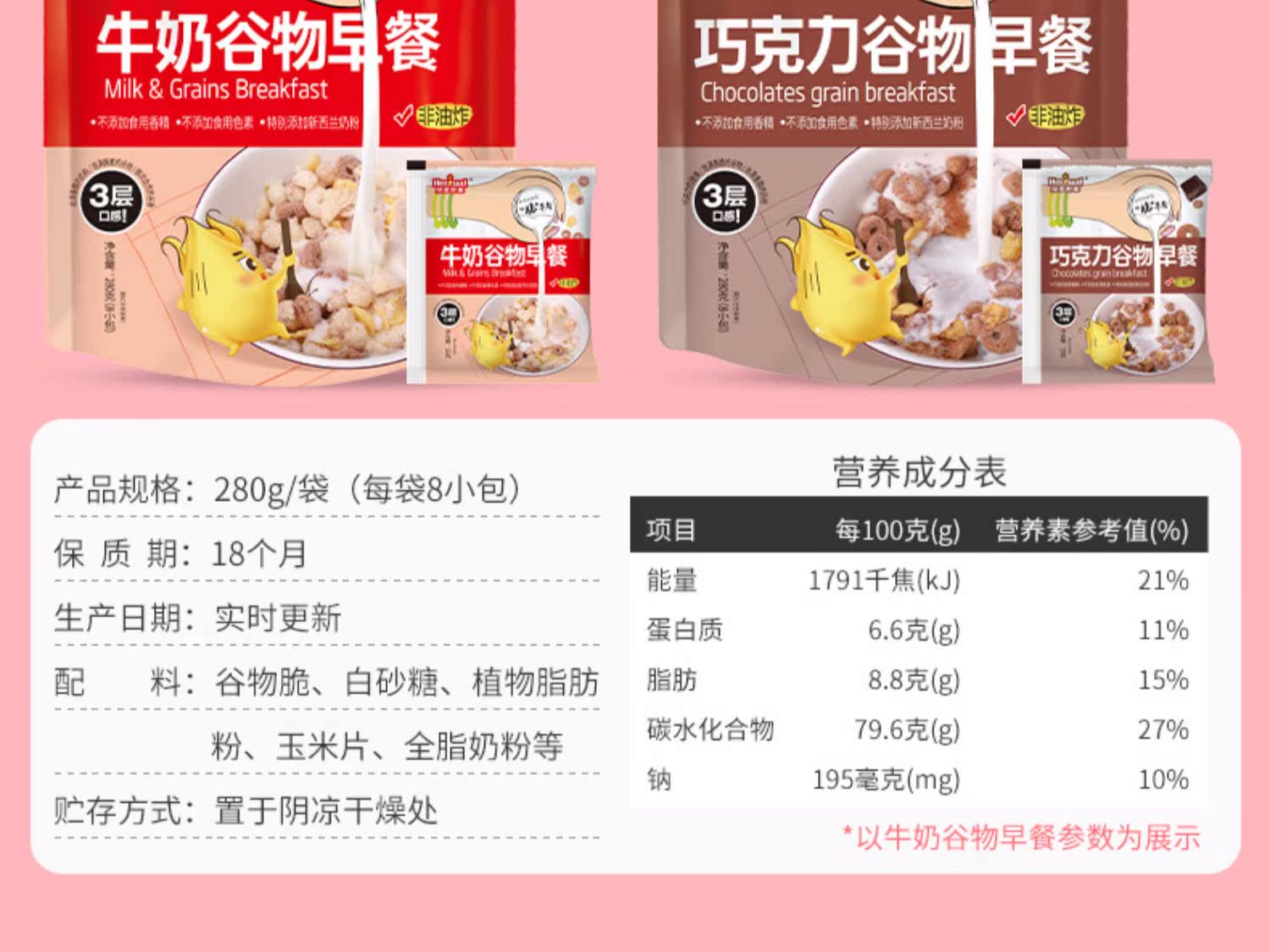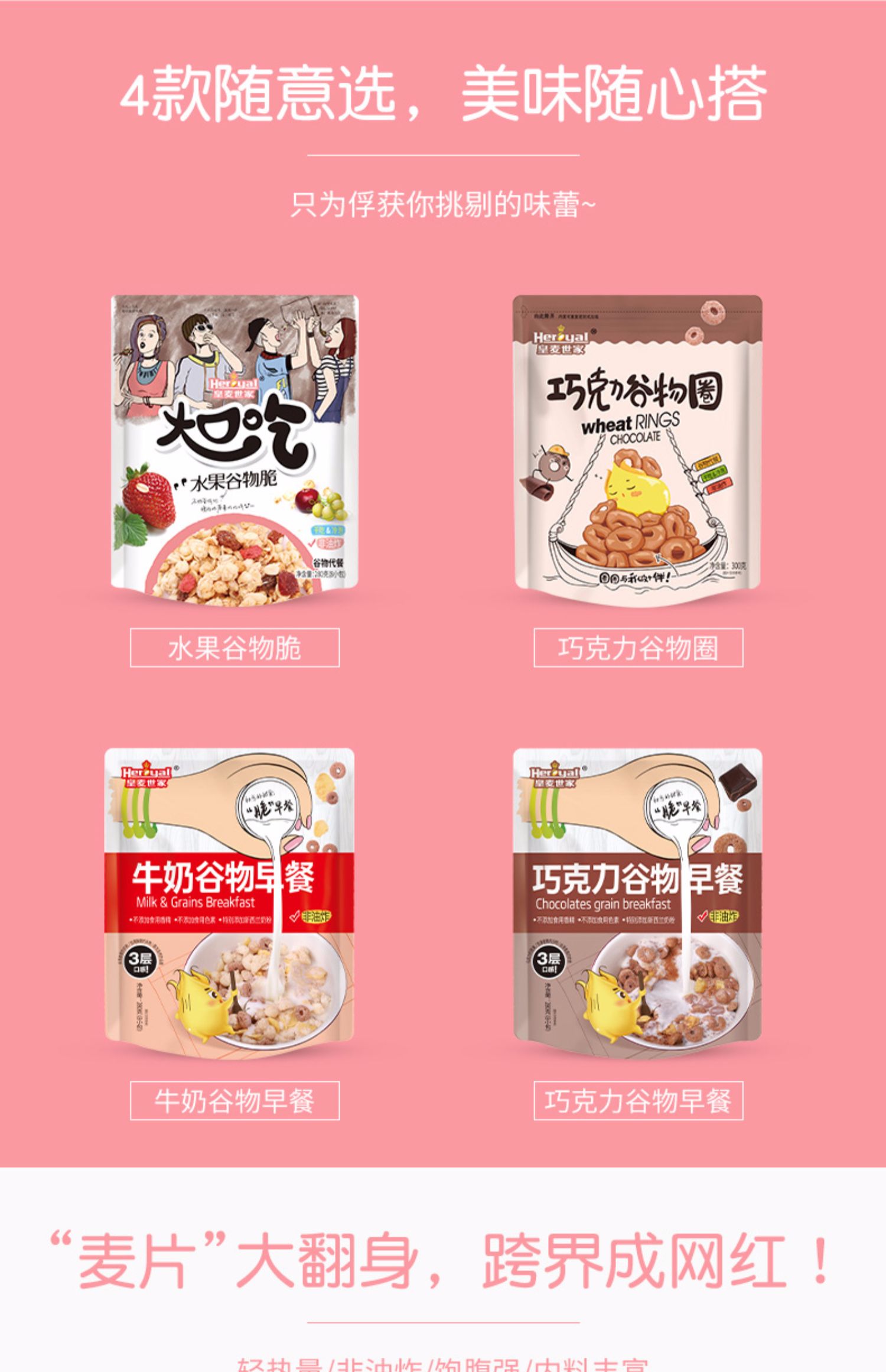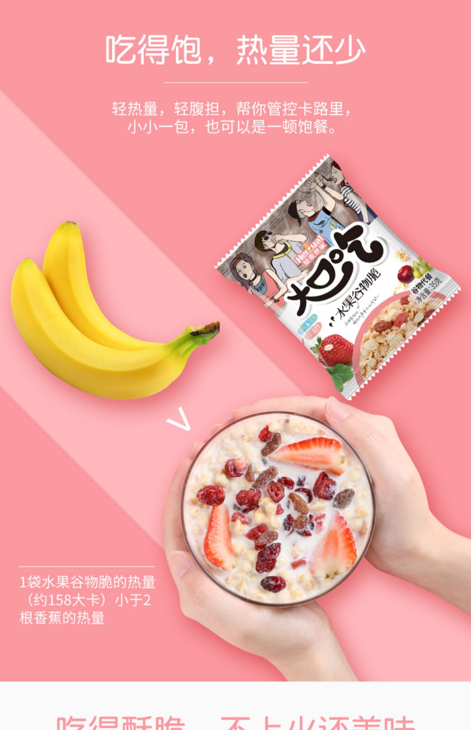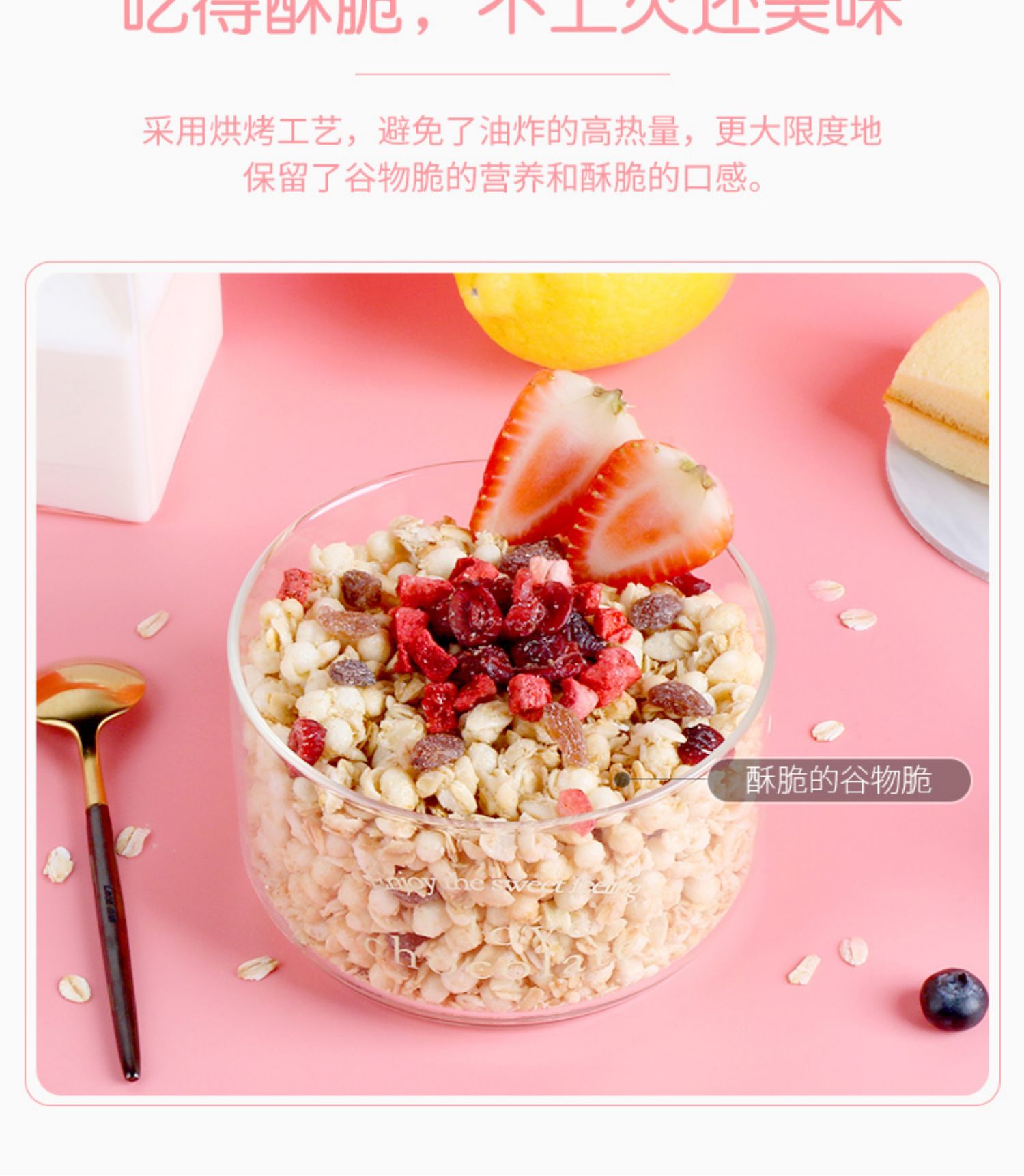 拍2份!拍2份!第二件0元。网红美味都在这。网红谷物脆4款任选。采用烘烤工艺,避免油炸油腻的高热量。更大限度地保留了谷物脆的营养。