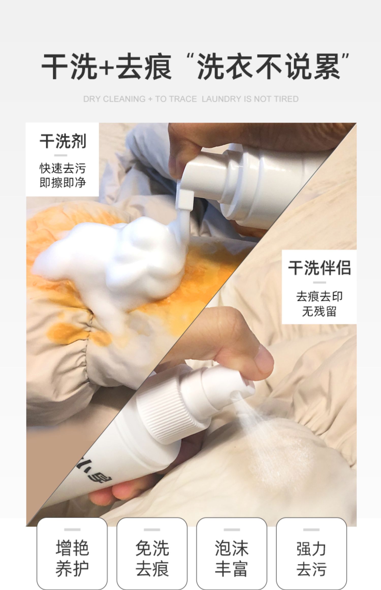 【满2件7.5折】买一送一,羽绒服干洗剂,食品接触级清洗剂,无刺激性,轻轻一喷,无需水洗,快速去污,抗静电+柔软布料,养护合一。