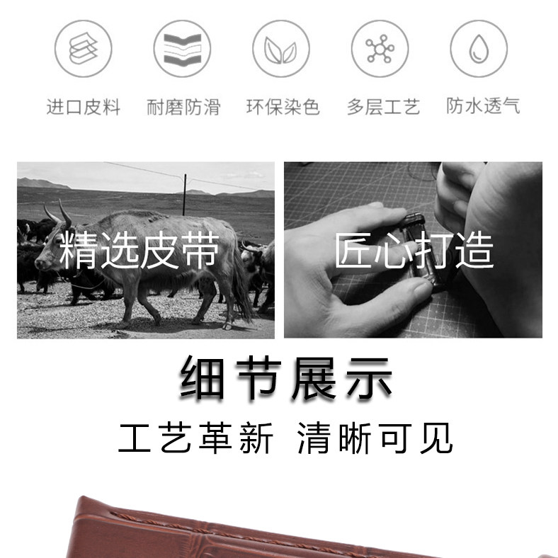 品质表带,手工定制,舒适透气防水,双按自动蝴蝶扣表带,精致头层小牛皮表带,国际化工艺标准,重塑腕间质感,名表配置,优质精钢,新颖中透着匠心精神,推陈出新的设计理念【赠运费险】