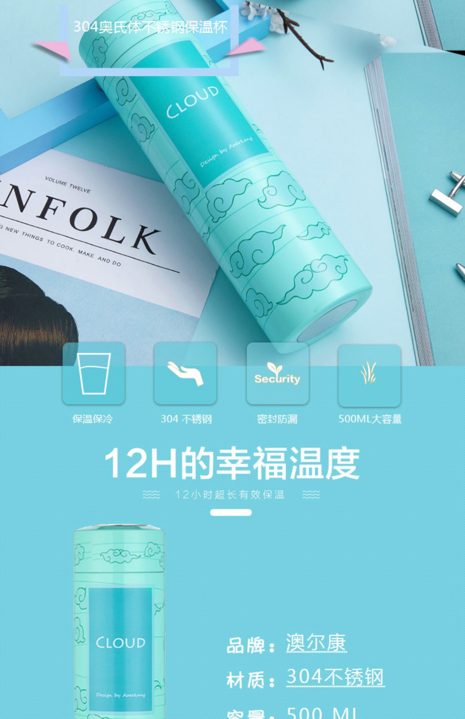 【一杯双盖,抖音爆款】食品级304不锈钢,高颜值,大容量,真空保温,持久24小时,从内到外,细致入微,清新文艺,时刻呵护,温暖相伴,放心喝水!