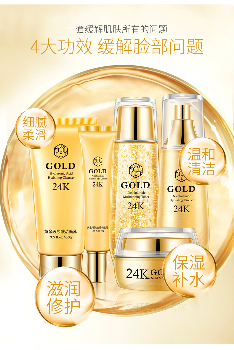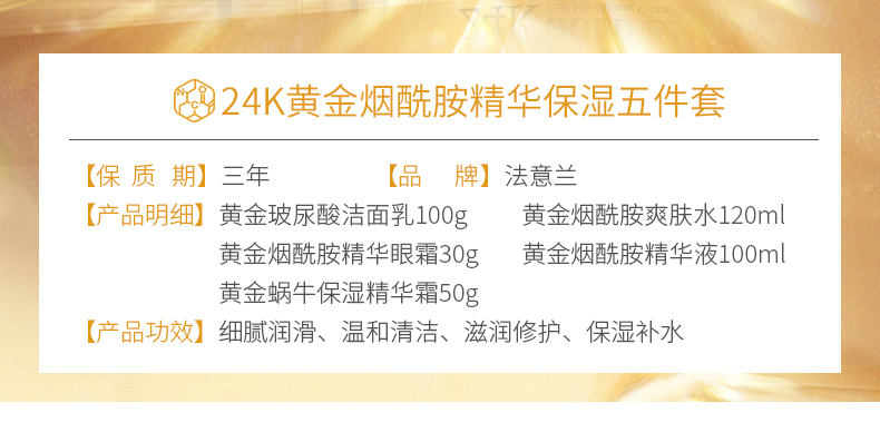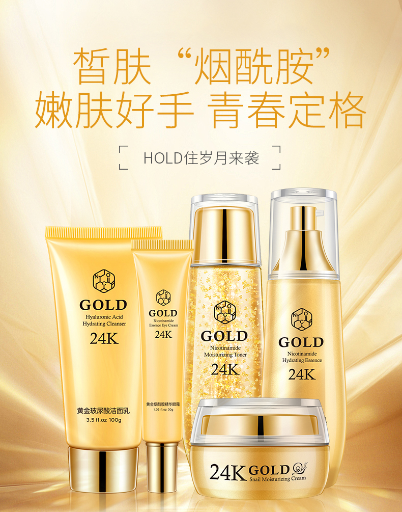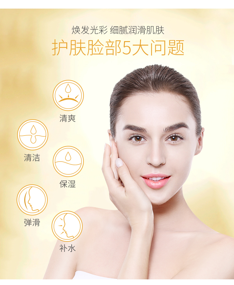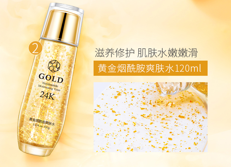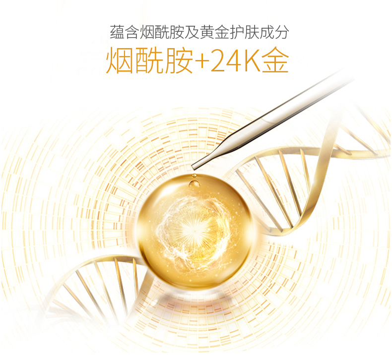 甄选高品质黄金嫩肌原料,无重金属、酒精、矿物油等成分,烟酰胺+24K金,改善皮肤初老等问题,保湿补水,清爽滋润不粘腻,让你重返18岁,留住时光美肌!