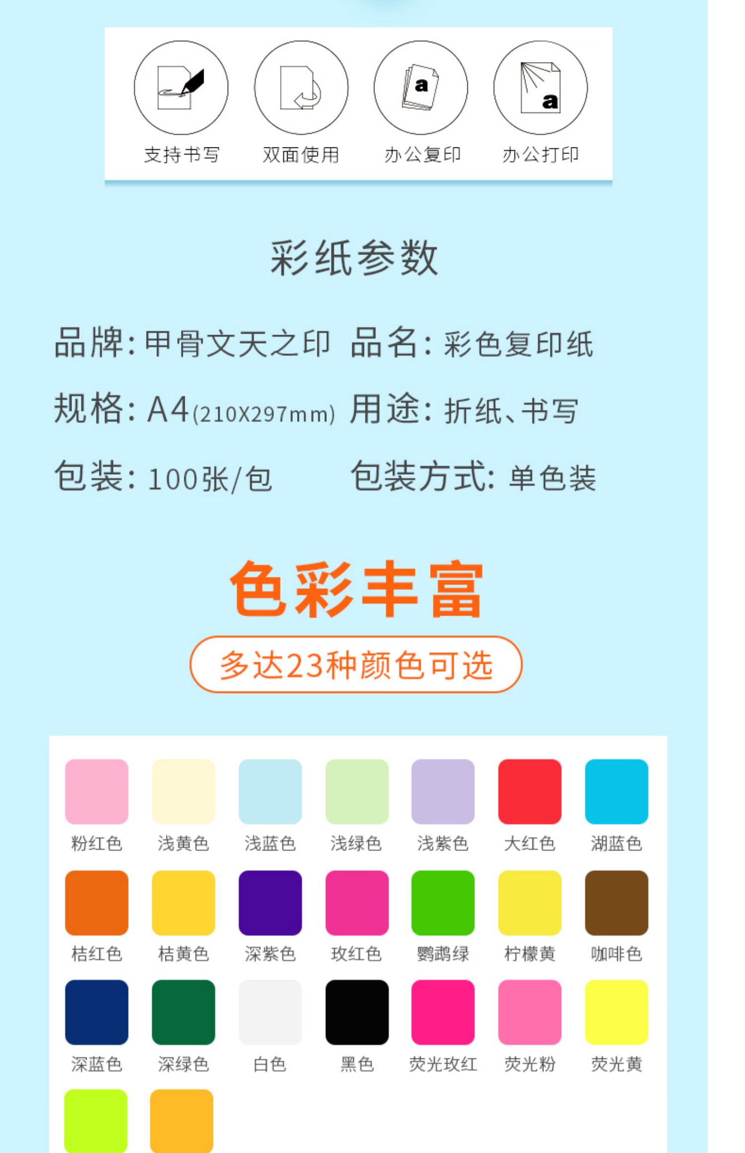 甲骨文天之印200张A4彩纸、折纸(a4粉色100张十色彩纸100张)超值装只要5.9元,文件打印复印,做封面折纸都非常棒,绚丽多彩,软硬适中,无粉尘杂质~