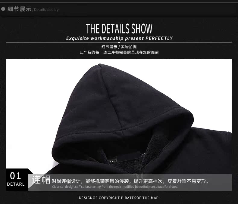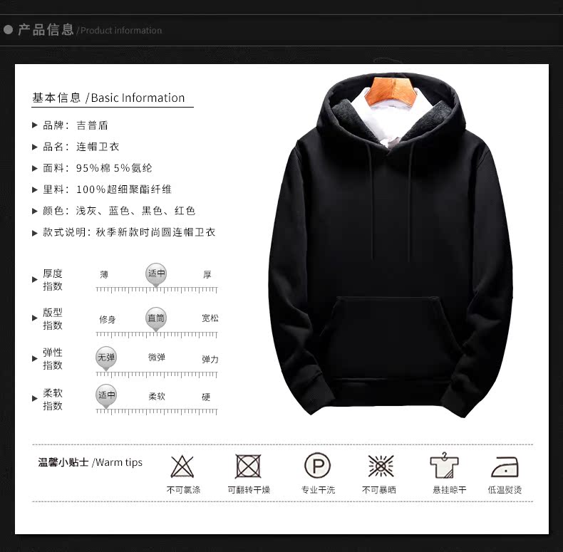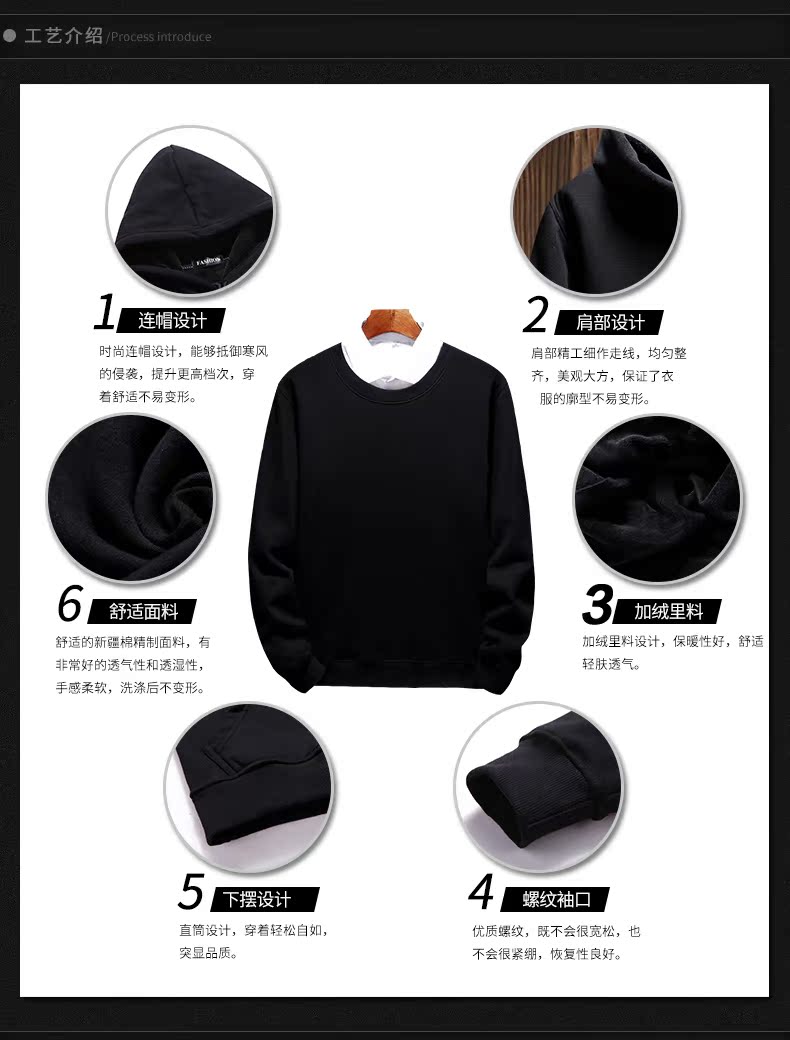 采用95%加绒纯棉面料,不起皱,不变形,穿着舒服又保暖~时尚连帽设计,不进风,上身潮流又好看!