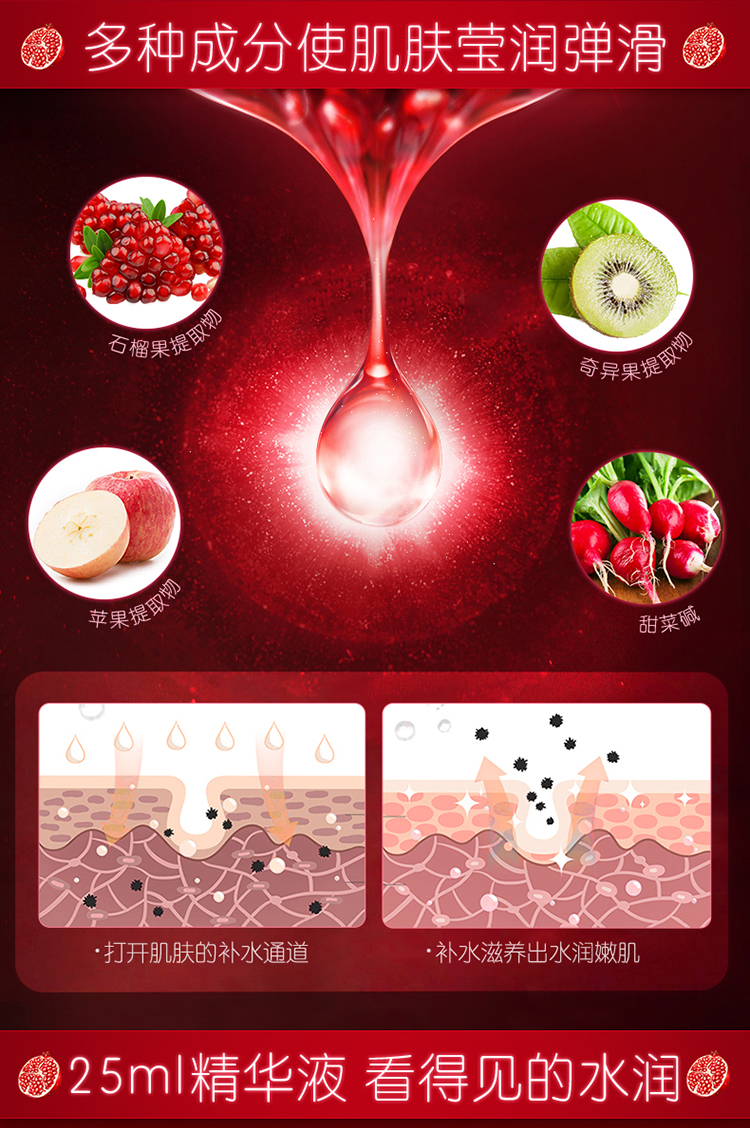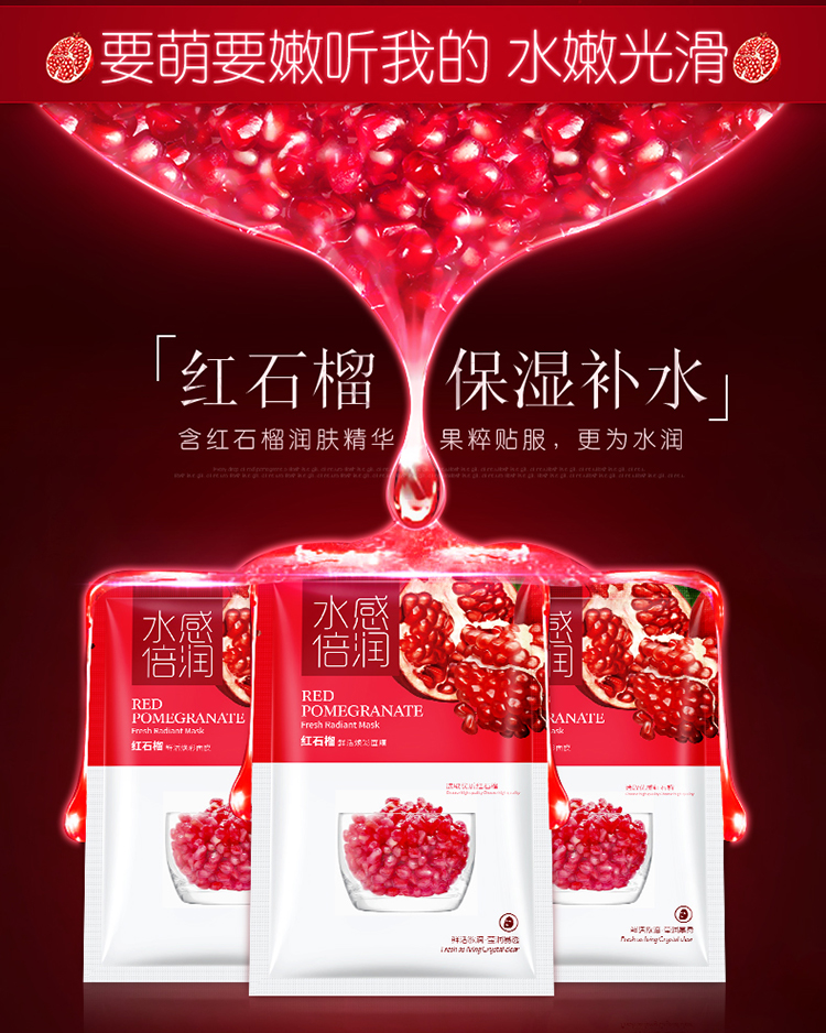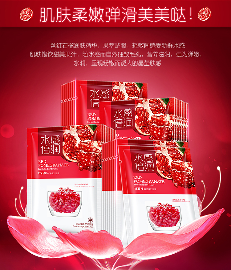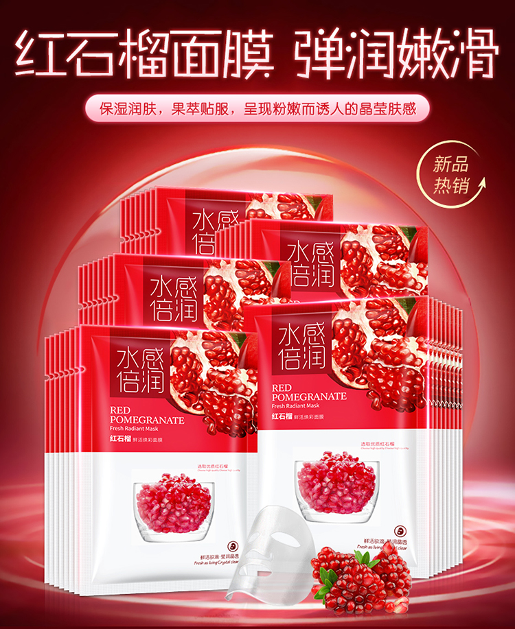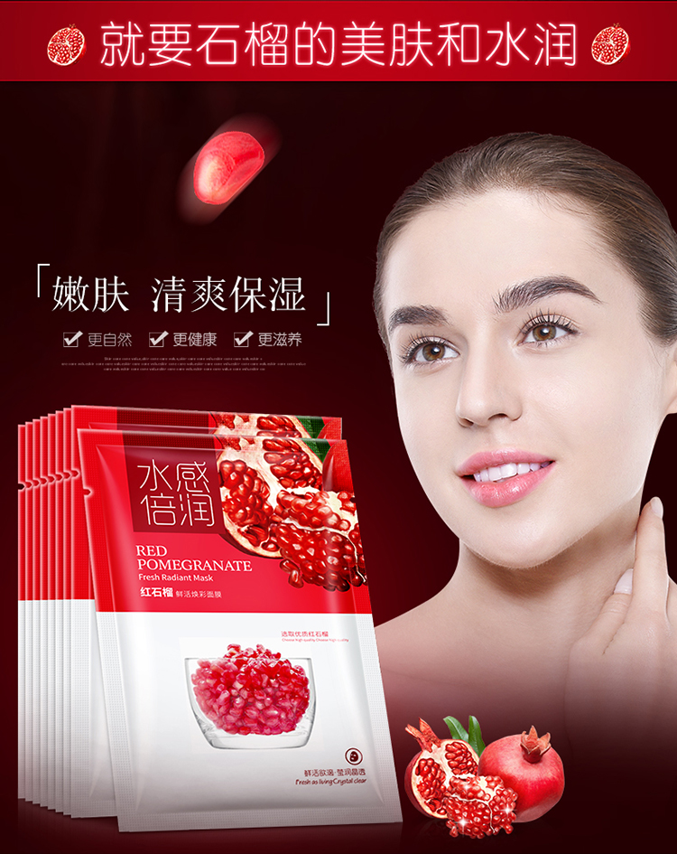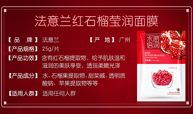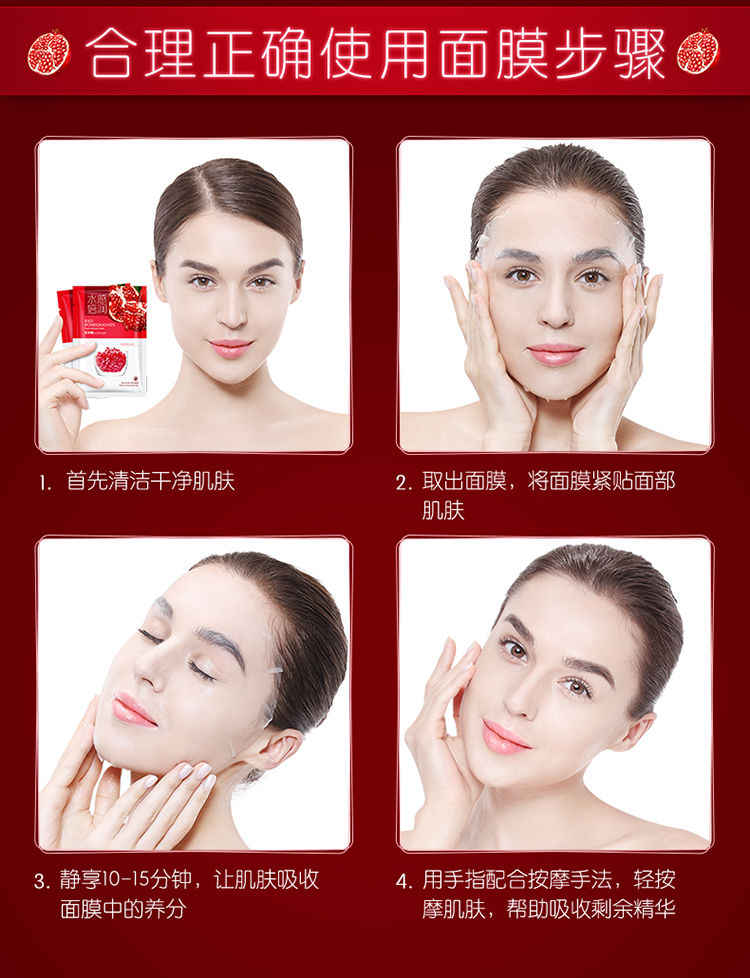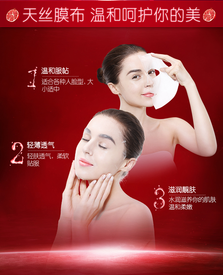 红石榴纯露爽肤面膜,补水保湿,清爽控油,滋润锁水,舒缓修护敏感肌肤,补充肌肤营养,收缩毛孔,弹力柔软纤维布,更加服帖,敷一敷会遇见更美丽的自己!