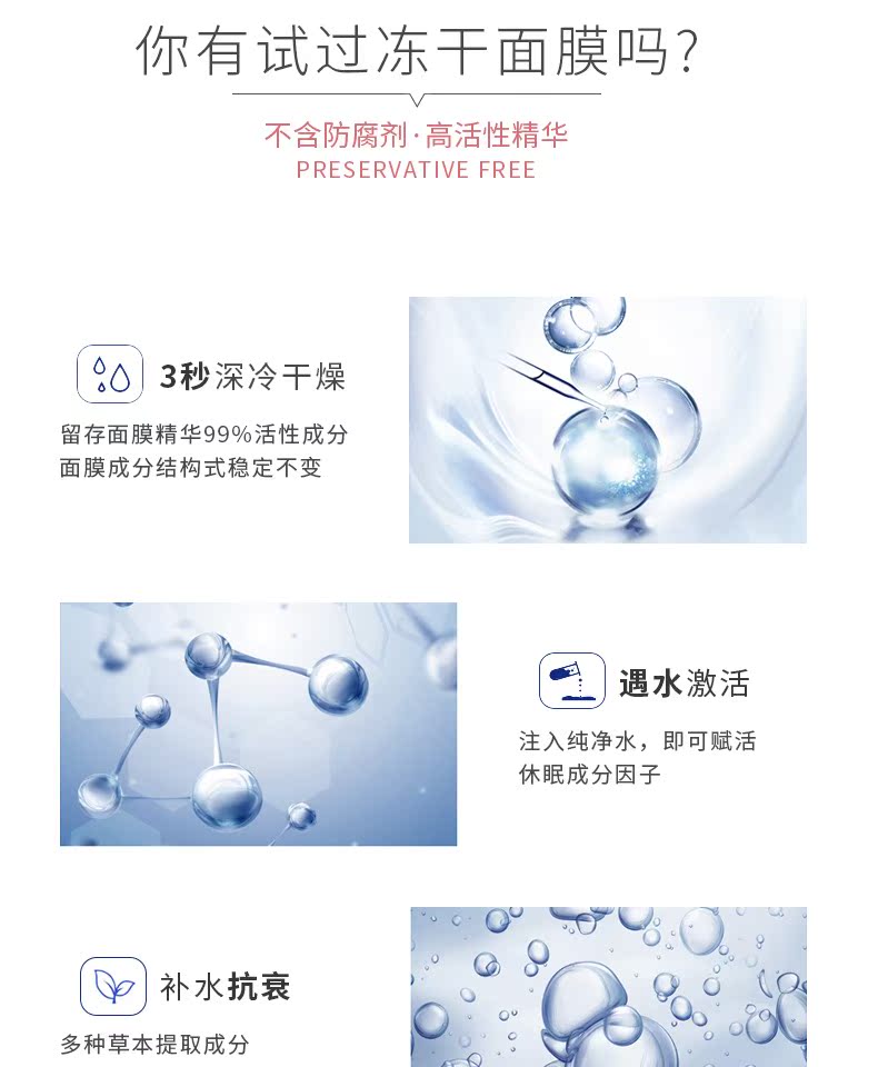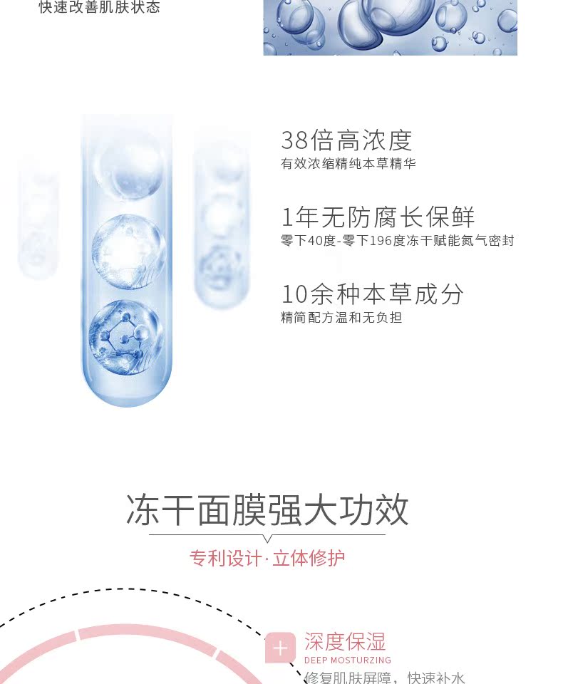 高科技冻干技术,把精华注入到膜布中,高效保存精华活性,深层锁水,紧致肌肤,缩小毛孔,安全更有效!正品保证~~~