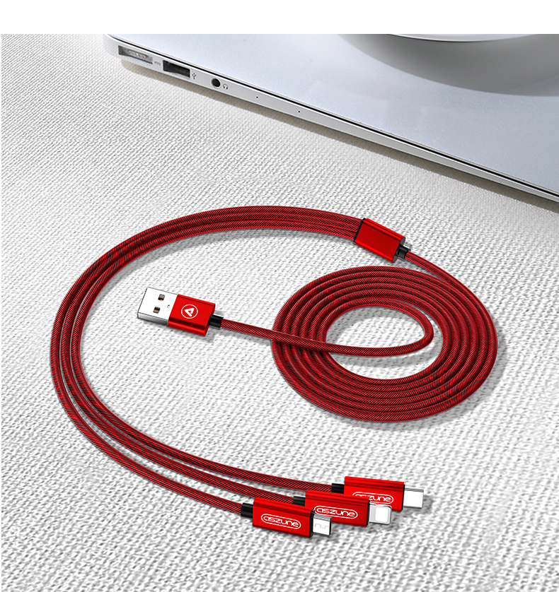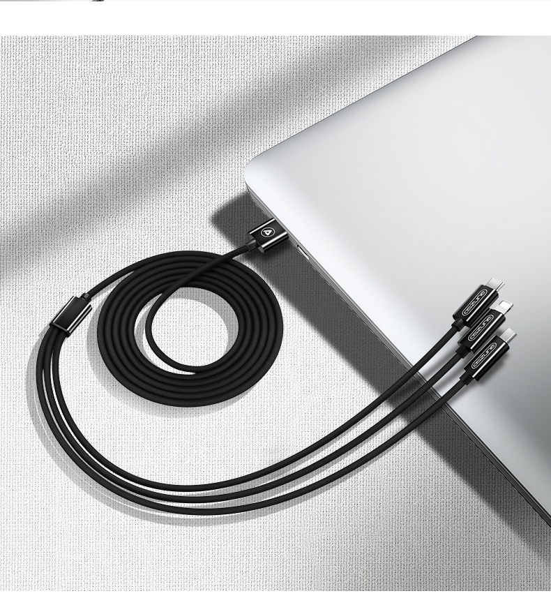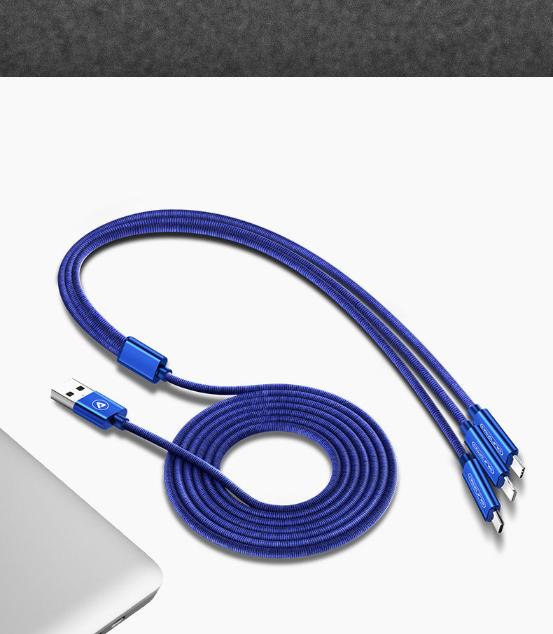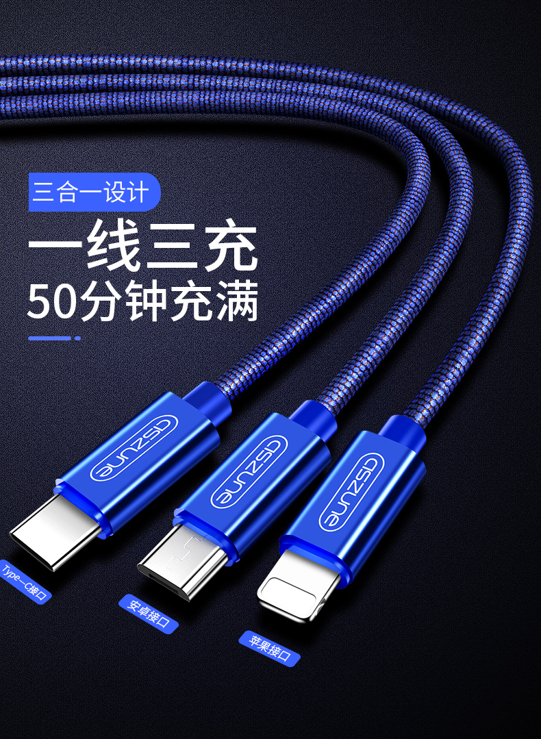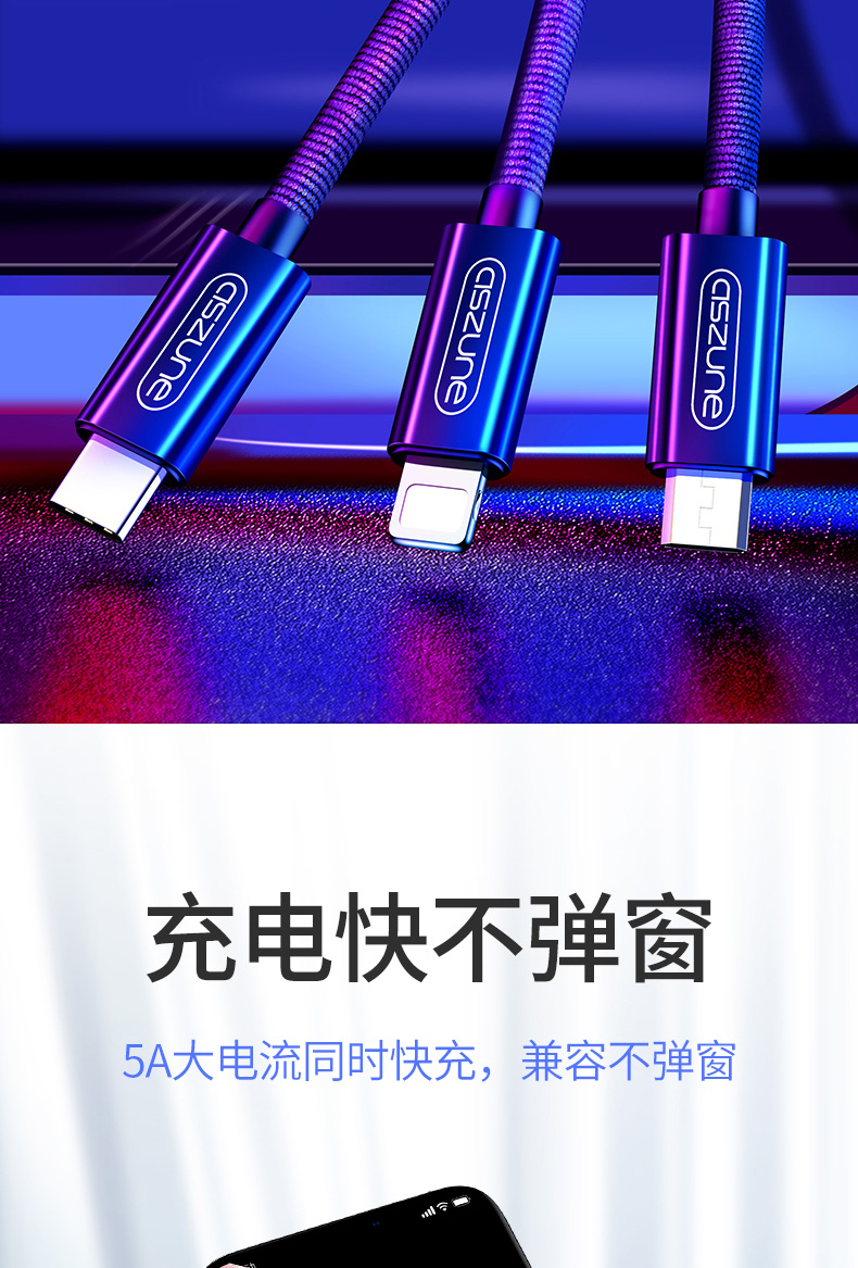一拖三数据线,安卓苹果type,安全便捷善于充电,亮丽如新不氧化,升级大改造不伤机,涓流充电不过充,超柔软线身不折断,快充设计,三个设备一线搞定!